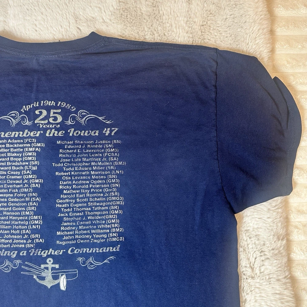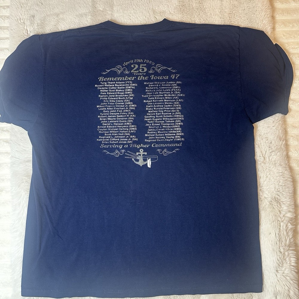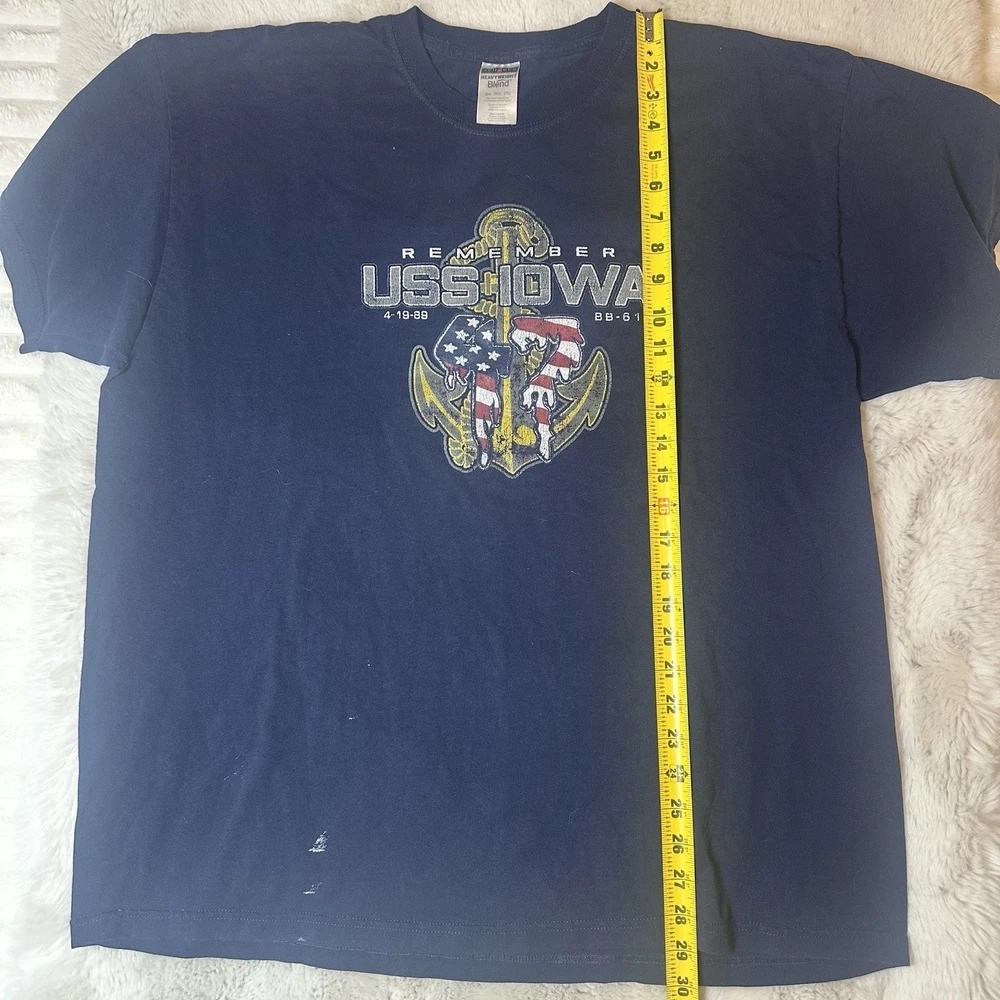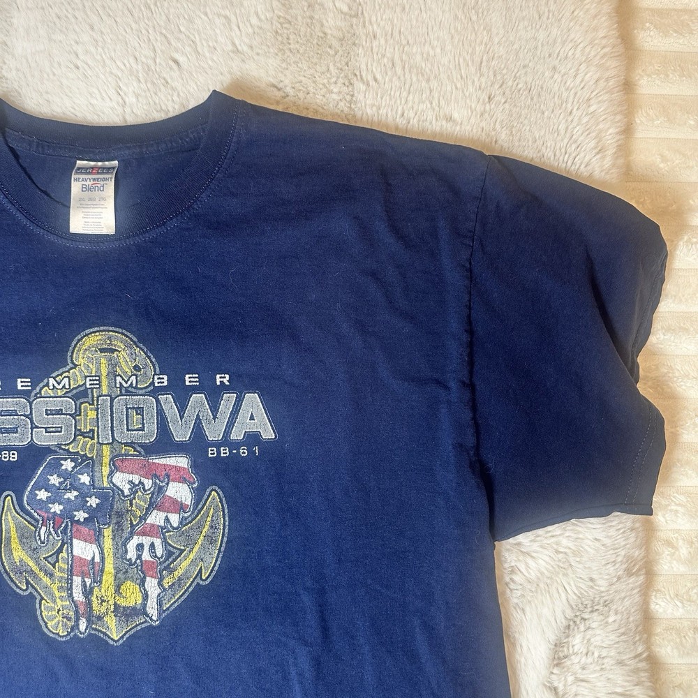 Vintage Jerzees USS Iowa (BB-61) memorial graphic T-shirt dated April 19, 1989 Size 2XL Size 2 XL Material Cotton Polyester Color Blue Condition Good Condition small stain of paint at the front bottom by the hip, check pictures Ref: 1639