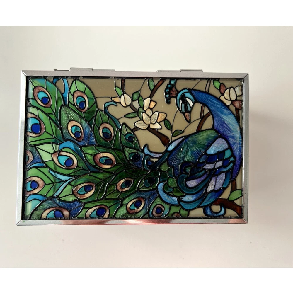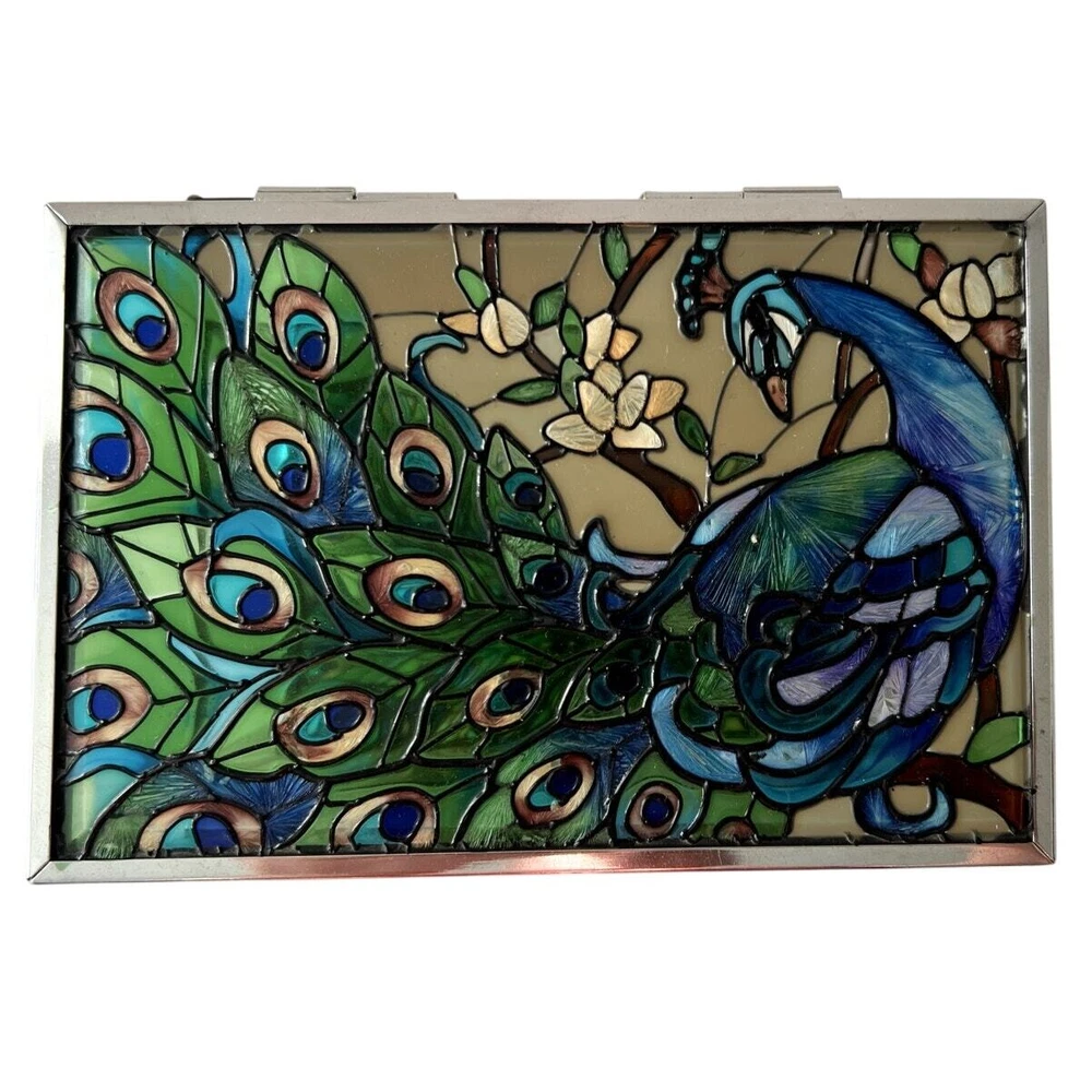 Hand painted. Like new. BLR 126 Peacock. Glass, metal and mirror base. 6" x 4" x 3".