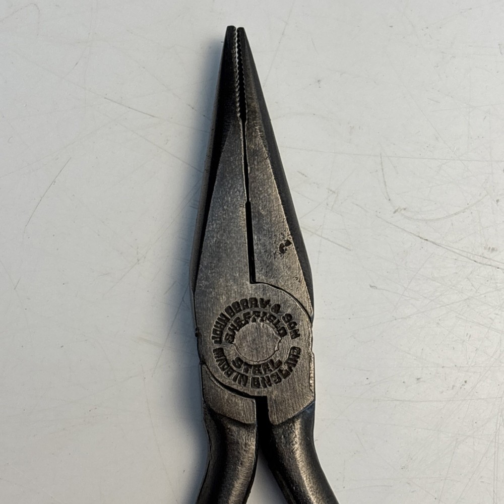 Vintage forged needle nose pliers made by John Berry & Son of Sheffield, England. Marked “Sheffield Steel” at the pivot. Solid all-steel construction with tapered jaws and integral handles. Measures approximately 5 1/2 inches overall. Traditional English-made hand tool with classic forged profile. Condition Vintage used condition. Surface wear, patina, and darkening consistent with age and use. No cracks or repairs observed. See photos for complete condition details.