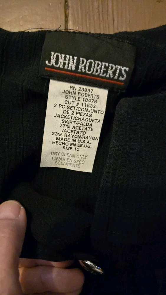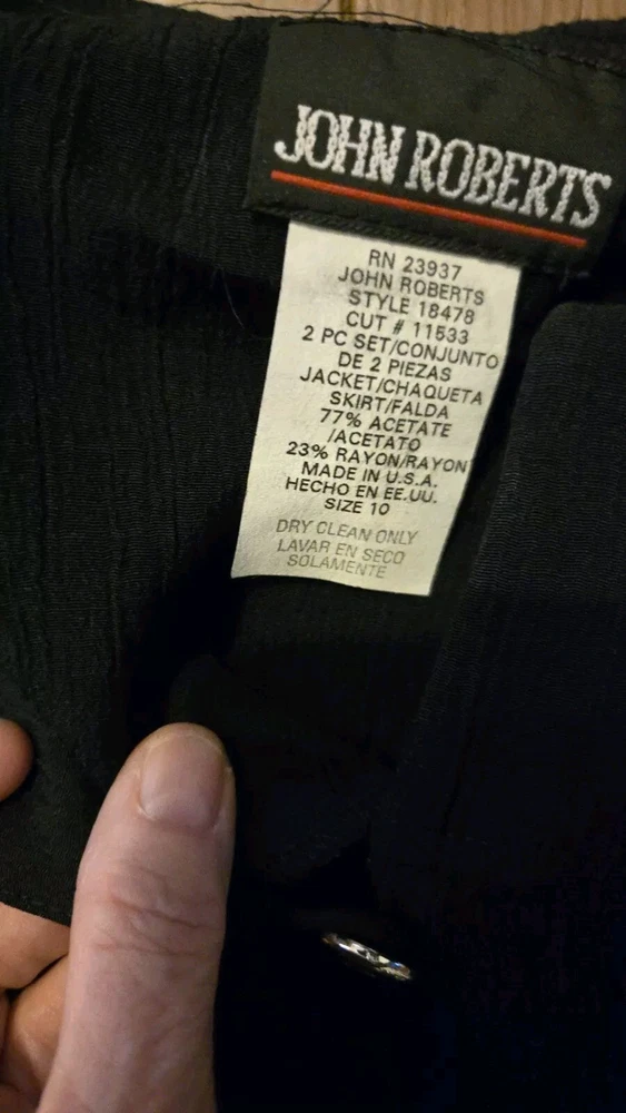 Vintage 80's John Roberts Shoulder Pads Black Skirt Set Paper Tags Non Iron Liquid Knit Size 10 77% Acetate 23% Rayon Made In USA