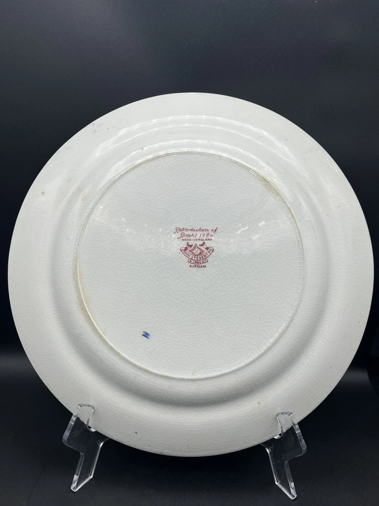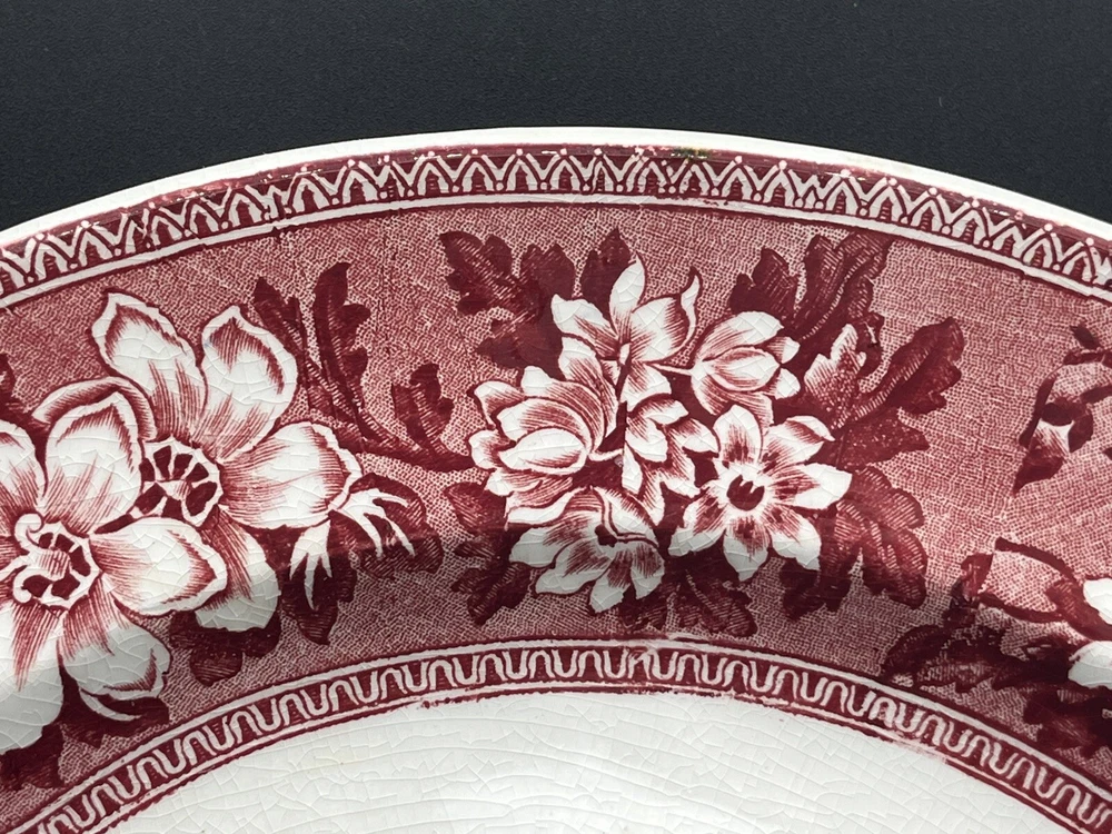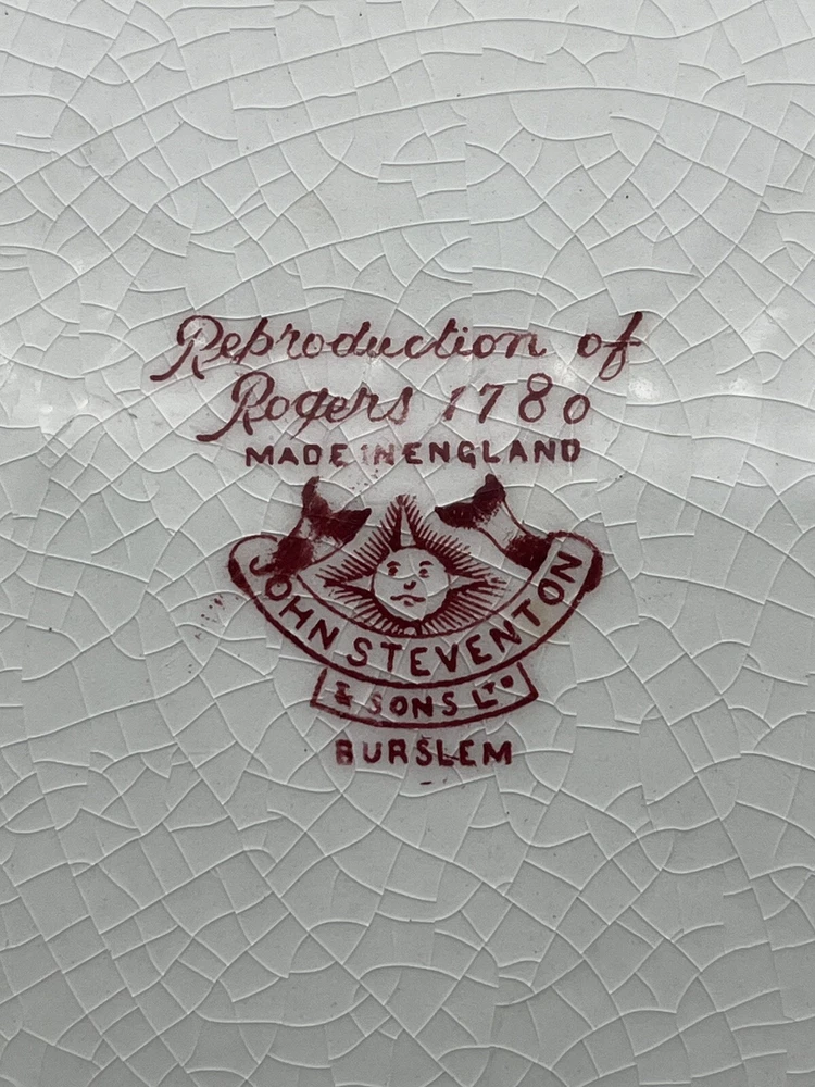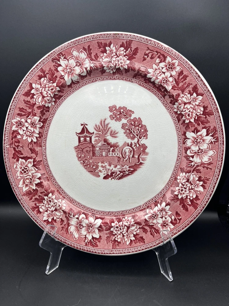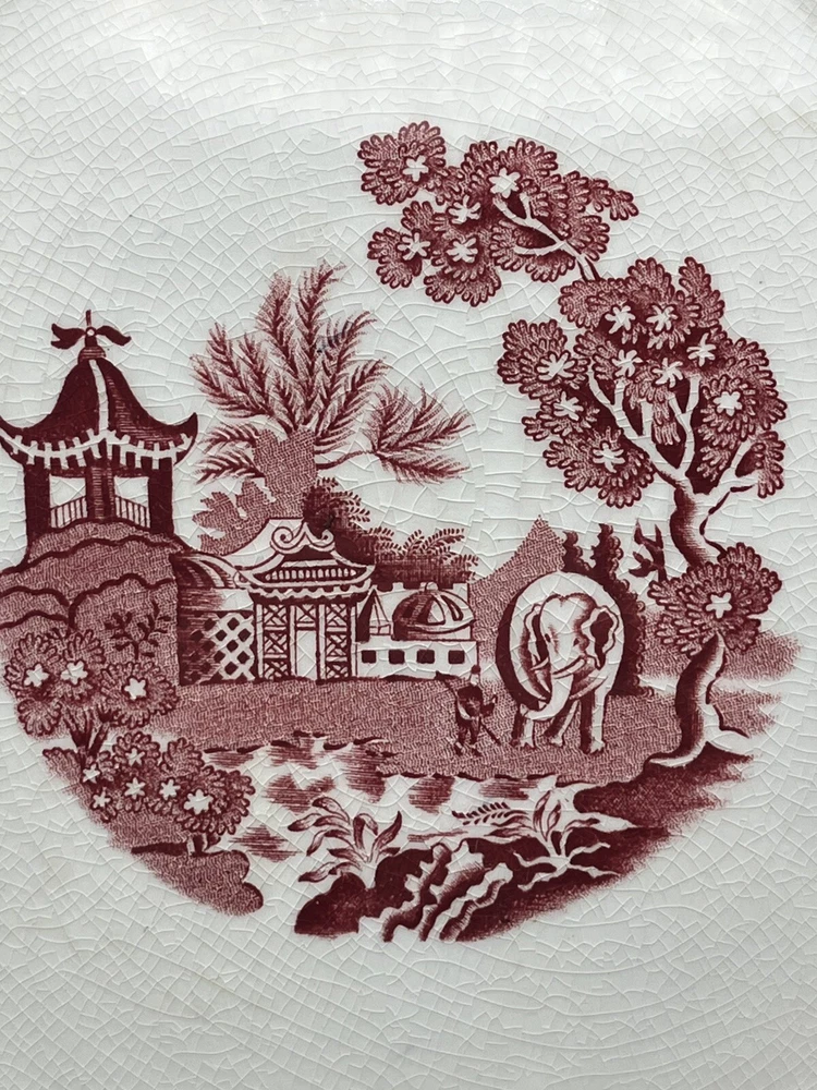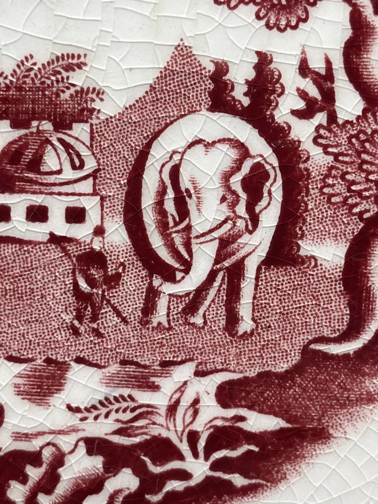 This vintage John Steventon platter originating from England features a red and pink transfer design of elephants on a round 13.25” stoneware surface. The platter is a licensed reproduction of Roger’s 1780 with a decorative all-over pattern, making it a unique and eye-catching piece for display or serving. The brand, John Steventon, is known for its production style of transferware, showcasing intricate animal-themed designs on pottery items like this elephant-themed platter.