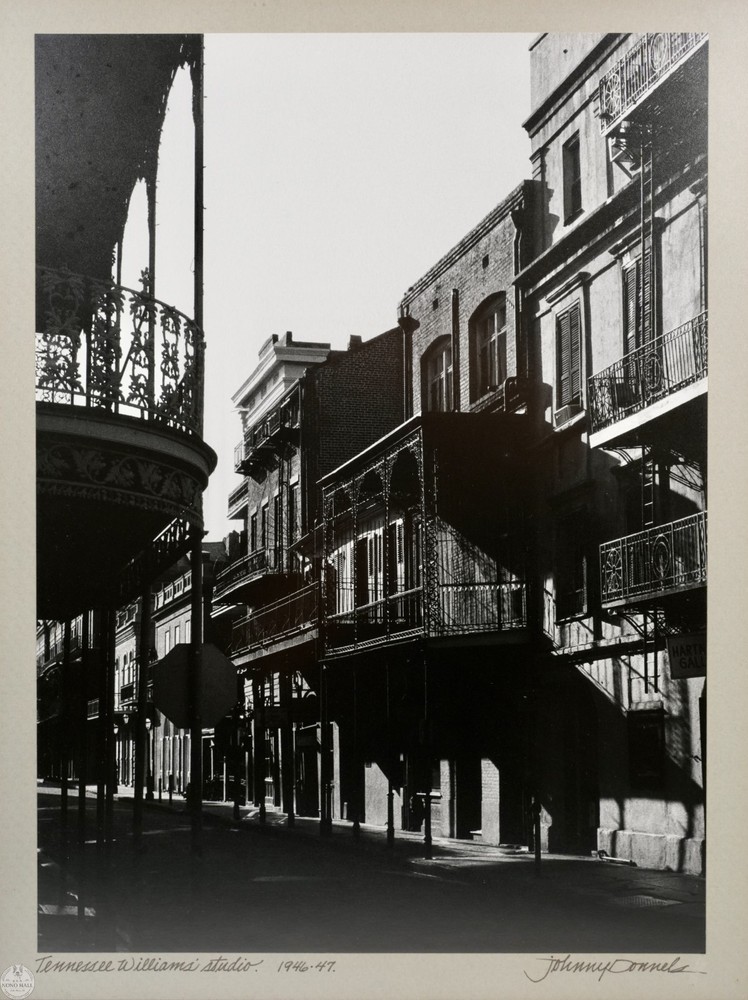 The Vintage Framed Original Gelatin Silver Photographic Print "Tennessee Williams' Studio", Signed in Graphite By Photographer Johnny Donnels ( American, 1924-2009 ) in Lower Right. It Captures the Quiet Architectural Poetry of New Orleans' French Quarter in the Immediate Postwar Year. Identified By the Artist As "Tennessee Williams' Studio", the Image Documents the Atmospheric Streetscape Associated with the Early Creative Life of the Celebrated American Playwright. Donnel's Refined Composition Highlights Wrought Iron Balconies, Layered Facades, and Dramatic Shadows Stretching Across the Street. The Absence of Figures Enhances the Contemplative Mood, Allowing Architectural Rhythm and Light to Define the Scene. Rich Tonal Contrast and Subtle Gradations are Characteristic of Period Silver Printing and Underscore the Photographic Print's Mid Century Sensibility. The Photographic Print Shows Minor Toning, and Wear on the Frame Consistent with Age, In Good Condition. Title: "Tennessee Williams' Studio" Artist: Johnny Donnels ( American, 1924-2009 ) Time Period: 1980s Medium: Gelatin Silver Photographic Print Condition: Good Condition Frame Size: 21" By 17" Sight Size: 13" By 9-3/4" Available For Domestic Shipping and International Shipping. Thanks!
