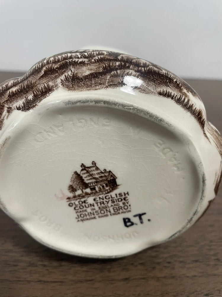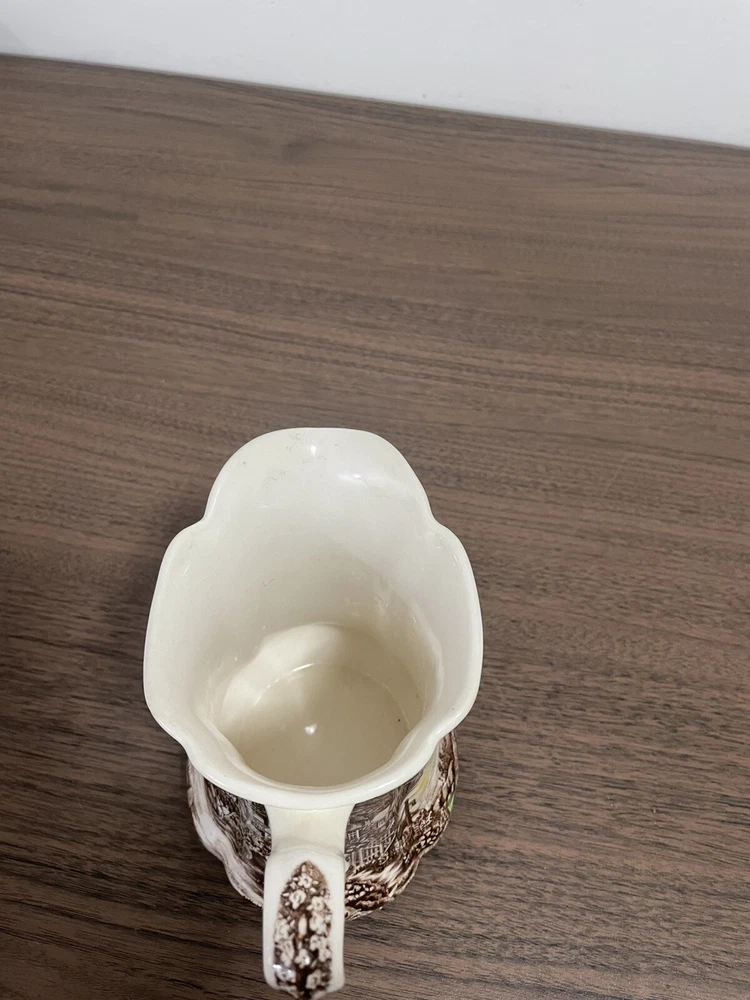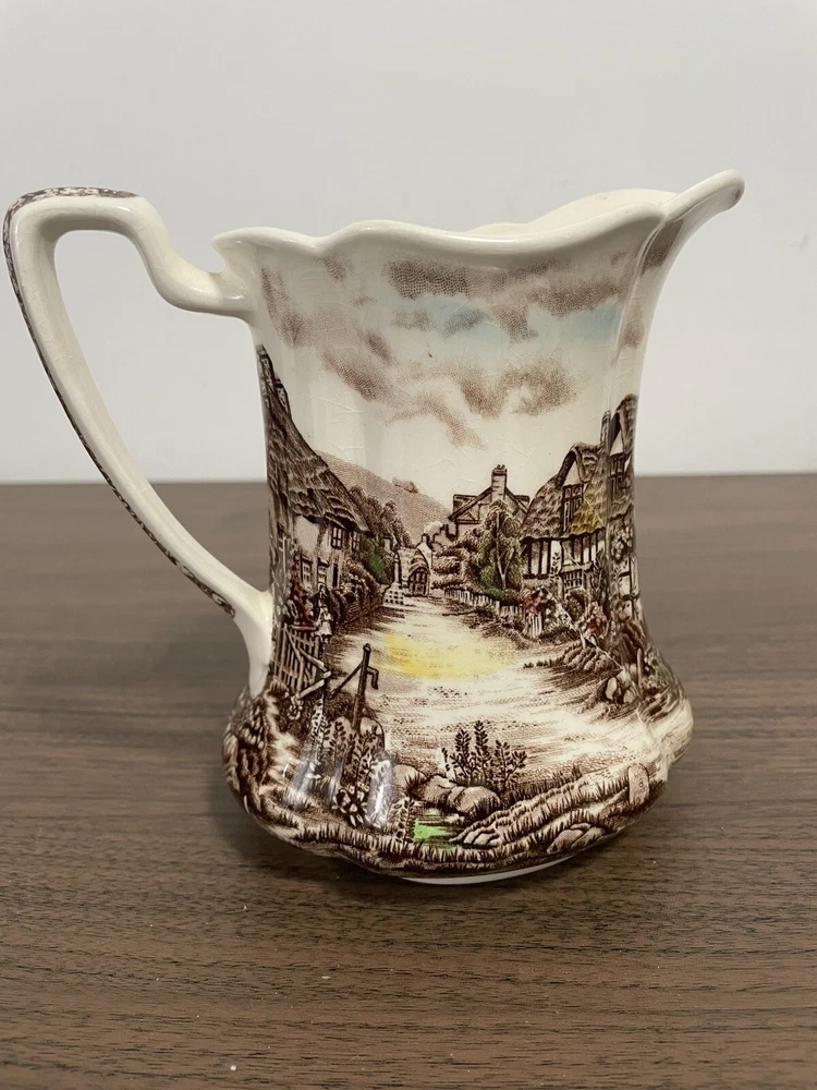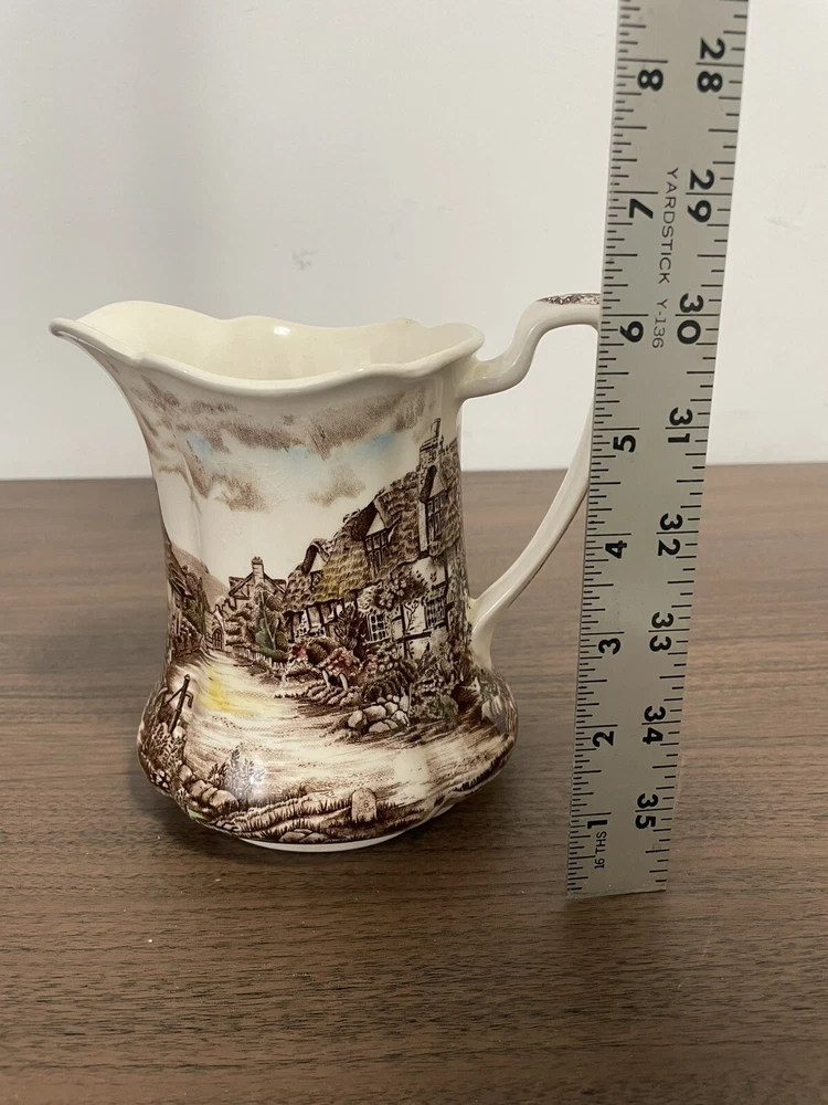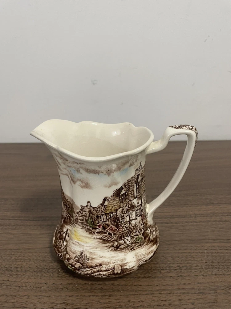 This vintage Johnson Brothers pitcher from England features a Olde English Countryside pattern in a multicolor design. Made of porcelain and ironware, this 24oz pitcher showcases a Village Life and Countryside theme with a glossy finish. It is part of the Countryside product line and is studio crafted in an Art Pottery style. The backstamp is printed on the pitcher.
