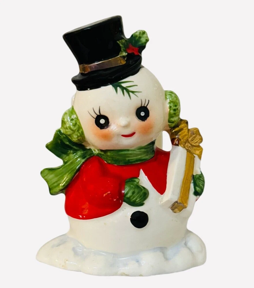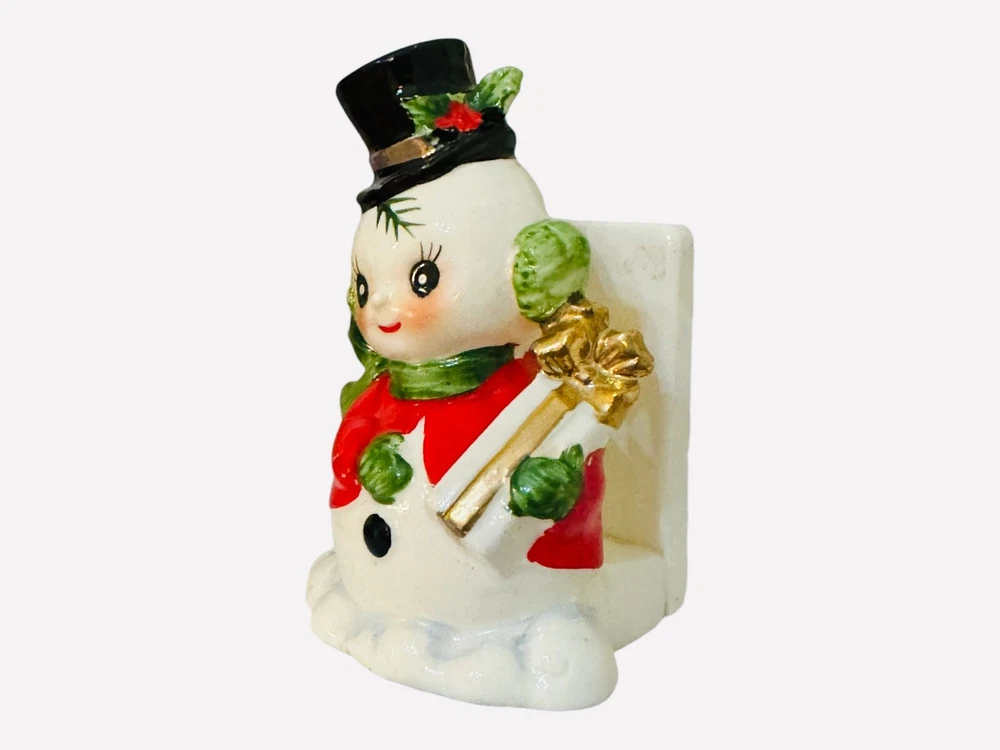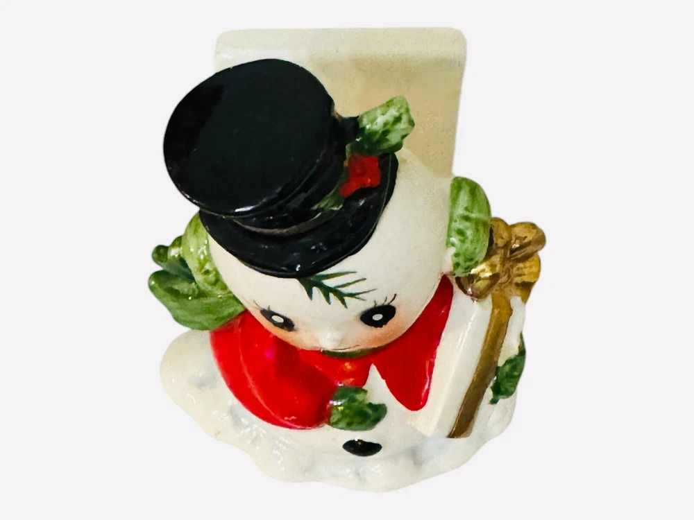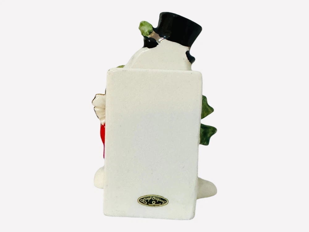 This charming little fellow is sure to warm your heart! His sweet face, with those iconic coal-black eyes, long lashes, and rosy cheeks, radiates joy. He wears a festive black hat decorated with holly berries and holiday greenery, along with a vibrant red coat, pine green scarf, earmuffs, and matching mittens. In his hands, he holds a beautifully wrapped Christmas present, complete with a gold bow, while standing on a snow drift. Standing approximately 4 ½” inches tall, this vintage piece is in excellent condition with no chips or cracks. There is only minimal age-related wear, including a few tiny specks of paint wear on his wrist, coat, and hat (glares are from the camera). He retains his original black Josef Originals and Japan tag, adding to his collectible charm. The snowmen made by Josef Originals have got to be some of the cutest!!