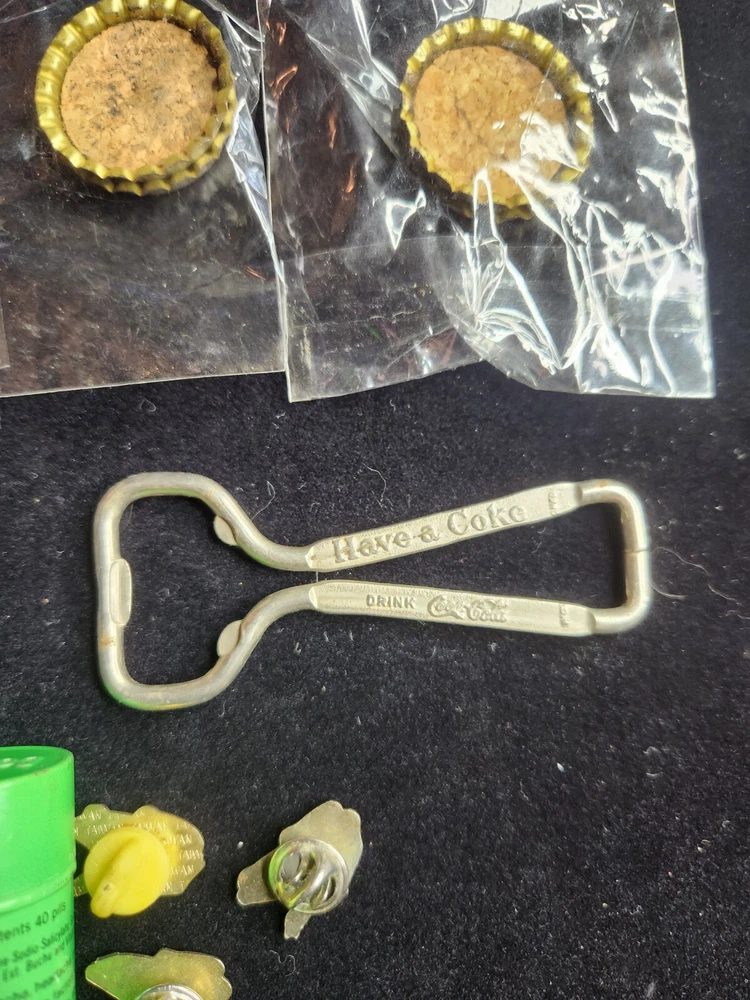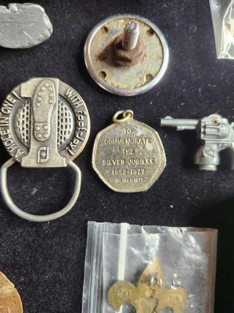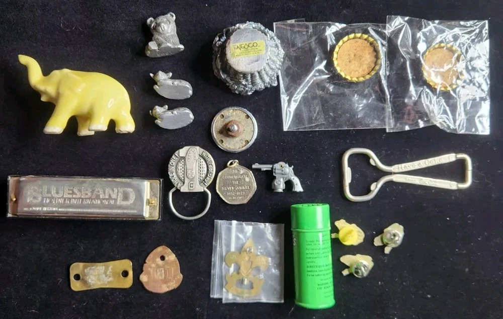 This vintage junk drawer lot includes items related to Silver Jubilee, Hohner, BSA, an 1883 dog tag, a vintage "trunk up" elephant, purported to bring good luck, a vintage Coca Cola bottle opener, etc. The collection consists of 20 items with a variety of unique pieces for collectors. Condition varies between pieces, as shown in pictures. See pictures for condition. LOT 7