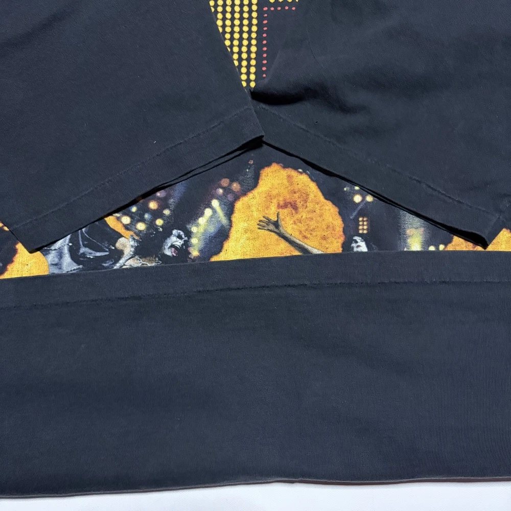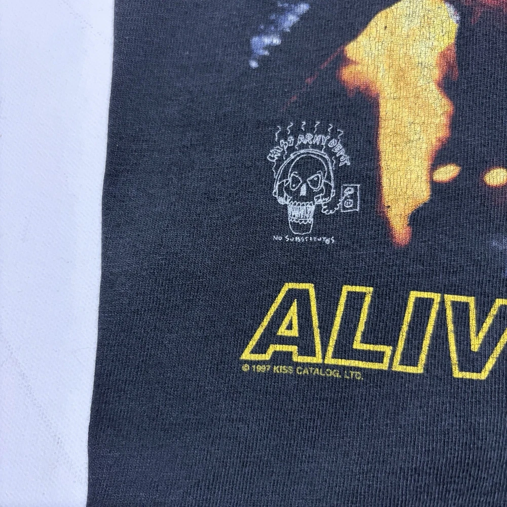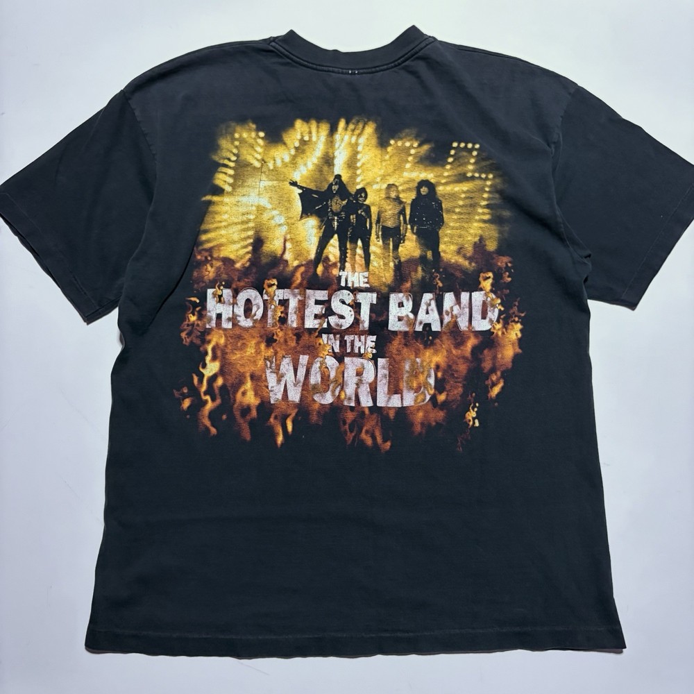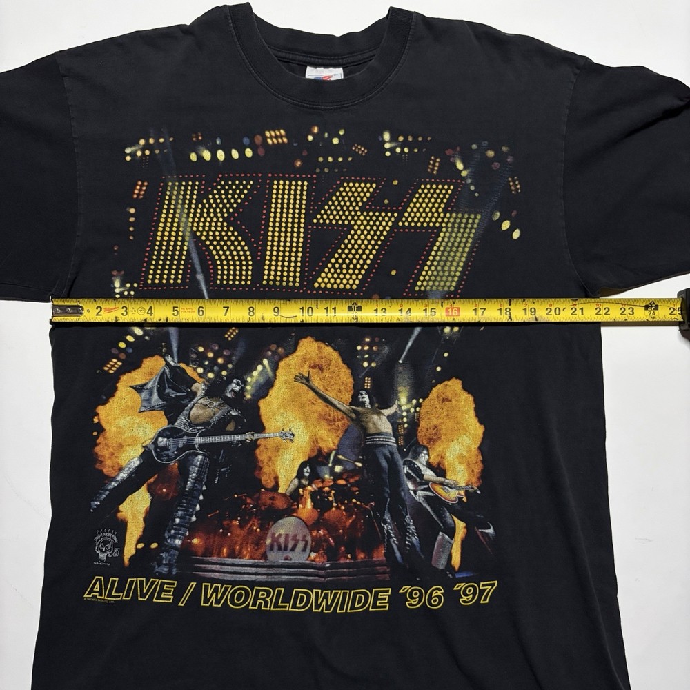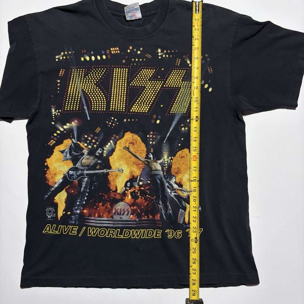 Authentic KISS “Alive / Worldwide ’96–’97” tour t-shirt featuring bold front and back graphics. Front graphic shows the band live on stage with pyrotechnics. Back reads “The Hottest Band in the World.” A must-have for KISS fans and vintage band tee collectors. Details: • Size: Men’s XL • Color: Black • Tour: Alive / Worldwide 1996–1997 • Front & back graphics • Short sleeve, crew neck