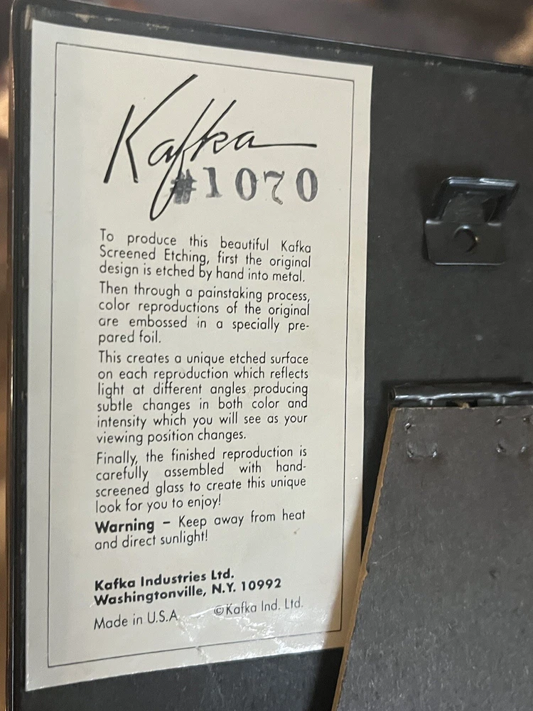 Orientation:VerticalEra:Late 20th Century (1970-1999)Item Length:6 inCustom Bundle:NoItem Weight:1 lbArtist:KafkaCustomized:NoTheme:Art and BeautyPersonalization Instructions:Non-PersonalizedVintage:YesType:Screened Etchings in Hand-Screened GlassStyle:Etchings in Hand-Screened GlassSize:MediumModel:EtchingsCountry/Region of Manufacture:United StatesPersonalize:NoColor:MulticolorCharacter Family:Botanicals and Insectsgtin13:Does not applyOrigin:AmericasUPC:Does not applyBrand:KafkaCharacter:Botanicals and ButterfliesSubject:Botanicals and InsectsCare Instructions:Clean with Damp Cloth, Easy CareAdditional Parts Required:NoDepartment:AdultsItem Width:6 in.MPN:N/AFeatures:3D Effect, Decorative, Etched, Framed, Multi-Part, Ready To Hang, VintageOriginal/Reproduction:OriginalRoom:Any RoomProduct Line:Kafka Industries, Ltd.Item Height:6 in.Material:Metal, Foil and Glass