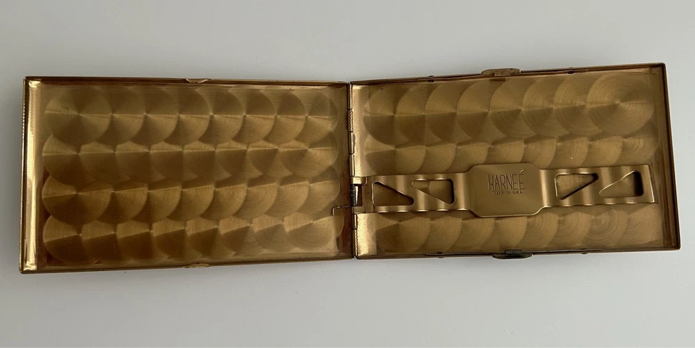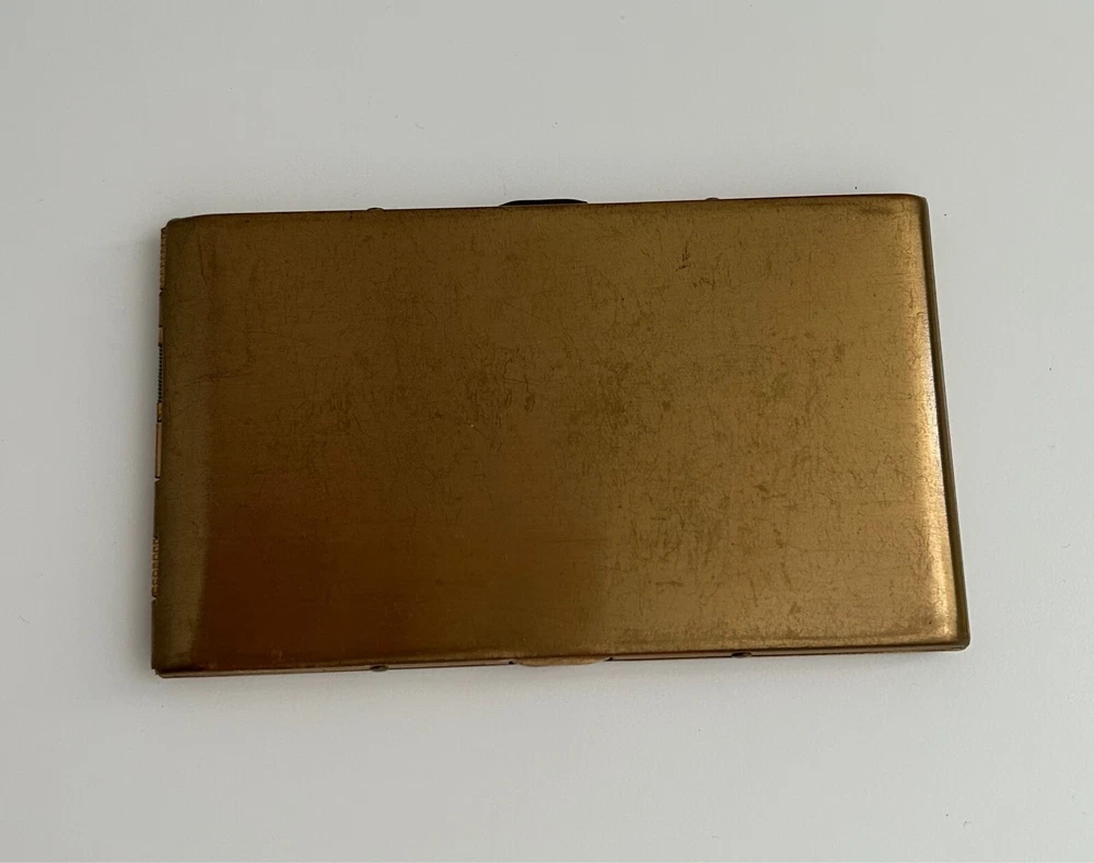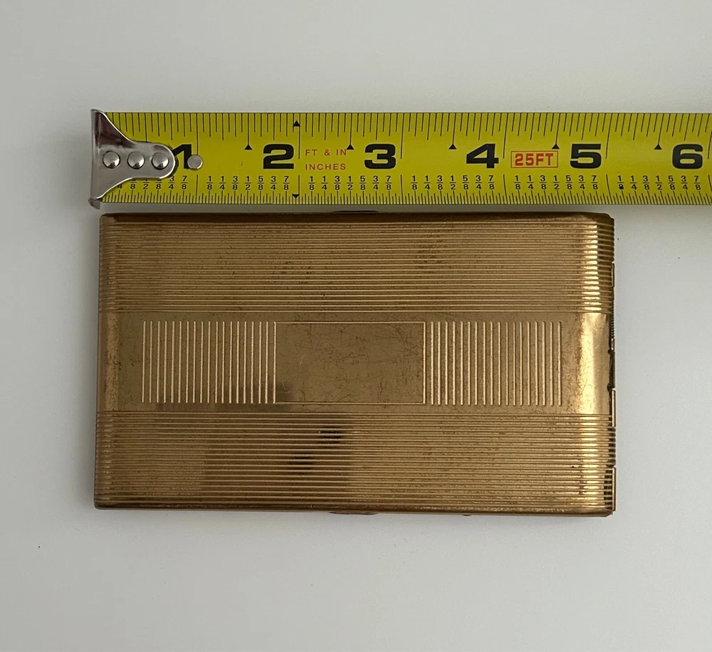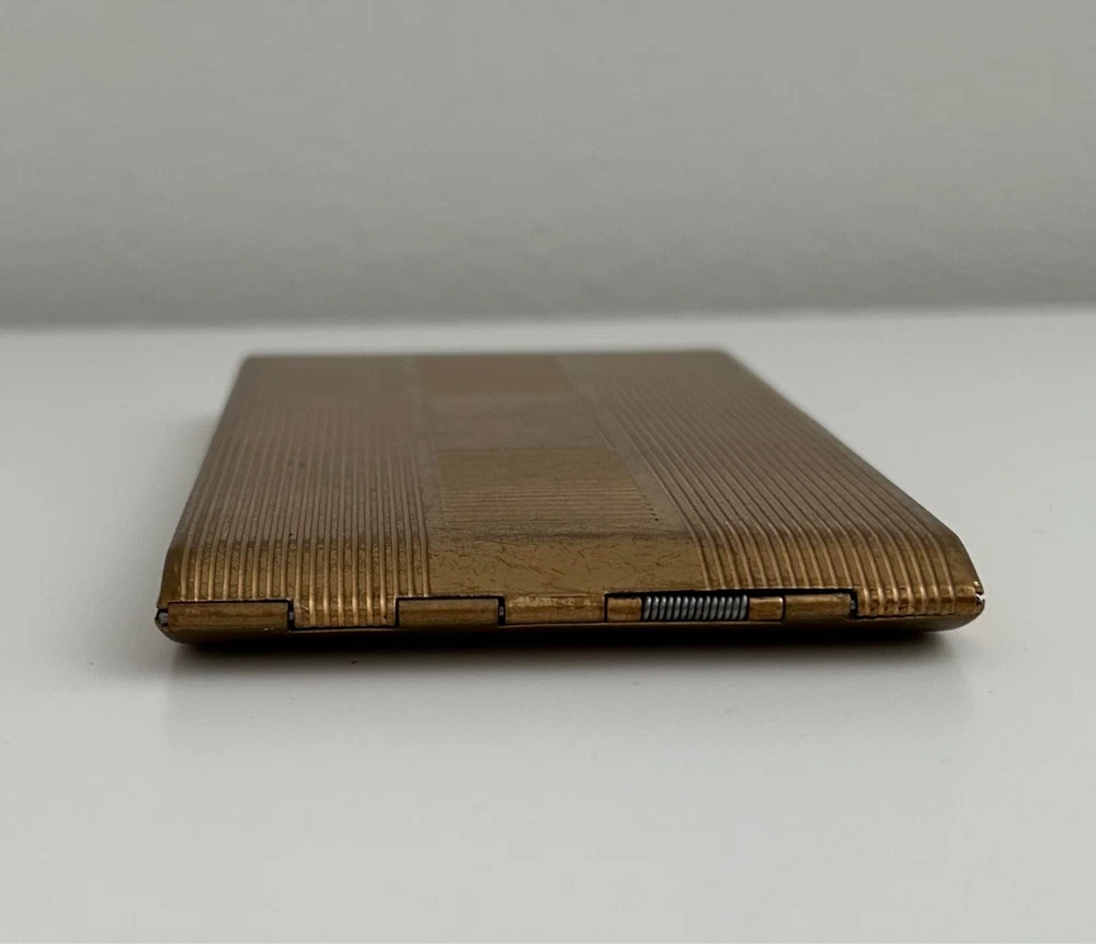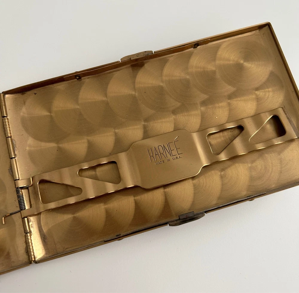 Vintage Karnee Metal Brass Compact Art Deco Cigarette Case Etched Design The case is gold-toned metal with a cool art deco style designe. It measures approximately 5" x 3". The case is in good used condition with minor wear. There are some light scratches on both the inside and outside. See photos for more details.