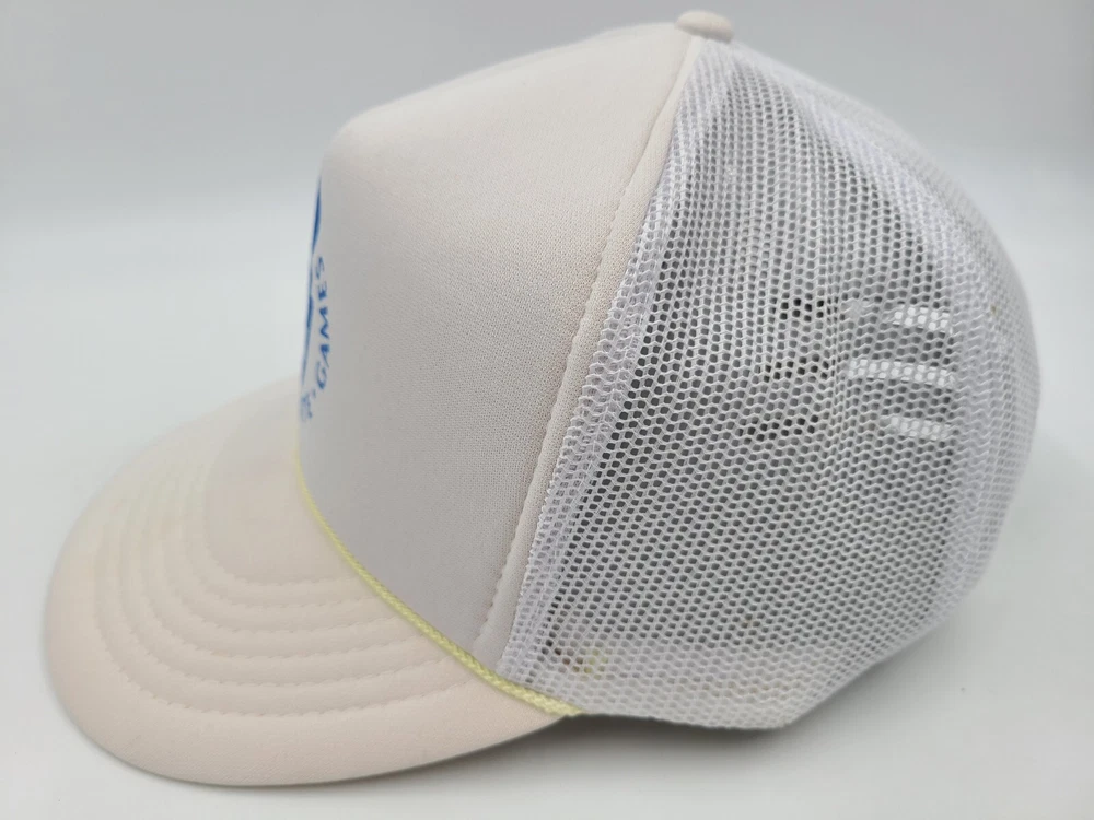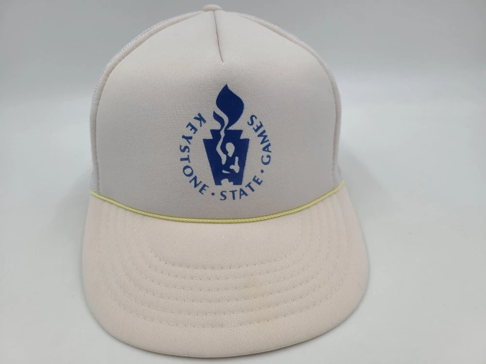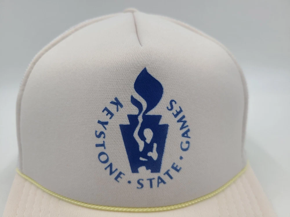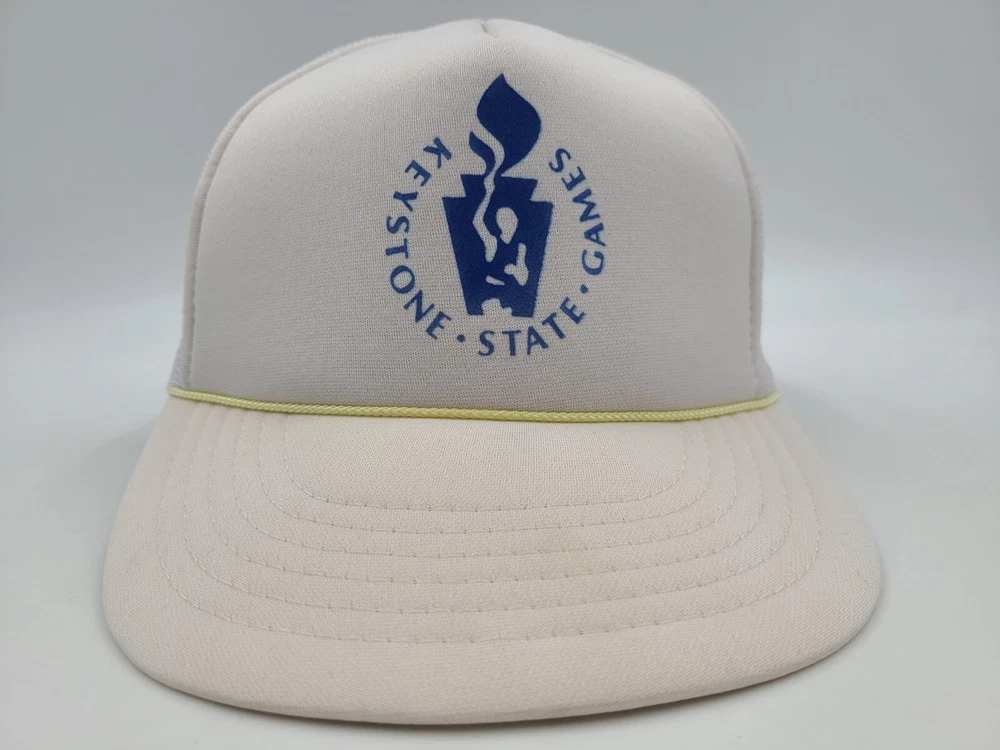 Has some stains on the brim, side, and back as seen in photos. Vintage Keystone State Games Mesh Trucker Snapback Hat Cap Pennsylvania White. EACH ADDITIONAL HAT PURCHASED IS ONLY $1 ADDED SHIPPING!