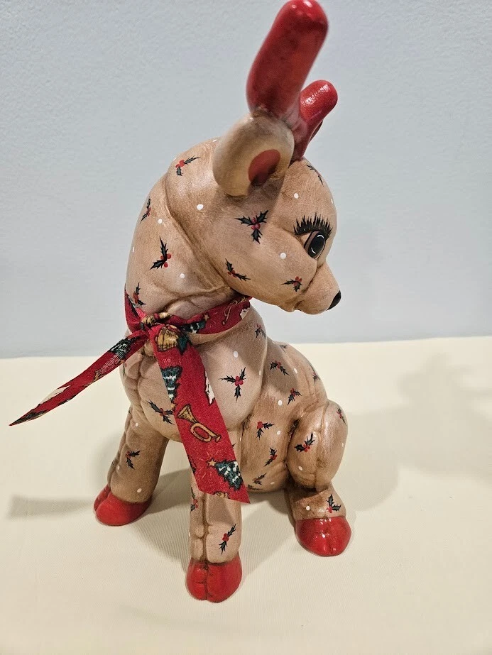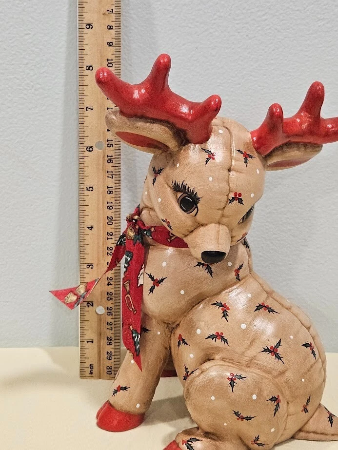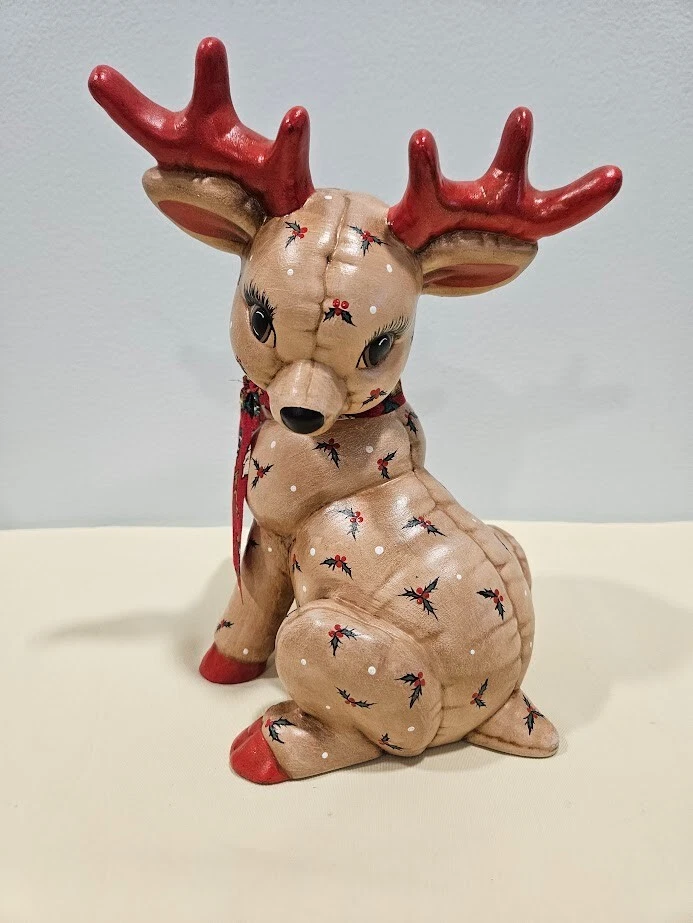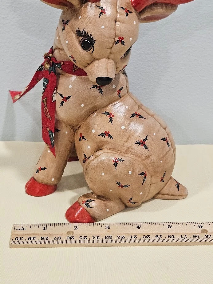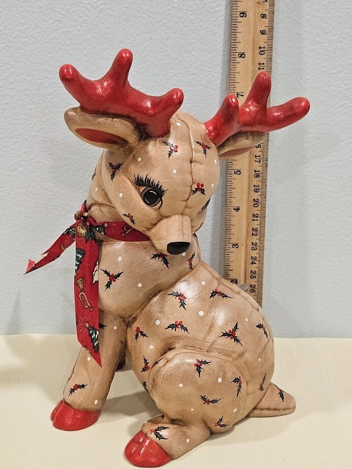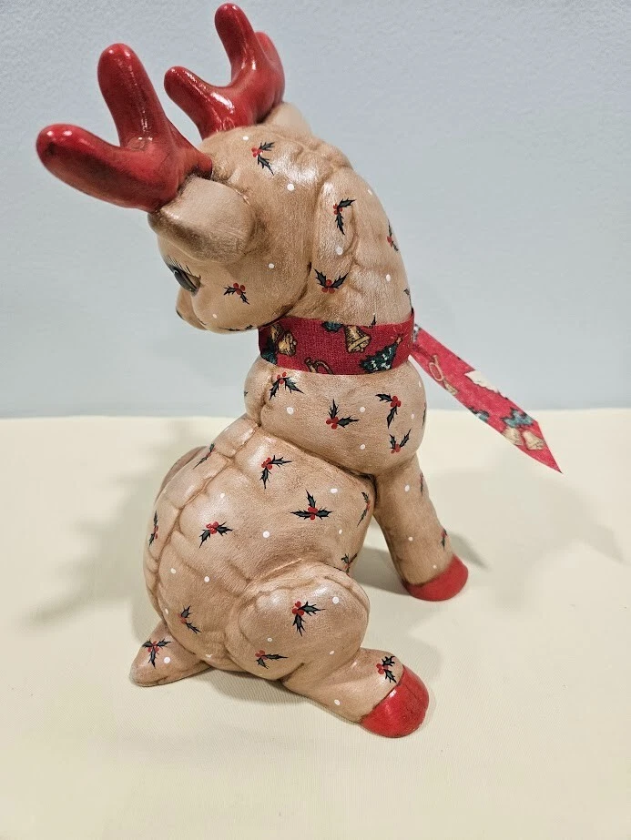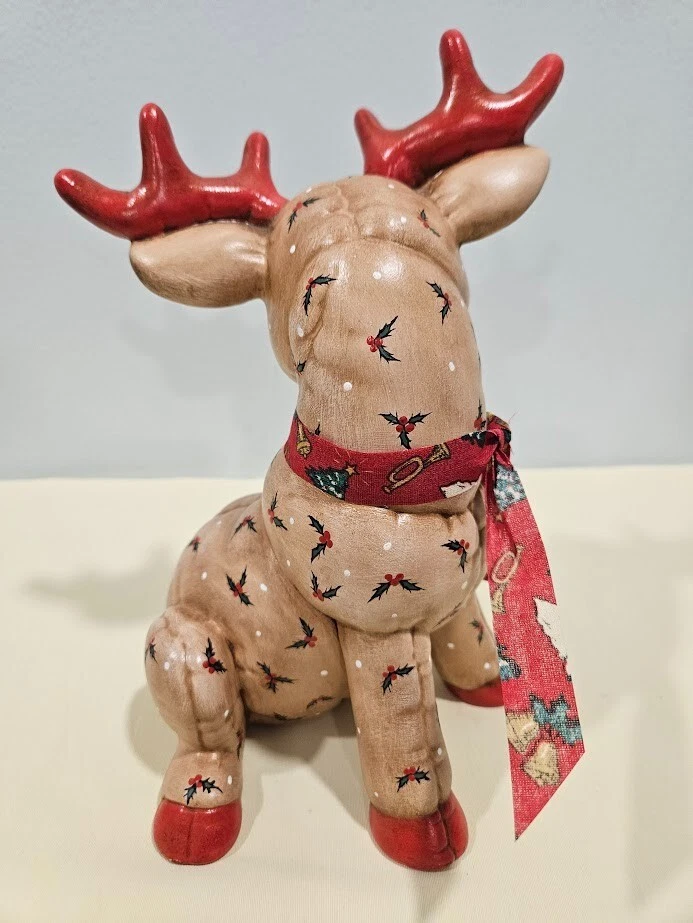 Occasion: Christmas Type: Figurine File number: 24-09-379 Size: Medium Department: Adults Color: Multicolor Pattern: Quilted Signed: No Theme: Christmas Reindeers Time Period Manufactured: 1980-1989 Collection: Santas Reindeers Character Family: Christmas Material: Ceramic Features: Indoor Handmade: Yes Finish: Matte Year Manufactured: 1988 Item Height: 8 Item Length: 6.75 in Character: Reindeer Era: Late 20th Century (1970-1999) Country/Region of Manufacture: United States Original/Reproduction: Original Subject: Reindeer Style: 1980s Brand: Kimple Mold Number in Pack: 1