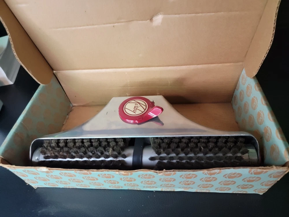 This vintage Kirby motor-driven floor polisher head is a must-have for collectors and enthusiasts of kitchen and home appliances. Made in the United States and still in its original box with a belt included, this attachment is designed for use with Kirby vacuum cleaners and is perfect for those looking to add to their collection of major appliances. The polisher head is in excellent condition and has been well-maintained over the years. With its brand, type, and model all clearly labeled, this attachment is a rare find and sure to be a valuable addition to any collection. Don't miss out on the opportunity to own this unique piece of kitchen and home history.