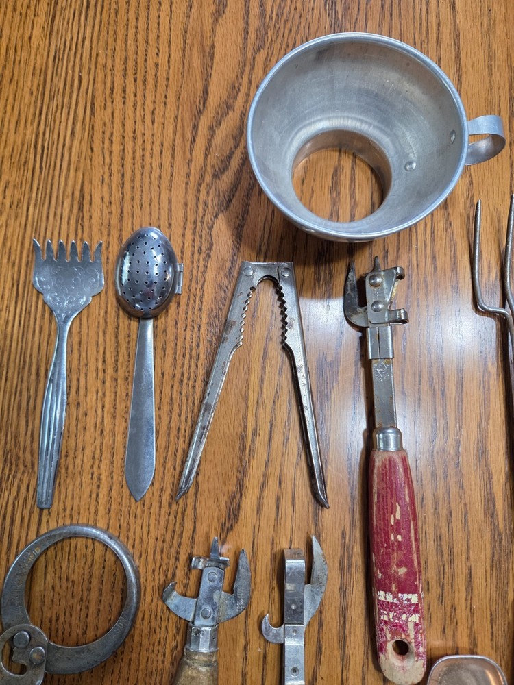 A vintage lot of 14 pcs. A variety of can openers, pasta cutter, melon baller, knife sharpener, canning funnel, nut cracker, tea infuser, sardine fork. Some of the paint is coming off of the wooden handles.