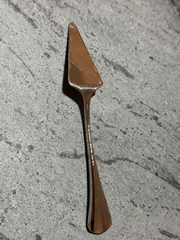 This vintage butter/cheese/dessert knife from Korea is made of silverplate. It is specifically designed for spreading butter, cutting cheese, or serving desserts. With its elegant design and historical value as an antique piece, this silverplate knife adds a touch of sophistication to any dining setting. Perfect for those who appreciate unique and vintage flatware pieces, this butter knife embodies both functionality and charm.