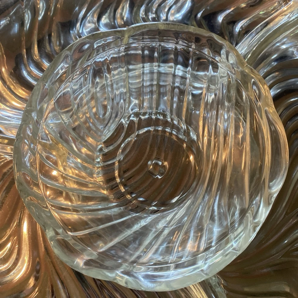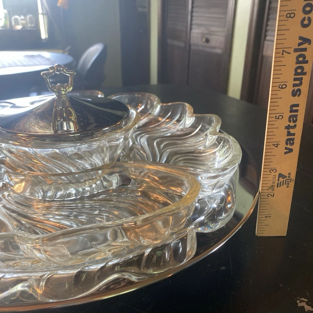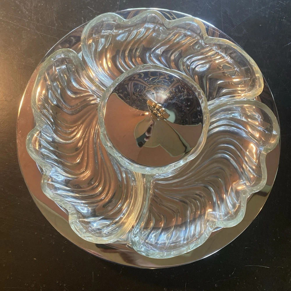 In excellent condition. New open box. 1950s Lazy Susan. Metal Lazy Susan with three thick glass compartments and one center glass bowl with metal lid. All measurements are in pictures. Ships the next business day after payment😊