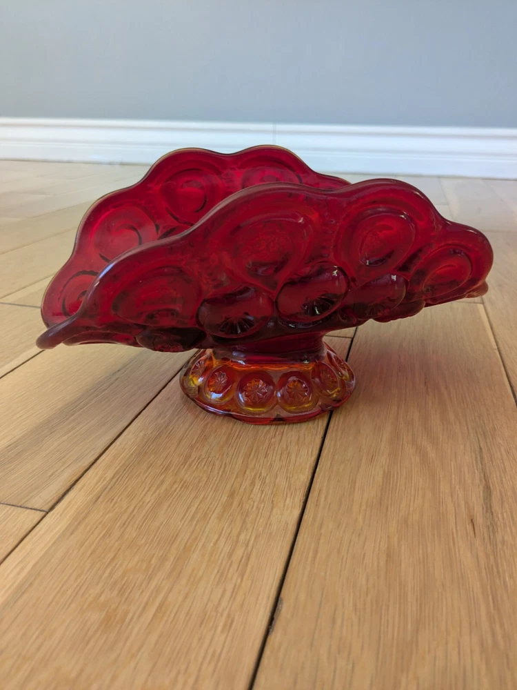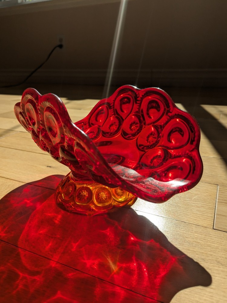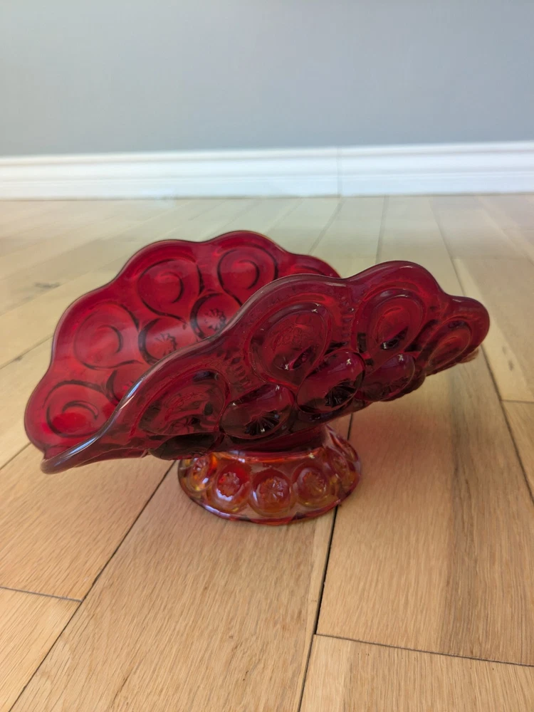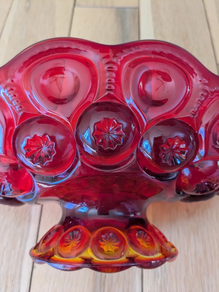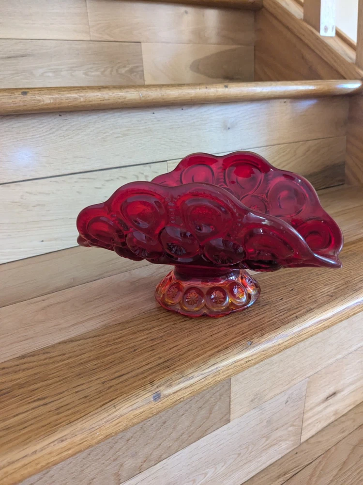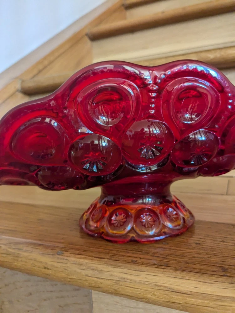 Abstract L E Smith Moon & Star Amberina Banana Boat Intricate Red Hand blown Glass 9x6x5". Stunning Contemporary Art! This stunning sculpture by L.E. Smith features a half-moon shape and is made of beautiful red hand-blown glass. The intricate moon and star design adds a touch of abstract contemporary art to any home décor. Measuring 9x6x5 inches, this medium-sized piece is perfect for any living space. The glossy finish adds a touch of elegance and the glassmaking technique ensures a unique and high-quality product. This sculpture is perfect for anyone who loves moon and star-themed décor and wants to add a beautiful piece to their collection.