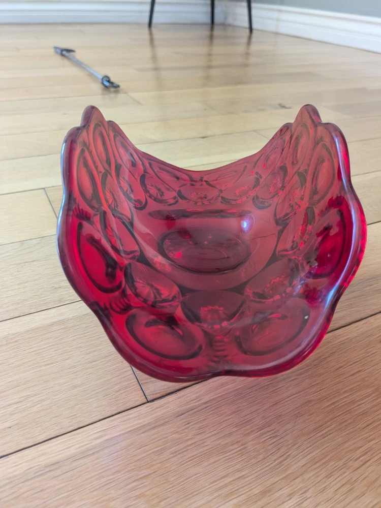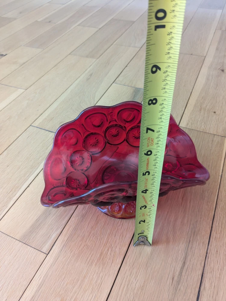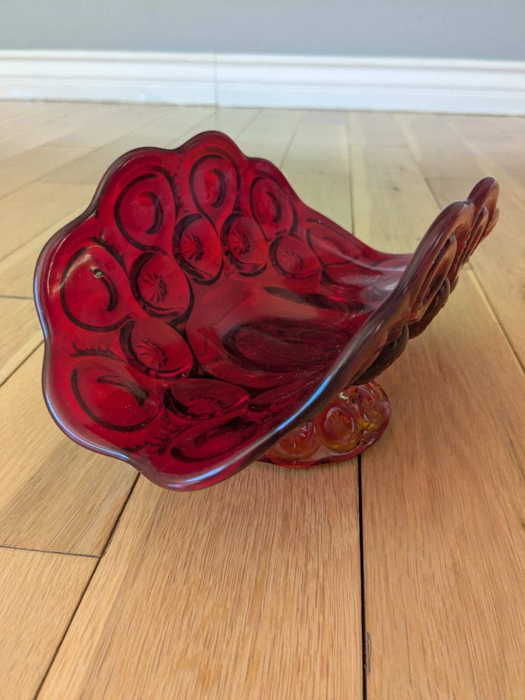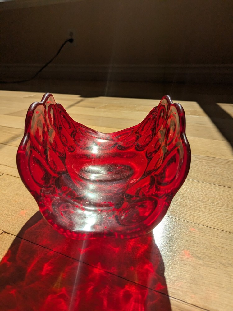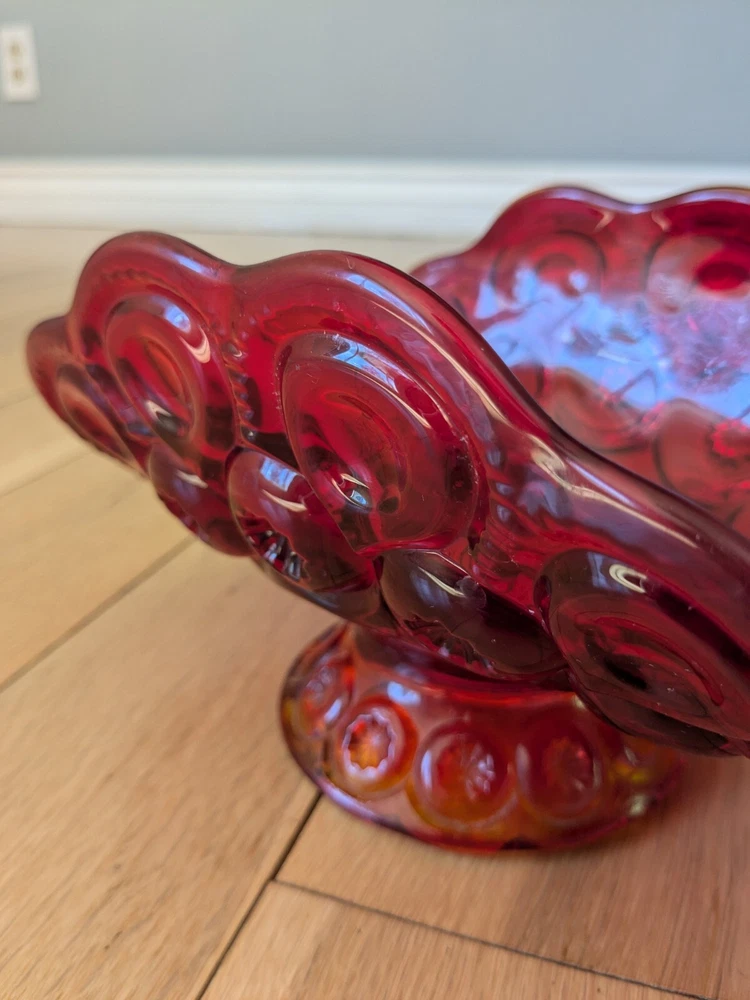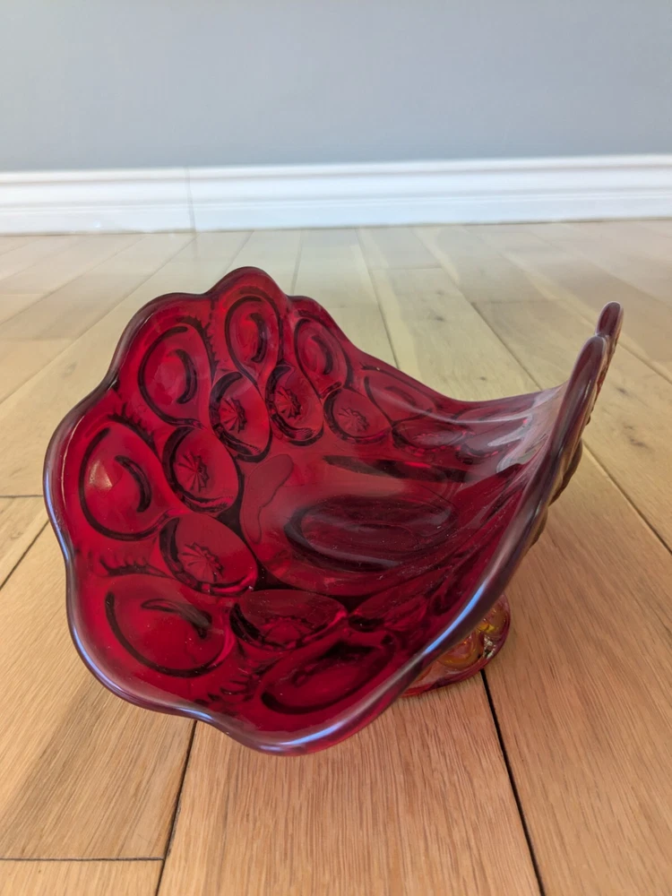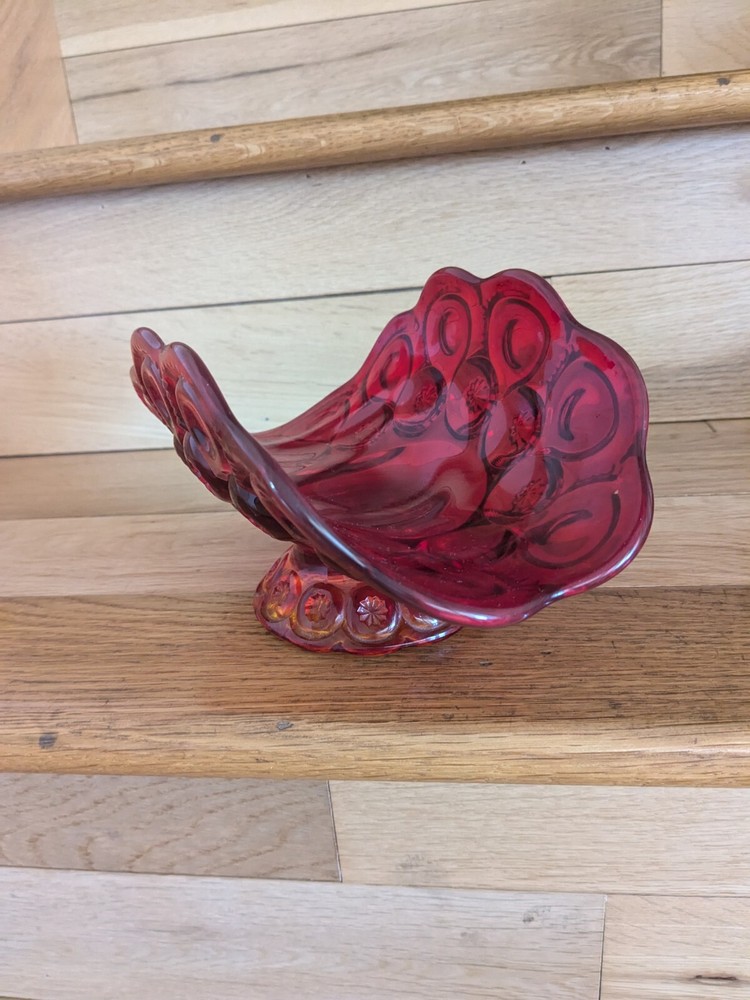 Abstract L E Smith Moon & Star Amberina Banana Boat Intricate Red Hand blown Glass 9x6x5". Stunning Contemporary Art! This stunning sculpture by L.E. Smith features a half-moon shape and is made of beautiful red hand-blown glass. The intricate moon and star design adds a touch of abstract contemporary art to any home décor. Measuring 9x6x5 inches, this medium-sized piece is perfect for any living space. The glossy finish adds a touch of elegance and the glassmaking technique ensures a unique and high-quality product. This sculpture is perfect for anyone who loves moon and star-themed décor and wants to add a beautiful piece to their collection.