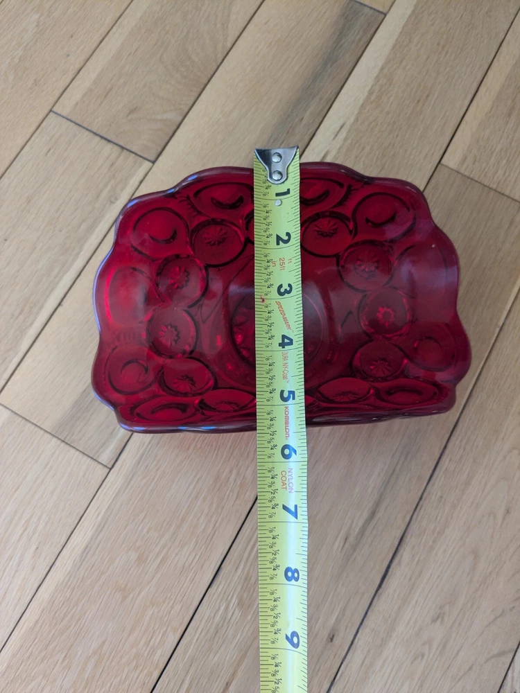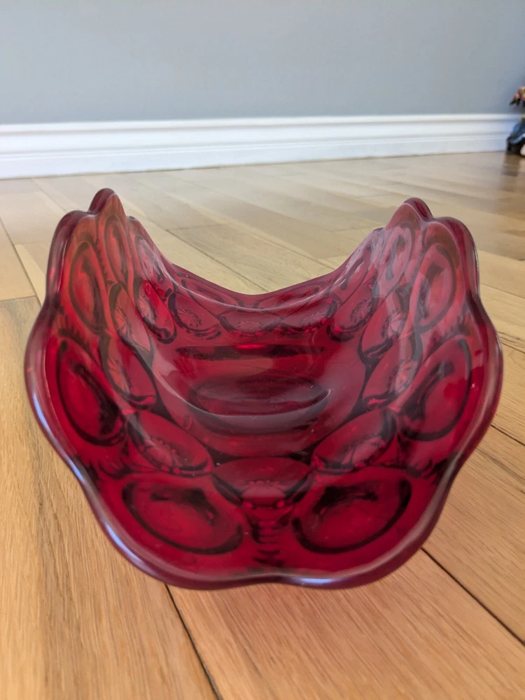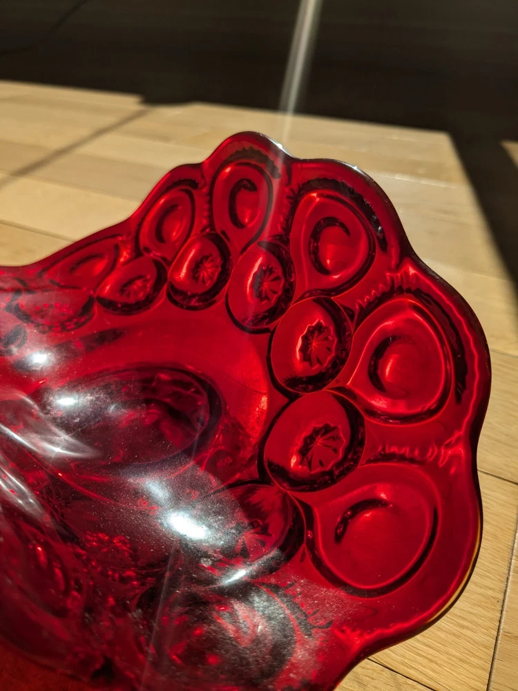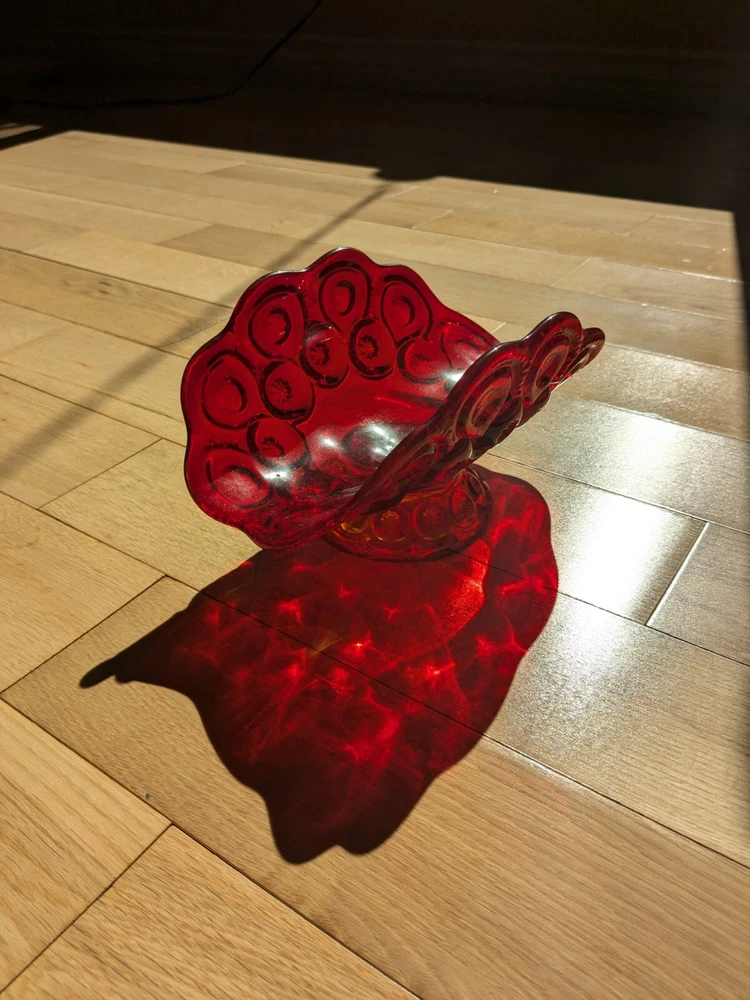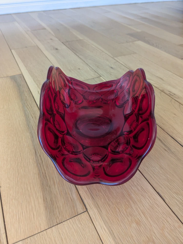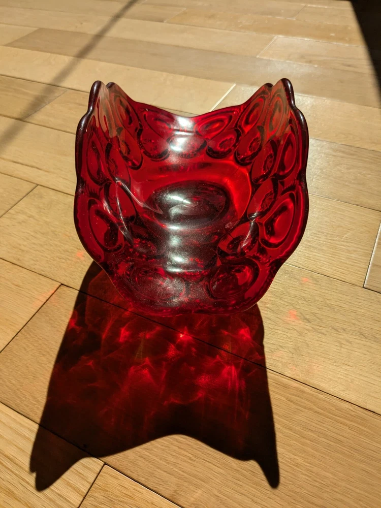 Abstract L E Smith Moon & Star Amberina Banana Boat Intricate Red Hand blown Glass 9x6x5". Stunning Contemporary Art! This stunning sculpture by L.E. Smith features a half-moon shape and is made of beautiful red hand-blown glass. The intricate moon and star design adds a touch of abstract contemporary art to any home décor. Measuring 9x6x5 inches, this medium-sized piece is perfect for any living space. The glossy finish adds a touch of elegance and the glassmaking technique ensures a unique and high-quality product. This sculpture is perfect for anyone who loves moon and star-themed décor and wants to add a beautiful piece to their collection.