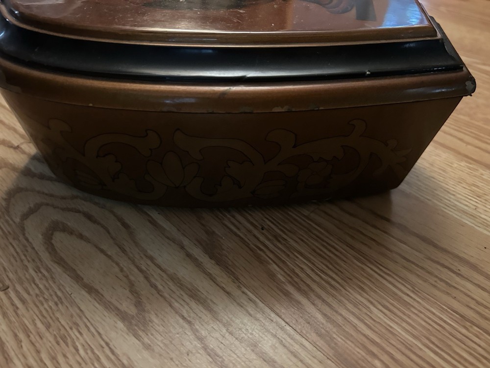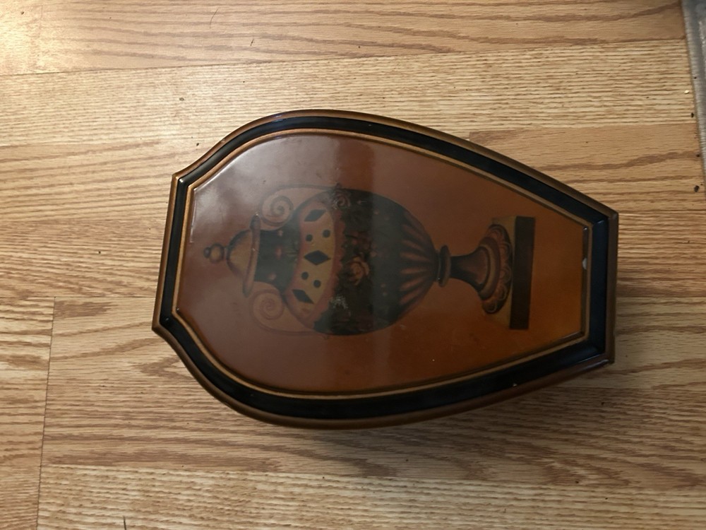 This vintage laquered box is a small, handmade trinket box made of wood. It features a boxing subject and a late 20th century design. The box is part of a collection of keepsake boxes, perfect for storing small items in any room. It has a lacquered finish and should be cleaned with a damp cloth. This unique piece is a perfect addition to any collection of decorative collectibles.
