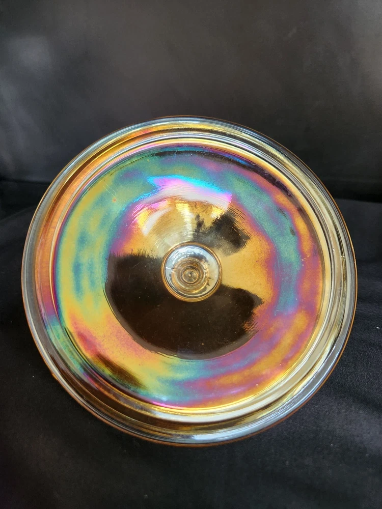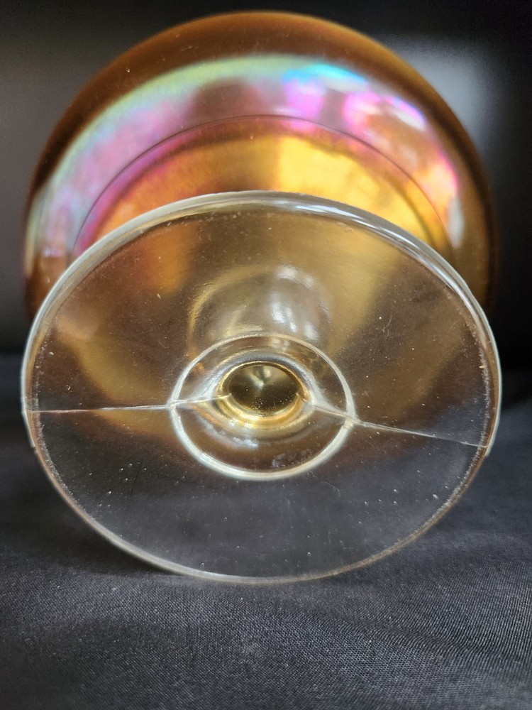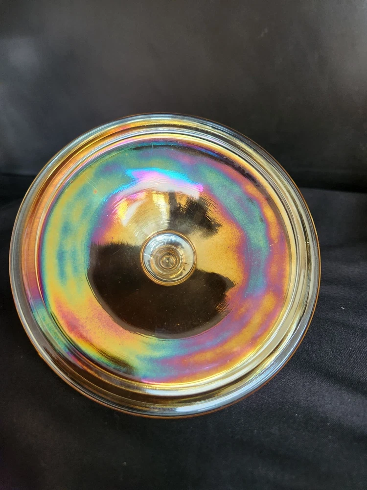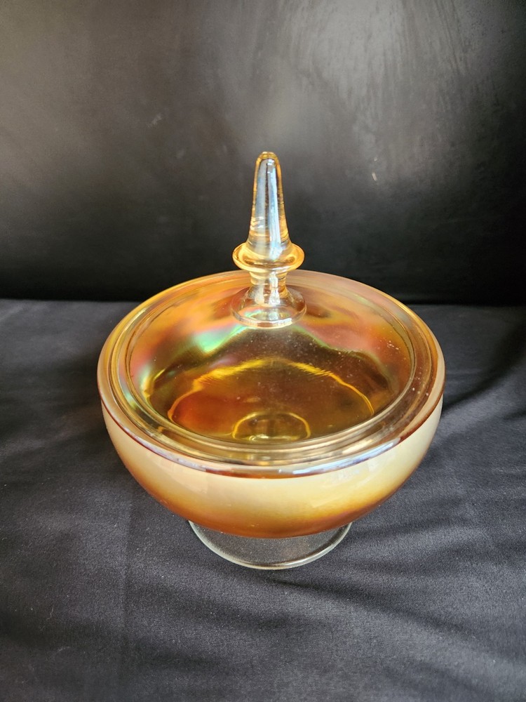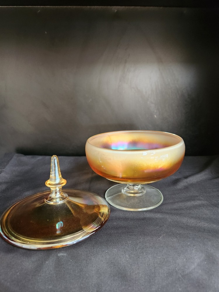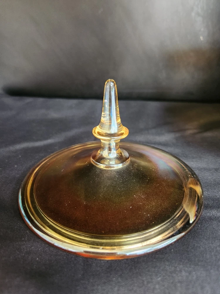 Measures 6.25" Tall x 5.25" Wide The Vintage Lancaster Glass Marigold Candy Dish with Lid features a rare and stunning design with a clear glass pedestal base, showcasing the brand's craftsmanship and originality. Made in the United States, this mid-century modern piece exudes a touch of retro glamour with its vibrant gold color. Perfect for collectors or those looking to add a unique decorative touch to their space, this Lancaster glass item is sure to be a standout piece in any display.