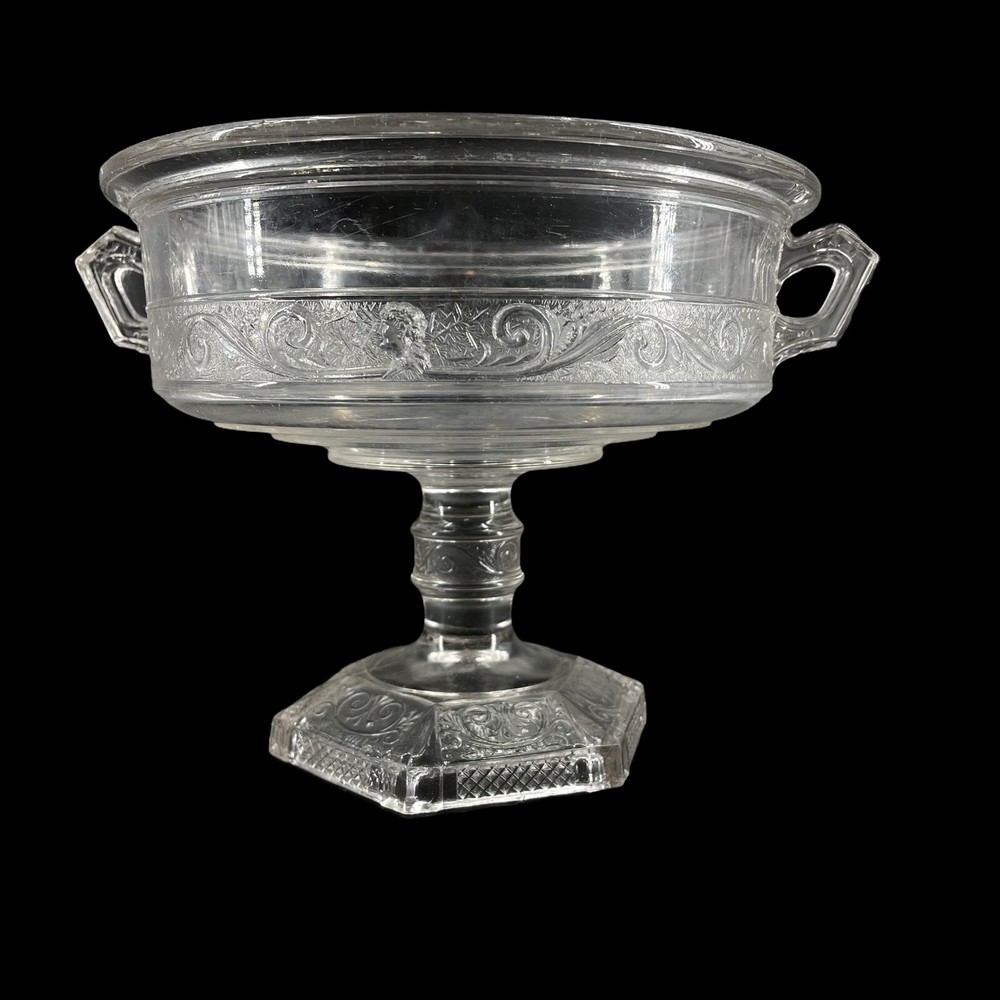 Large Vintage Pedestal Compote Two Handles Embossed Scrollwork Centerpiece 8" Embossed band around lower portion of bowl. Appears to be Caesar head and scrollwork. Similar scrollwork around the base and the stem. Internal bubbles in glass. 7 3/4" diameter at top rim and 6 1/2" tall.