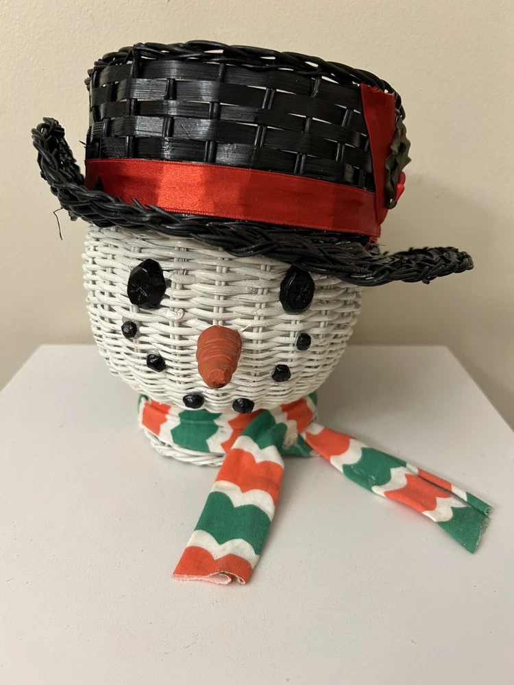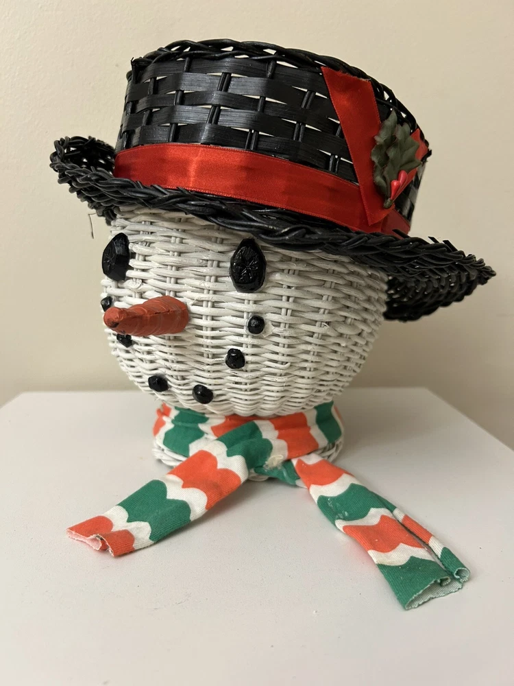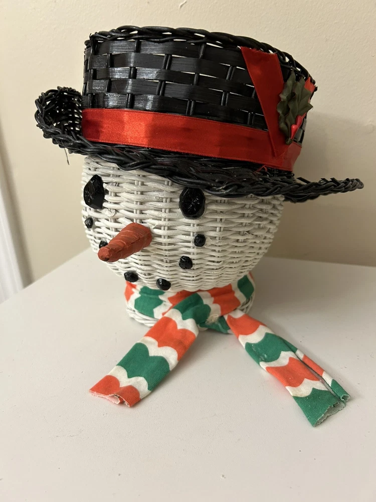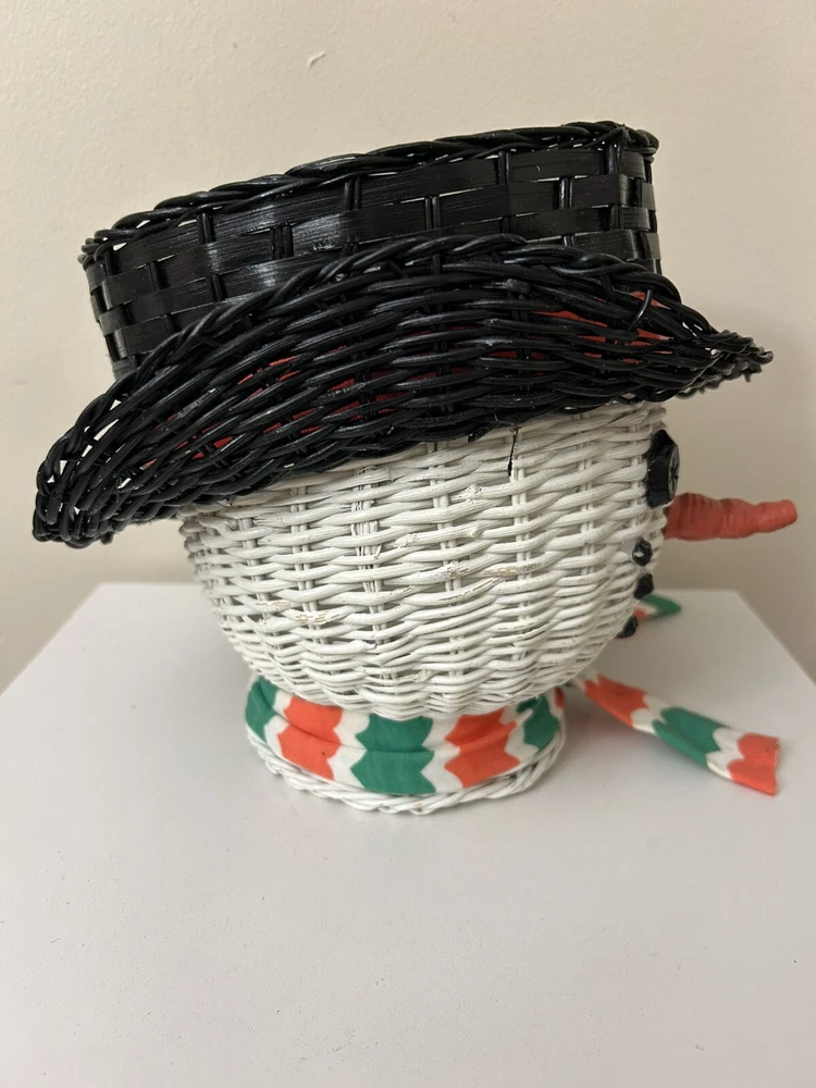 Vintage Large Wicker Rattan Snowman Frosty Head Hat Planter Basket Hand Painted Approximately 8.25” H and 6” W Good condition- refer to pics With Plastic insert