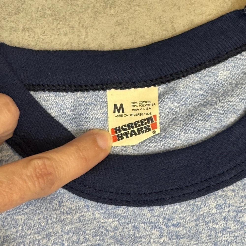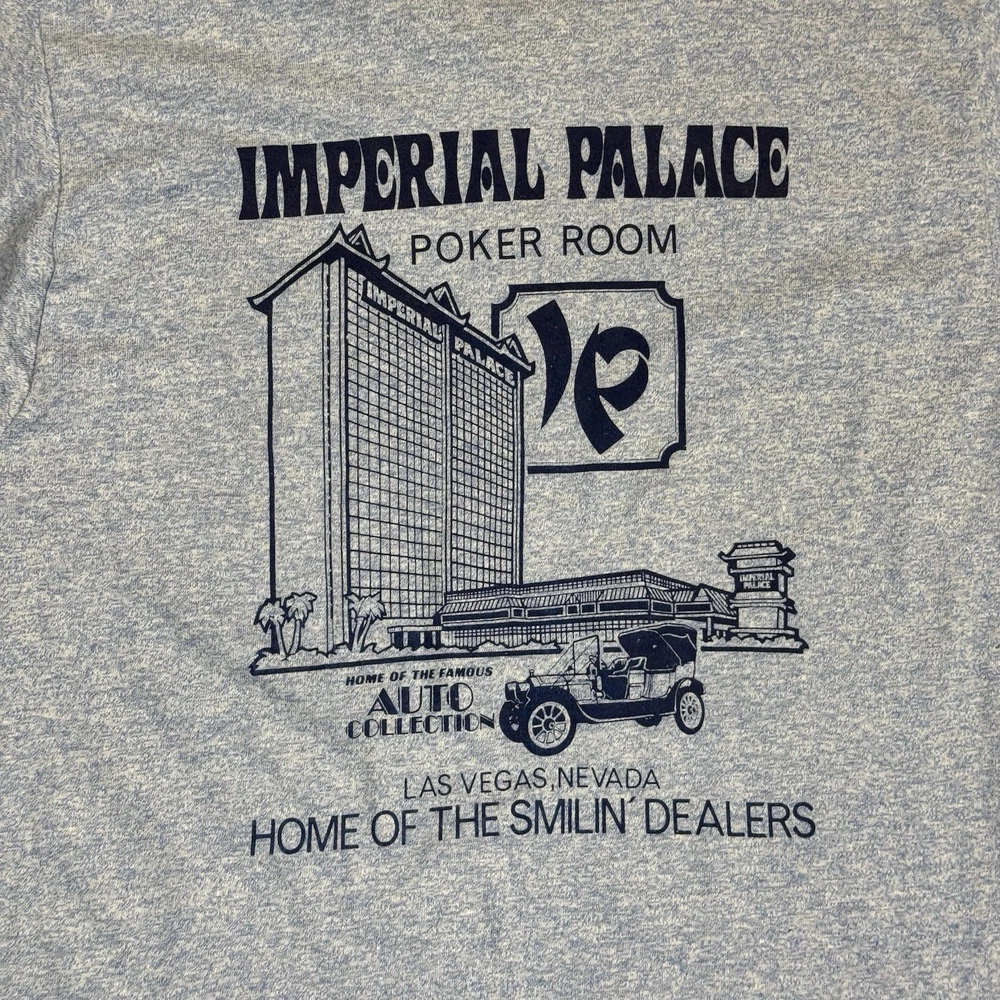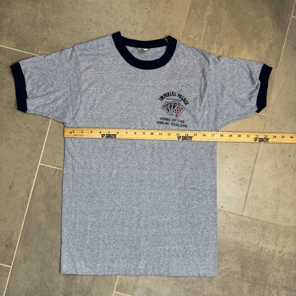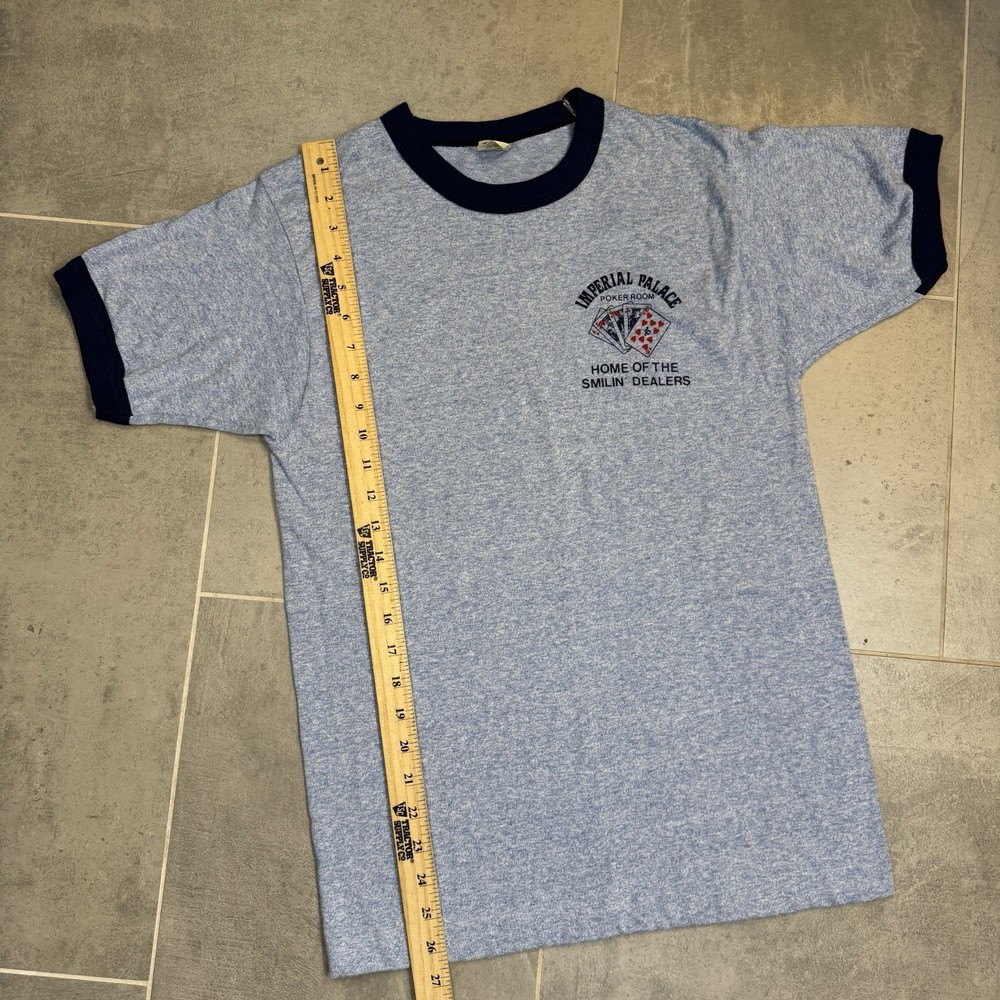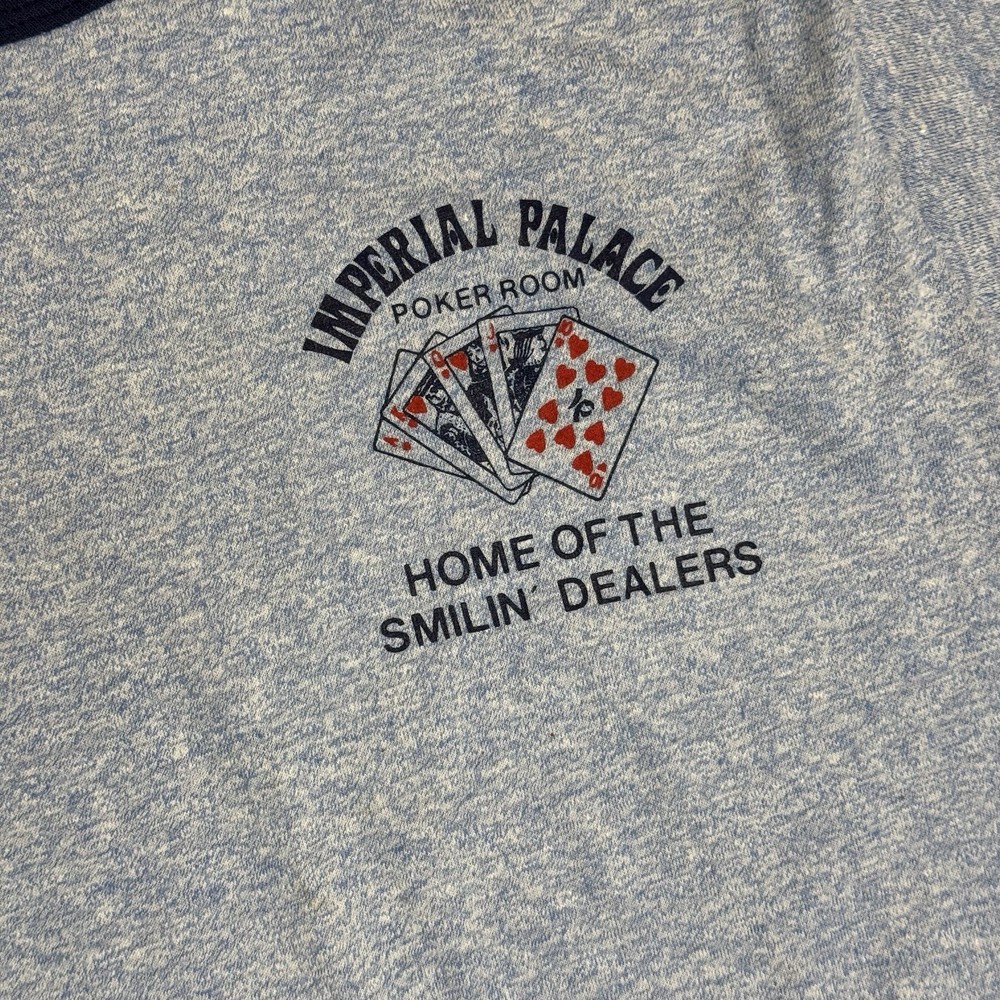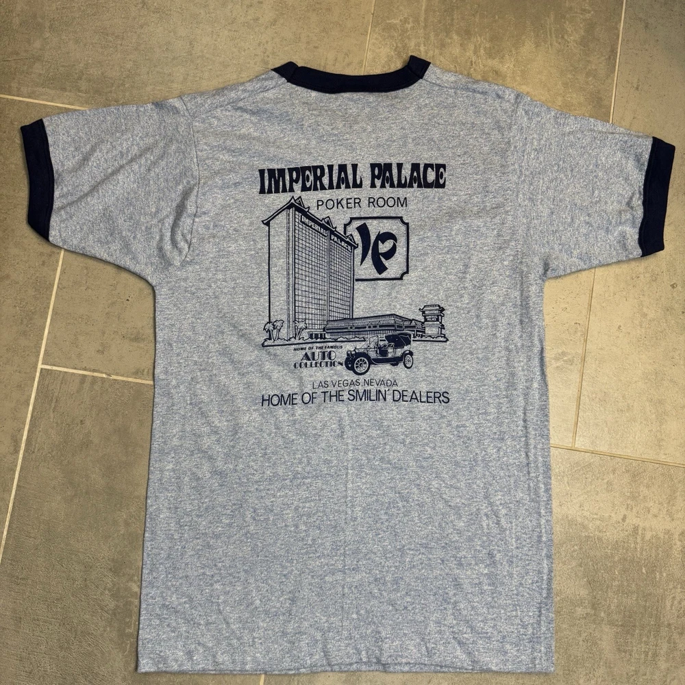 Vintage Las Vegas Imperial Palace Poker Room SS Ringer T-Shirt – Size Medium This vintage Imperial Palace Poker Room ringer t-shirt is a rare piece of Las Vegas history from the iconic Imperial Palace Casino (1979–2012). Made in the USA by Screen Stars, this 50/50 cotton-poly blend tee features a light blue body with navy collar and sleeve bands. Design & Graphics: Front (Left Chest): "Imperial Palace Poker Room" text over a Royal Flush in hearts "Home of the Smilin’ Dealers" printed below Back (Larger Graphic): "Imperial Palace Poker Room" text over a graphic of the casino hotel IP logo to the left "Home of the Famous Auto Collection" next to a Model T car "Las Vegas, Nevada" and "Home of the Smilin’ Dealers" underneath Details: Brand: Screen Stars Size: Medium (Slim - like modern small) Material: 50% Cotton, 50% Polyester Made in the USA Single Stitch Construction – true vintage piece Color: Light Blue with Navy Trim Approximate Measurements (Laid Flat): Chest (pit to pit): 18 inches Length (shoulder to bottom hem): 26.5 inches A must-have for vintage Vegas collectors, poker enthusiasts, and fans of retro casino memorabilia. Fast shipping upon payment! Let me know if you have any questions.