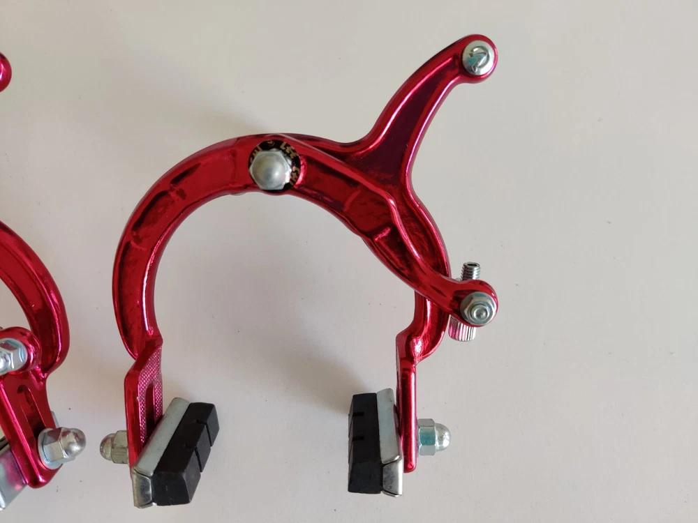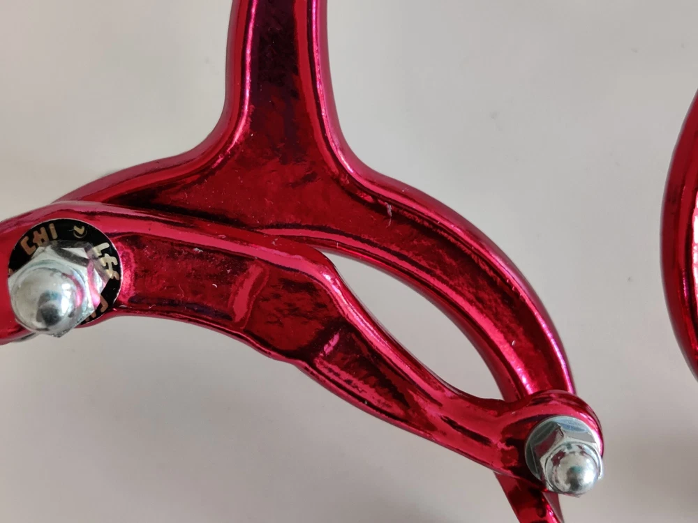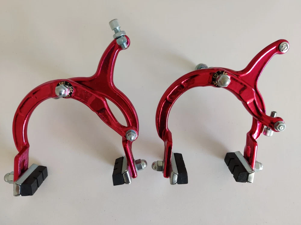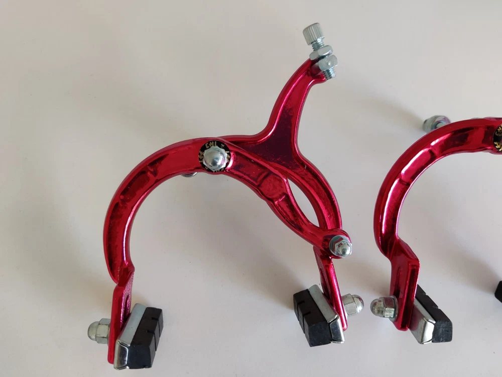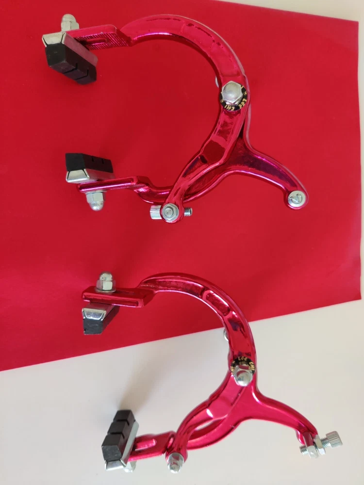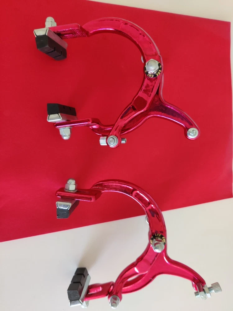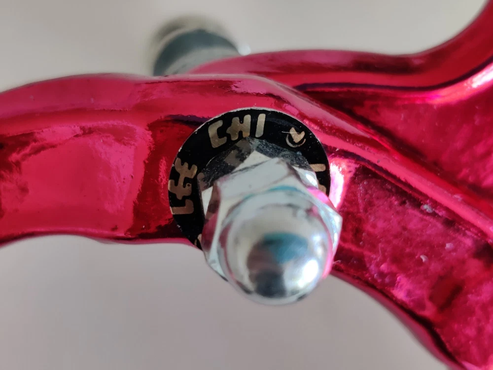 Vintage Lee Chi Front & Rear Brake Calipers 1000A Chrome Old School BMX New, never used/mounted Old-school style from Lee Chi Brake pads included There is a very minor shelf wear, tiny hairline scratches on paint from storage for many years on one of the calipers. See photos. Note, the color is not a true red but a pinkish red. Different lighting and angles may affect the color shown in the photos. See last few photos for color comparison. Please ensure items fit your needs. Final sales.