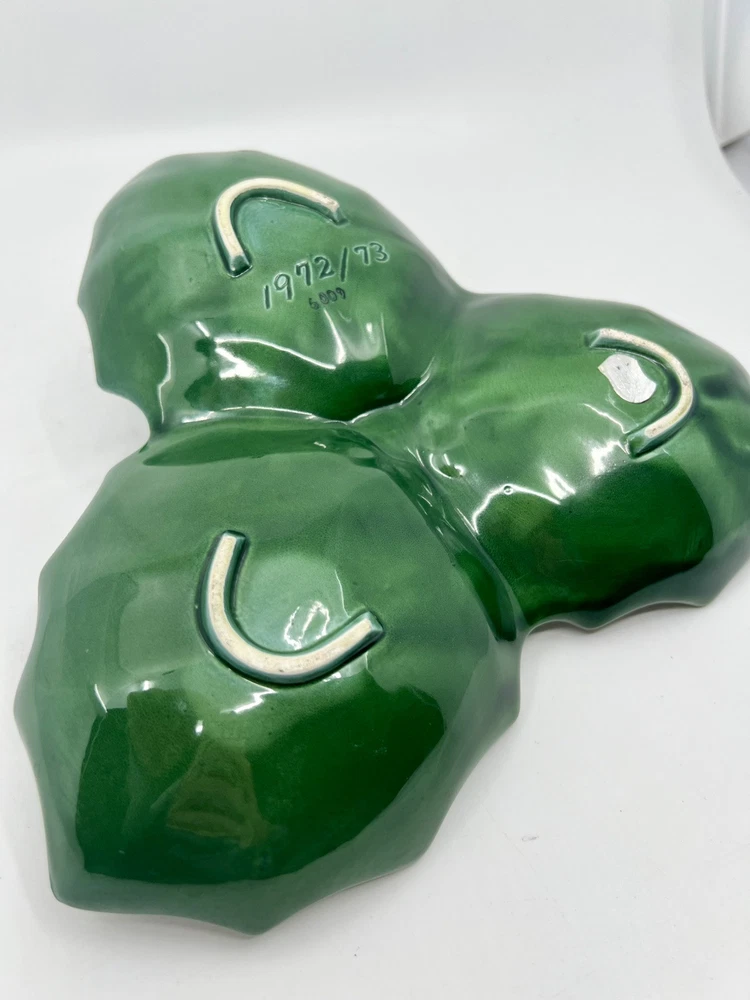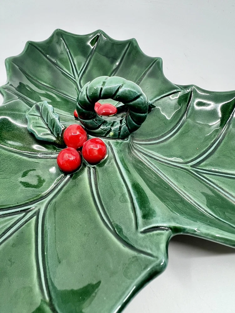 This vintage Lefton #6009 divided relish dish features a festive Christmas theme with green holly detailing. Made of ceramic and porcelain, this serving piece is from the 1970s and was manufactured in Japan. The dish is perfect for serving snacks or dips during holiday gatherings, adding a touch of seasonal charm to your table decor. The holly design and holiday colors make it a delightful addition to your Christmas dining collection. In great condition. Please see pics to verify.