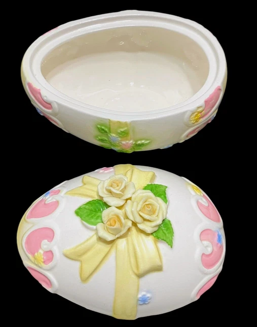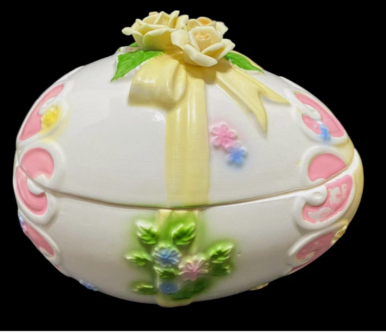 HomeVintage Lefton Easter Egg Trinket Dish Bisque Applied Yellow Roses on Lid
