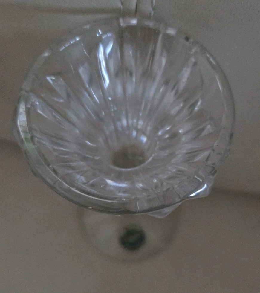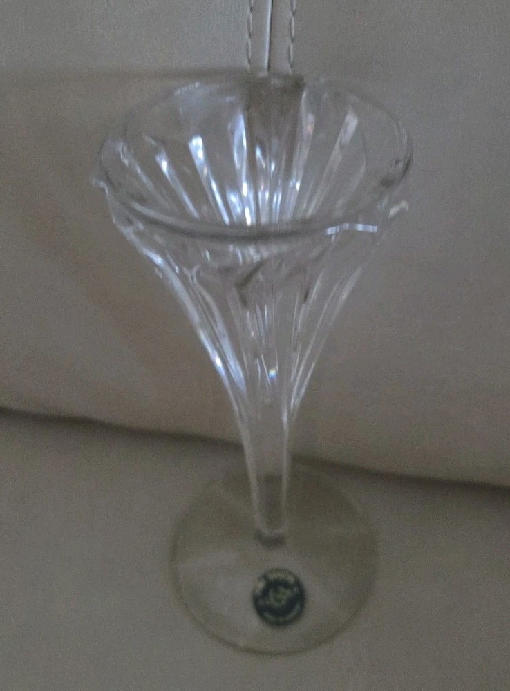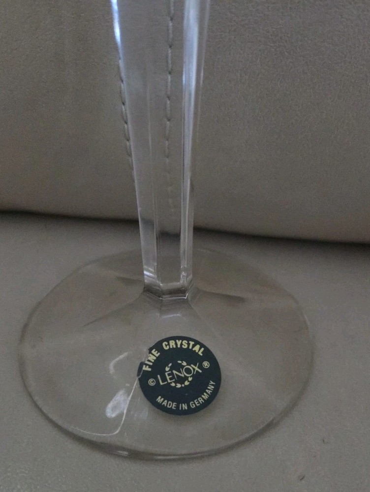This vintage Lenox crystal candle vase boasts a beautiful scallop edge and asymmetrical shape, making it a unique addition to any collection. Hand blown in Germany, this clear crystal vase is perfect for all occasions and features a solid pattern with a British style. The vase measures 9.5 inches in length and 9 inches in height, with a width of 3 inches at the top. The Lenox crystal vase is an original piece from the 1980s and is perfect for collectors of decorative collectibles. The vase is made of high-quality crystal and is a great example of handcrafted art. This vase is perfect for displaying candles or flowers and will add a touch of elegance to any room.