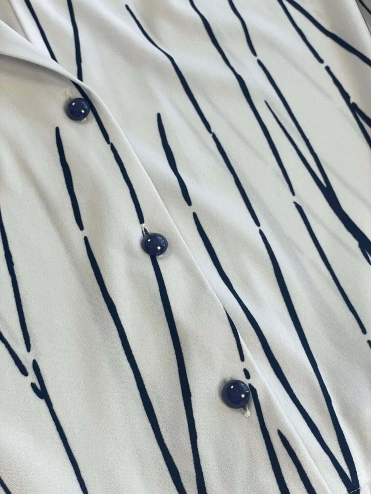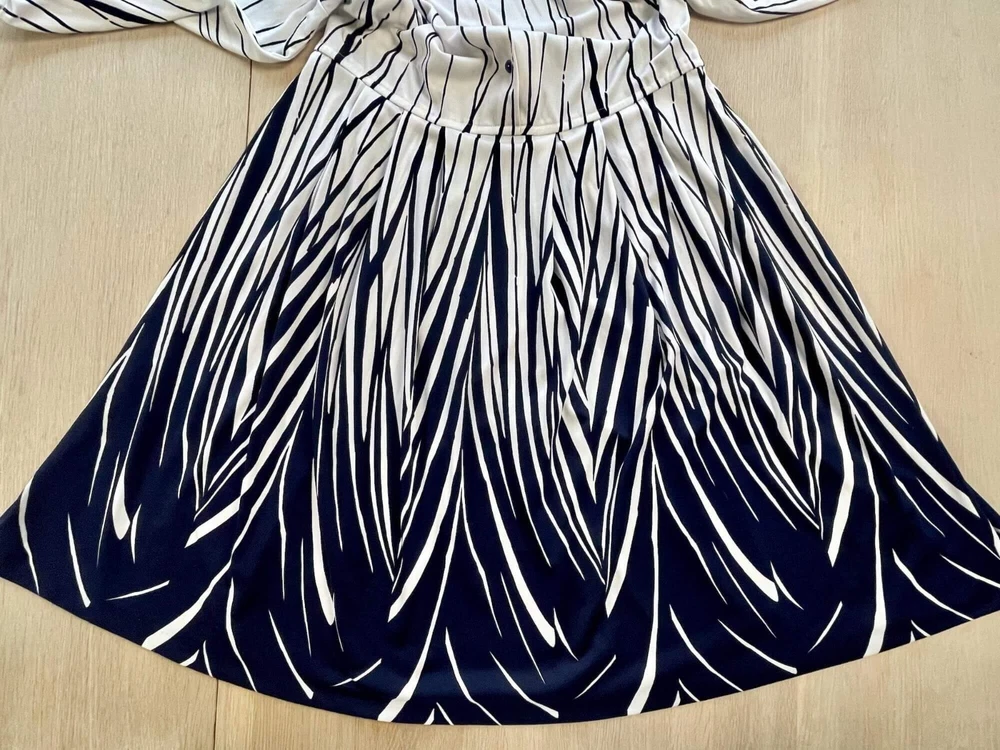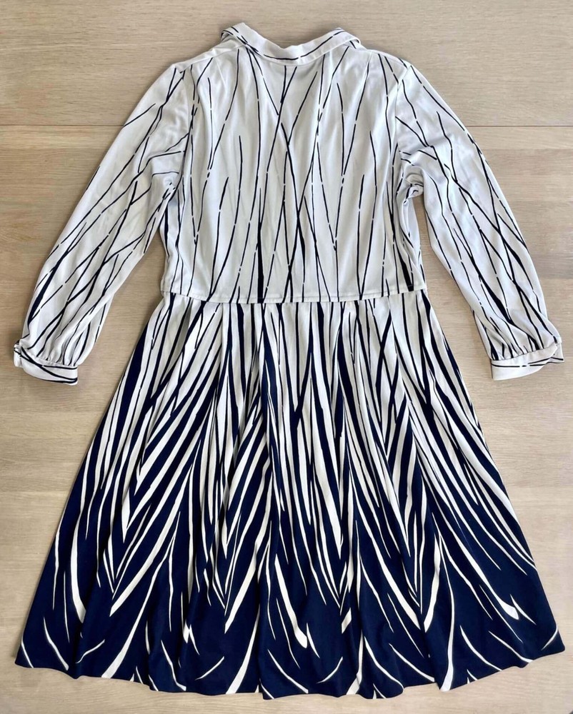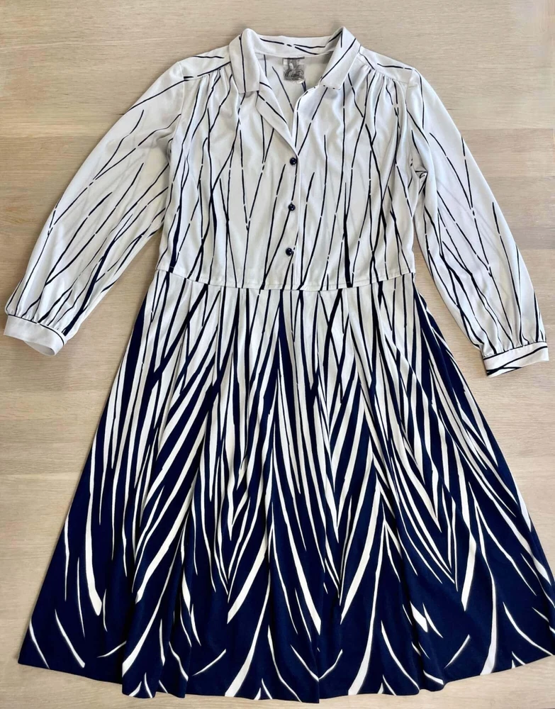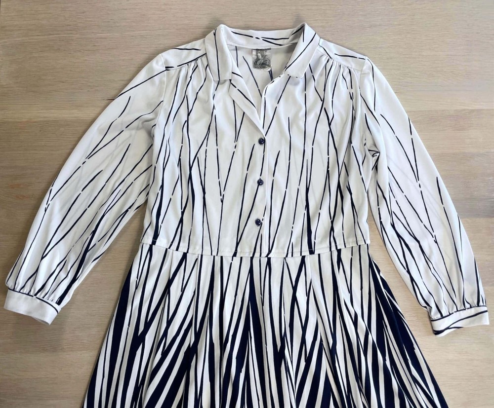 Step into bold sophistication with this vintage Leona Finland shirt dress. Made in Finland, this rare piece combines sharp abstract stripe patterns with a timeless midi silhouette. Featuring a structured collar, button front, and full skirt, it's perfect for retro lovers or those wanting a one-of-a-kind statement dress. Brand: Leona (Made in Finland) Size on tag: C46 (equivalent to US L or 12–14 approx.; please check measurements) Material: 100% Polyester Color: White with navy abstract stripe print Style: Button-down shirt dress with collar Sleeves: Long with button cuffs Length: Midi / below-the-knee Condition: Excellent vintage condition Dress measurements: Bust: 45.7" or 116 cm Waist: 37.4" 95 cm Shoulder-hem: 43.3" or 110 cm Please check measurements to insure a proper fit. Remember to allow yourself some extra room for movement. You can compare these with something from your closet that fits you well.