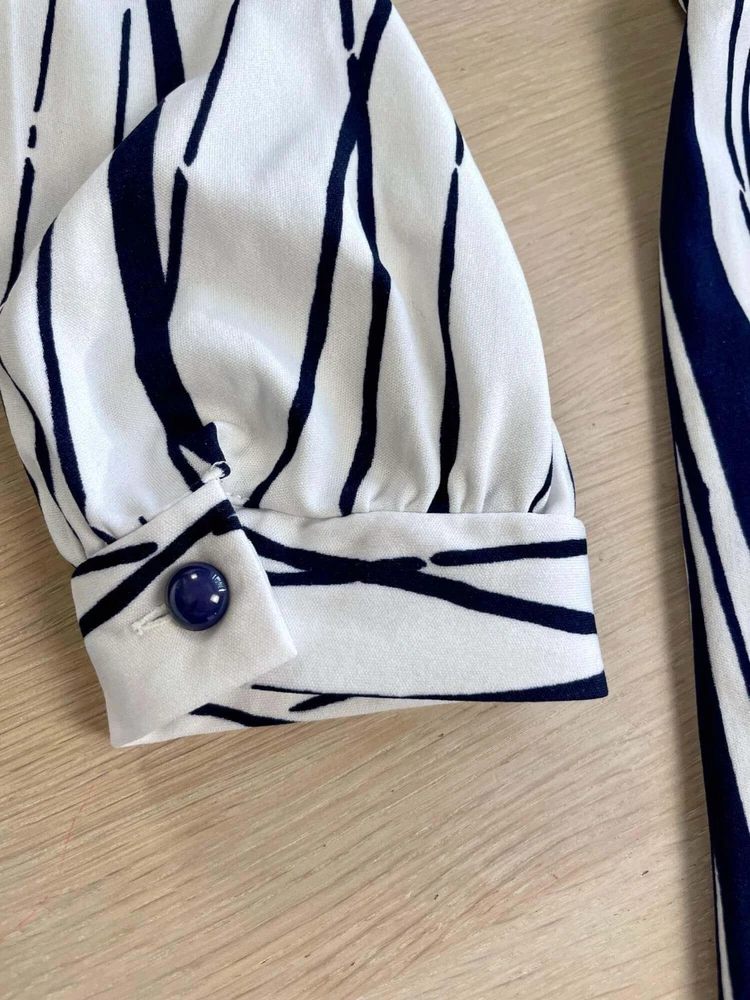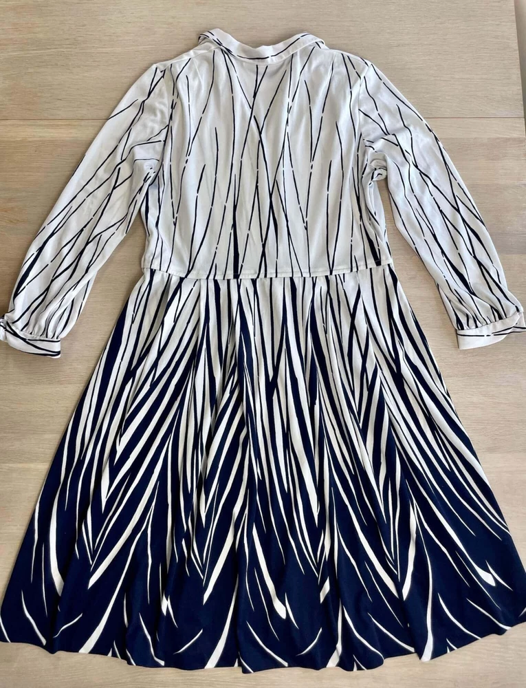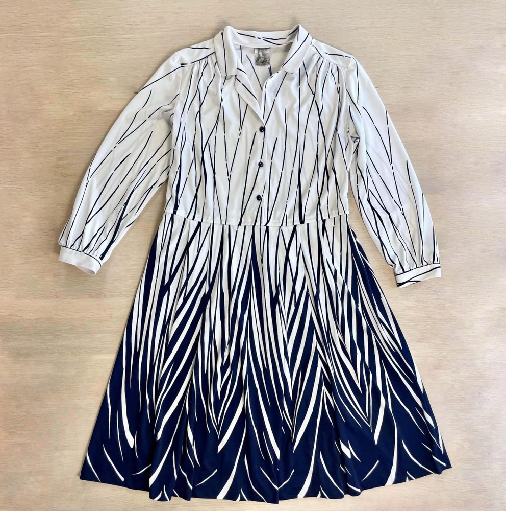 Step into bold sophistication with this vintage Leona Finland shirt dress. Made in Finland, this rare piece combines sharp abstract stripe patterns with a timeless midi silhouette. Featuring a structured collar, button front, and full skirt, it's perfect for retro lovers or those wanting a one-of-a-kind statement dress. Brand: Leona (Made in Finland) Size on tag: C46 (equivalent to US L or 12–14 approx.; please check measurements) Material: 100% Polyester Color: White with navy abstract stripe print Style: Button-down shirt dress with collar Sleeves: Long with button cuffs Length: Midi / below-the-knee Condition: Excellent vintage condition Dress measurements: Bust: 45.7" or 116 cm Waist: 37.4" 95 cm Shoulder-hem: 43.3" or 110 cm Please check measurements to insure a proper fit. Remember to allow yourself some extra room for movement. You can compare these with something from your closet that fits you well.