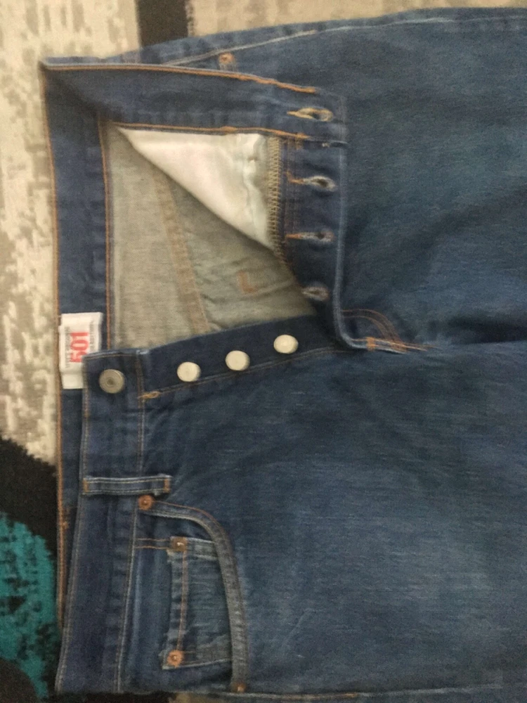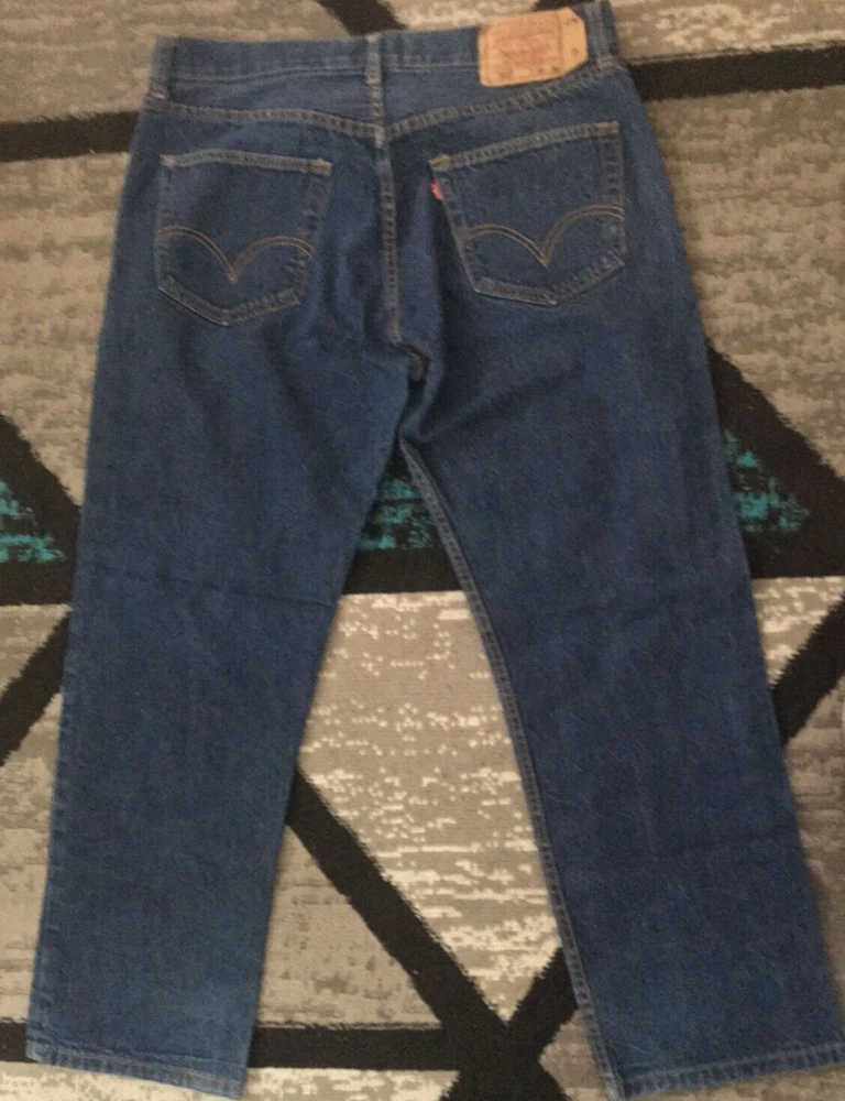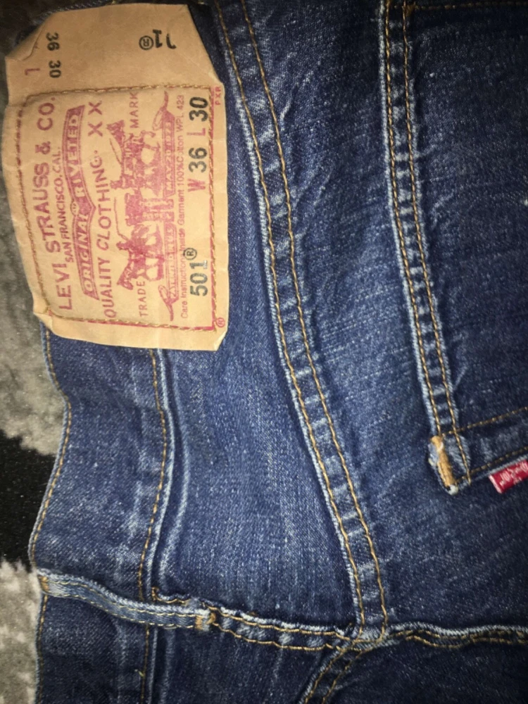 This pair of Levi's 501 jeans is a vintage piece with a riveted 36 waist and 30 length. Made of dark-washed cotton denim, these jeans feature a button closure and straight leg style. The waist size is 36 inches and the inseam is 30 inches. The jeans are part of the Levi's 501 series and have a mid-rise of 10-12 inches. The jeans are perfect for men who want a classic and timeless look. They are not handmade and are not personalized. The Levi's brand is known for its quality and durability, making these jeans a great addition to any wardrobe. The jeans are made in the United States and have a solid pattern with a blue color.