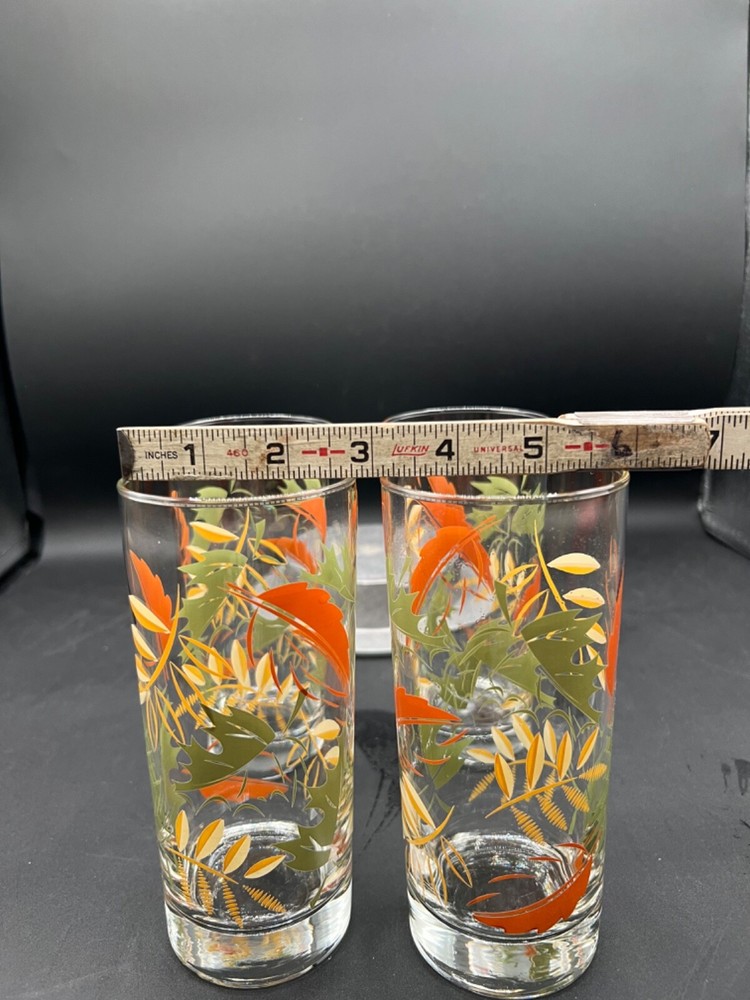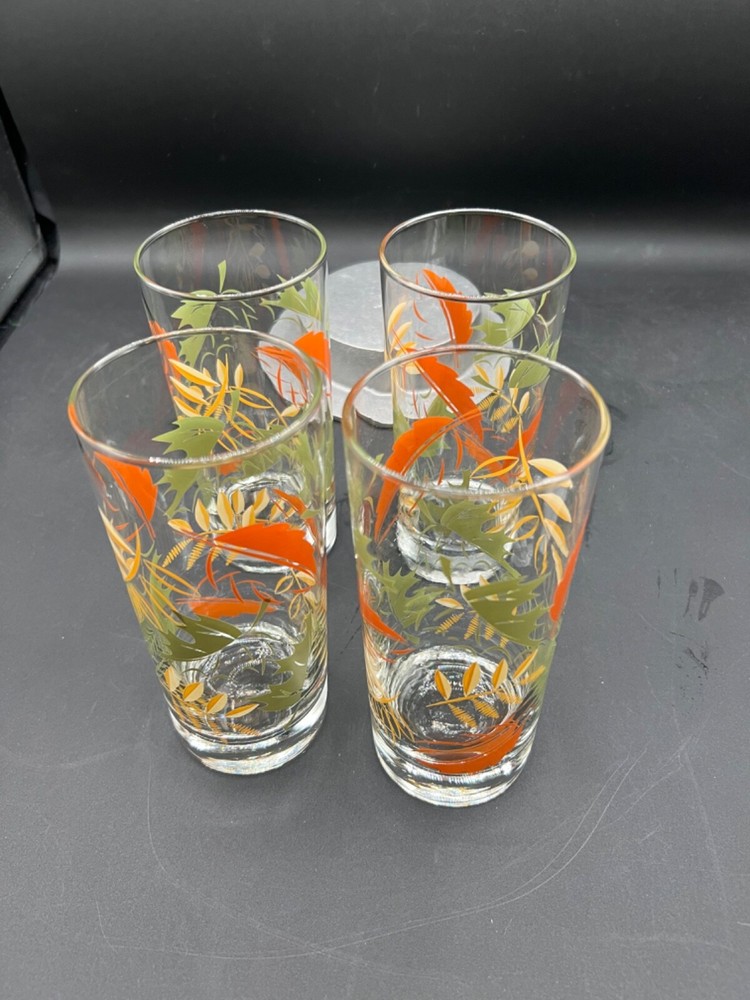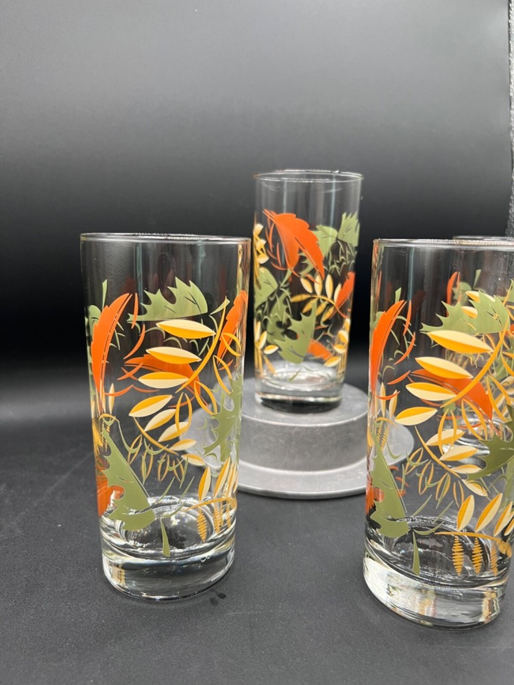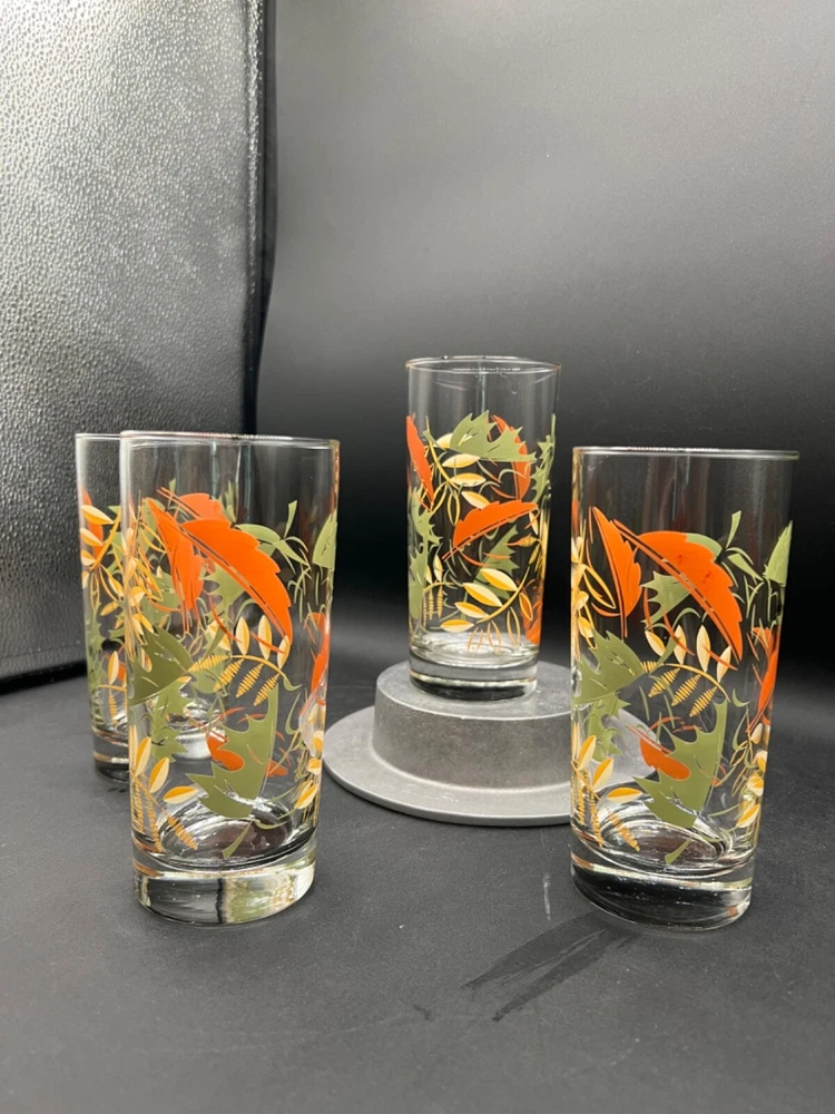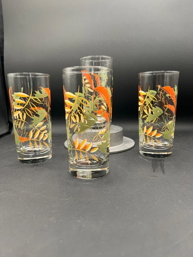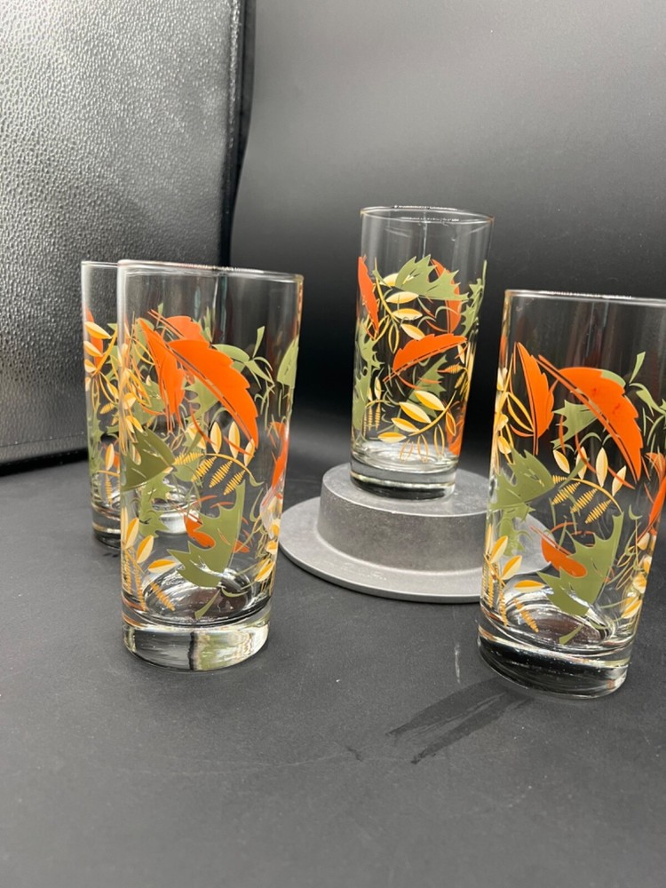 The product is a set of 4 vintage Libbey Crisa tumbler glasses Look alike with a Seasons Leaves pattern, featuring a Mid-Century Modern style in clear glass. These glasses are perfect for drinkware and barware, adding a touch of nostalgia to your collection. Made of durable glass, these tumblers are in excellent condition and can serve as a stylish addition to any home. They are 6 1/2 inches tall and 3 inches wide.