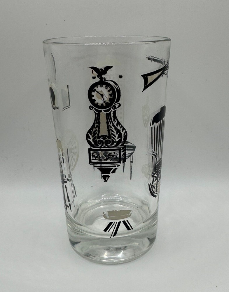 The Libbey Freda Diamond Curio Collection Collins Glass from the 1950s is a vintage barware item with a Mid-Century Modern style. This cylinder-shaped drinkware features a clear glass design with gold, black, and white accents, making it perfect for all occasions. Hand wash only to preserve its originality, this unisex adults' item is a unique addition to any collection, showcasing the theme of MCM furniture in its design.