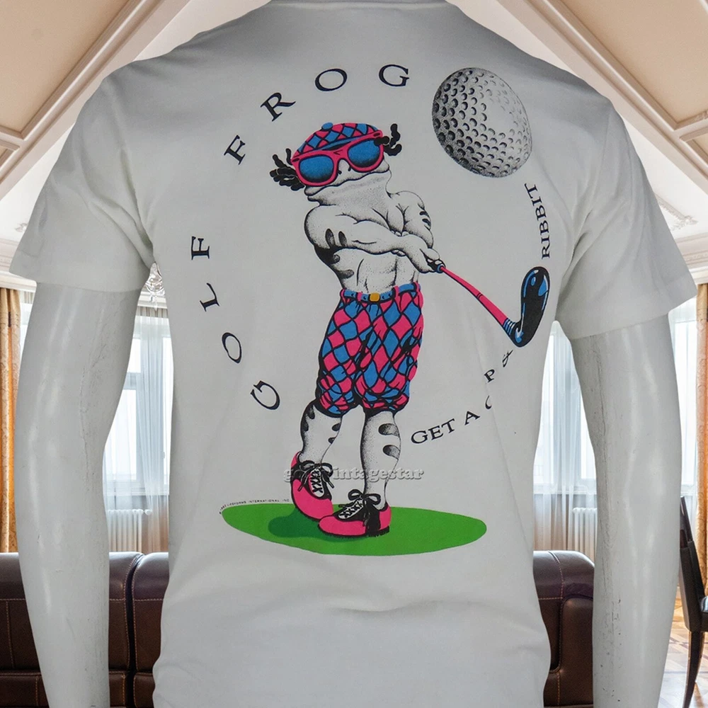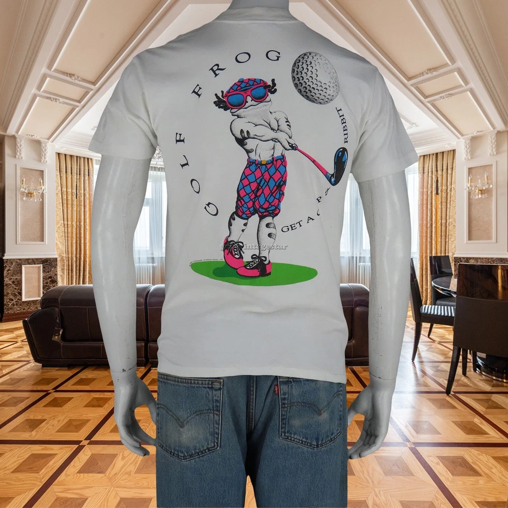 Vintage Lifeforms International Golf Frog Get A Grip & Ribbit Golfing Single Stitch Tee T Shirt S material: 100% cotton made in Jamaica color: white single stitch at sleeves and bottom hem condition: very light yellow stains throughout size on tag: M fits like: S mannequin is 6' 2" and a size medium length (from the front on either side of the collar down to the bottom edge): 26 armpit to armpit: 18.5 all measurements are in inches and taken with the garment laying flat any major defect will be mentioned and/or photographed 14170