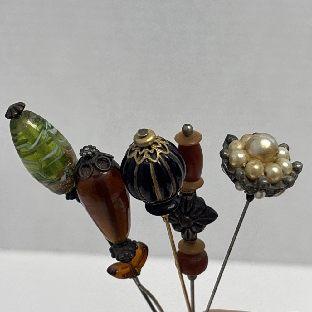 $ 10.56VINTAGE DECORATIVE GREEN GLASS BEAD LONG HAT / HAIR PIN 8"