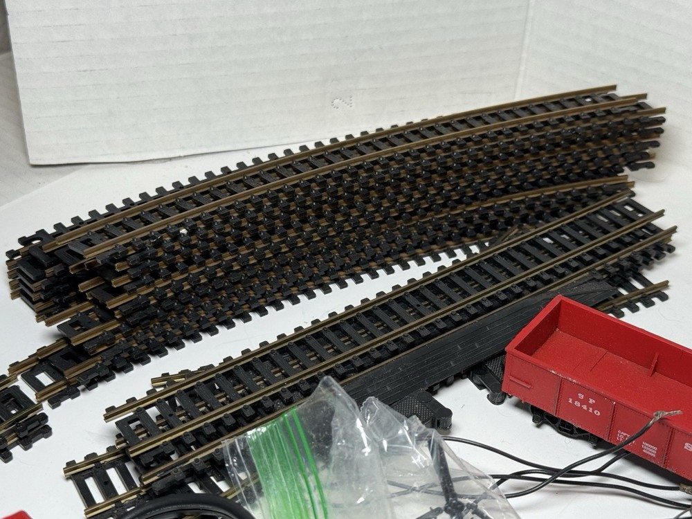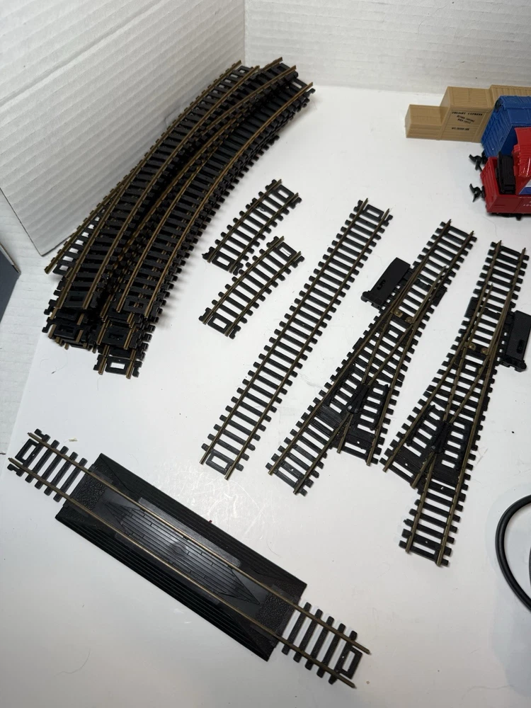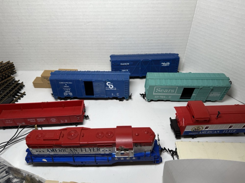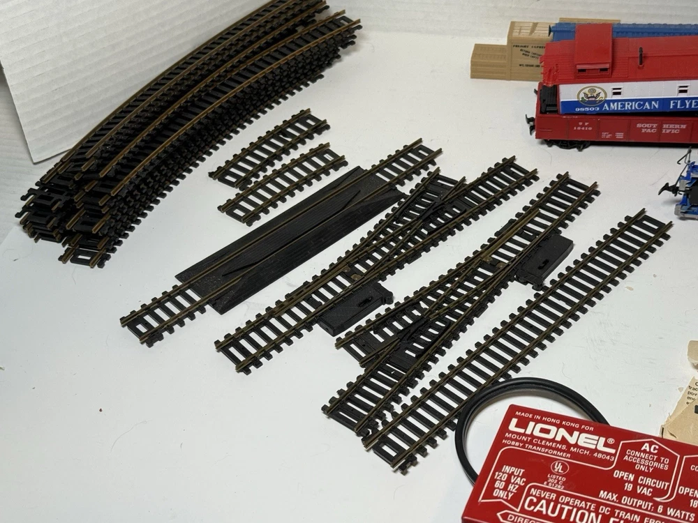 Comes with one Lionel 5513 American flyer train, 7 other misc trains, 16 atlas tracks, 6 other tracks made in Italy. Misc train wheels and Lionel manual + transformer.
