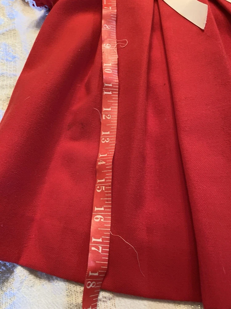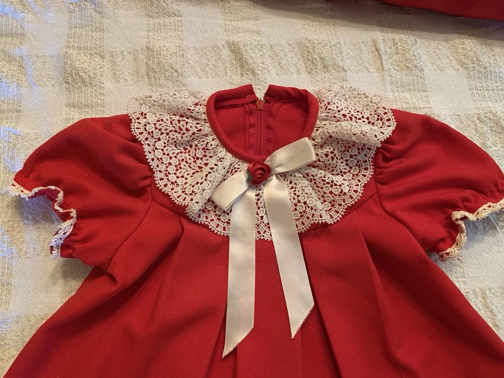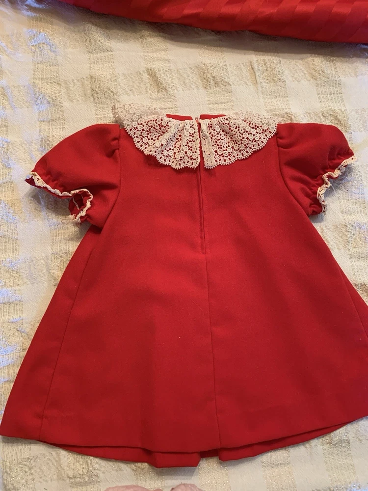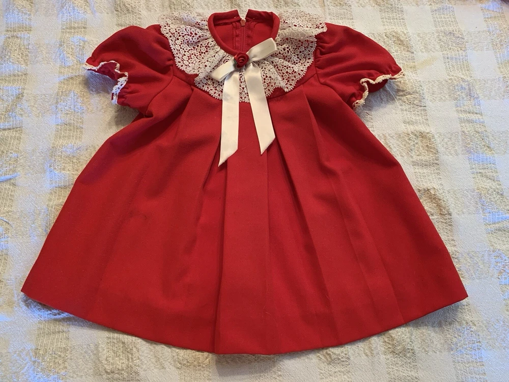 Here is a little girls vintage Christmas dress. Tagged Good Lad 24 M/ USA. Measures 18” from shoulder to hem. Zipper in back Bow and lace on collar. Very good condition but has been worn. Please see all pictures and ask any questions before bidding. Purchase as is. Thanks for looking. USA addresses only.