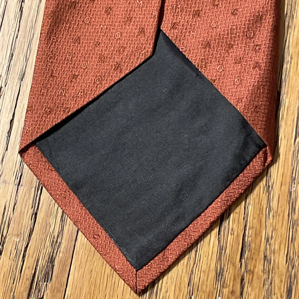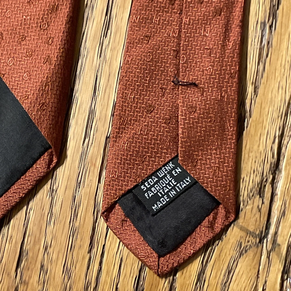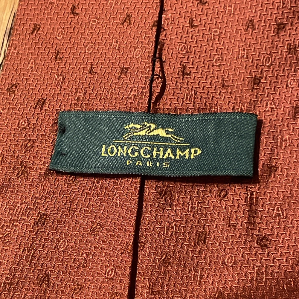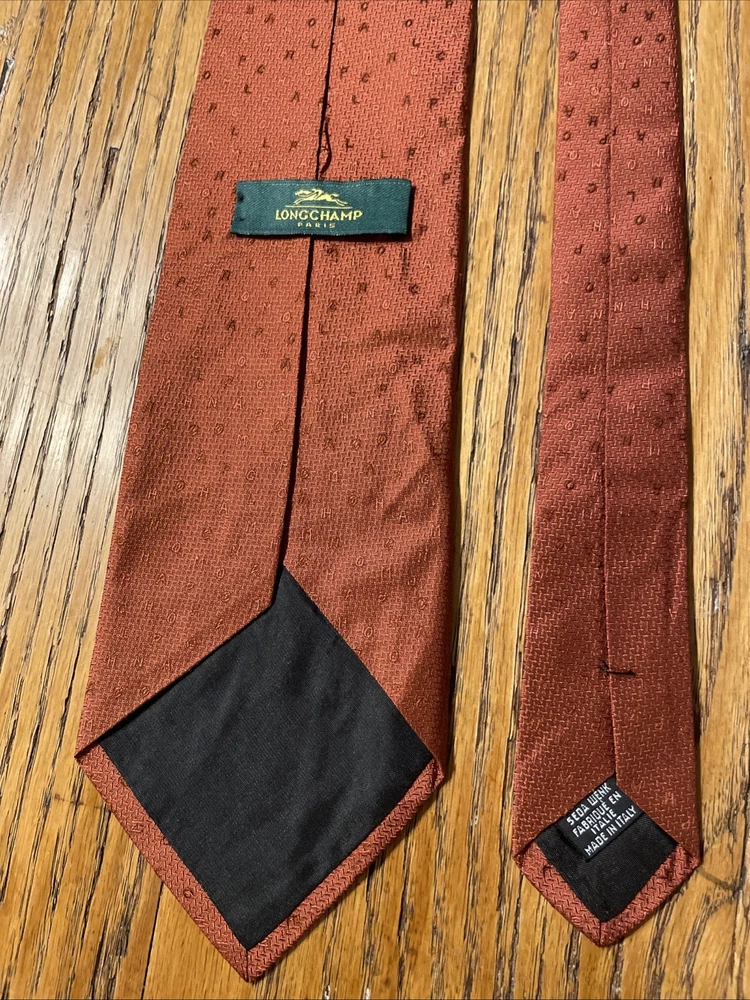 Department: Men Style: Designer Type: Tie Vintage: Yes Item Width: Classic Theme: Preppy Brand: Longchamp Pattern: Scrambled Longchamp Logo Letters Material: 100% Silk Fabric Type: Jacquard Color: Cinnamon Country of Origin: Italy