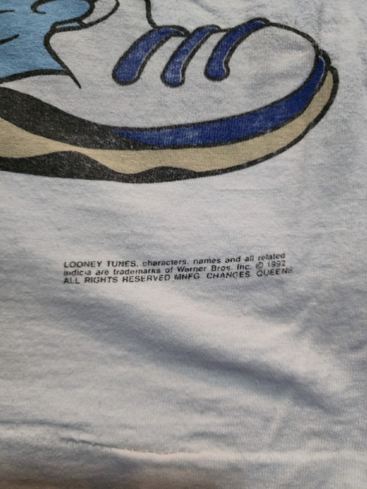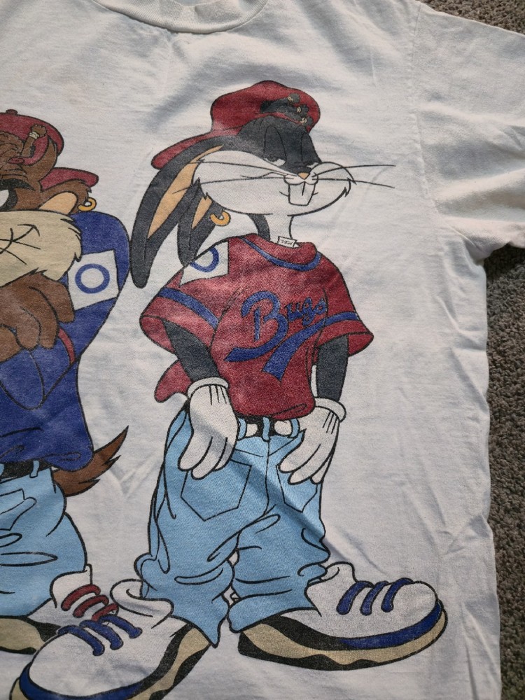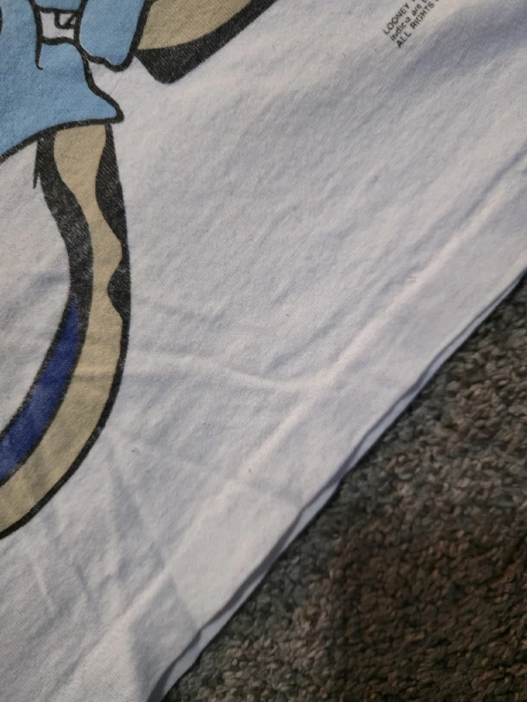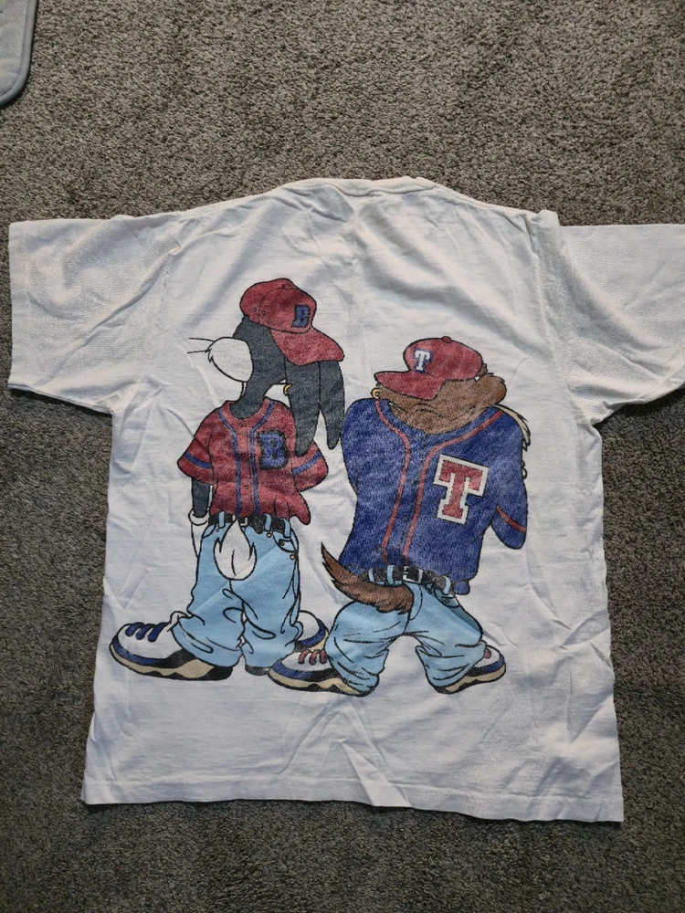 The shirt has some age. There's slight fading of images and a bit of tanning to the shirt. I don't see any holes of rips. It's been well loved, but still great for 32 years old.