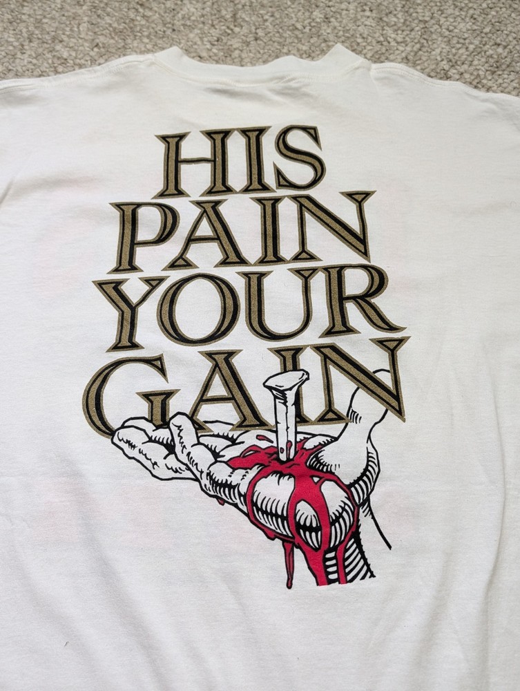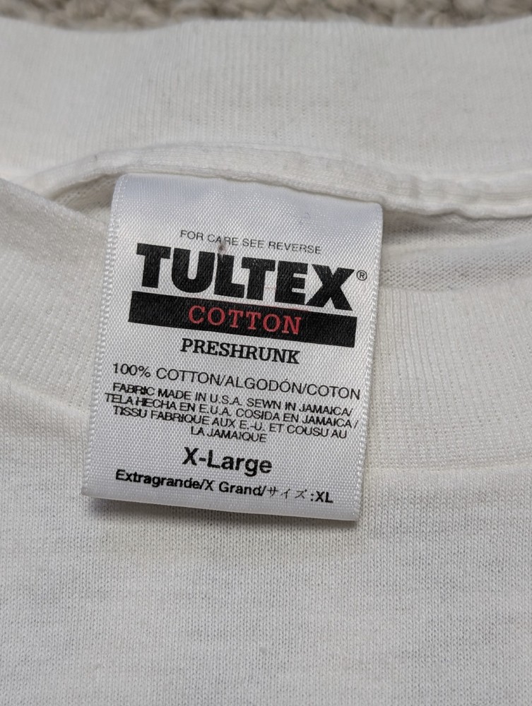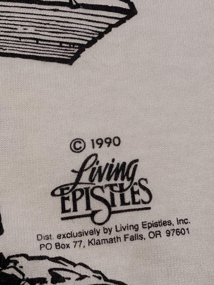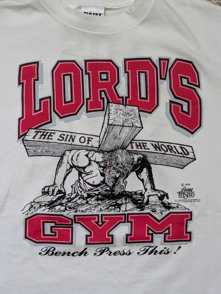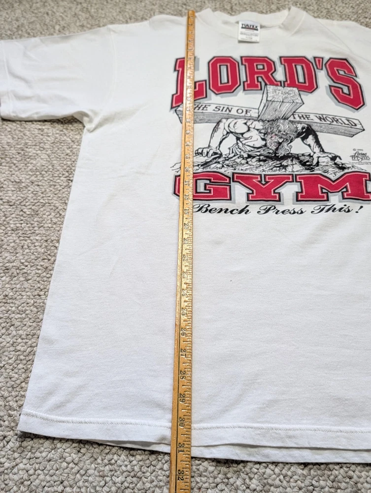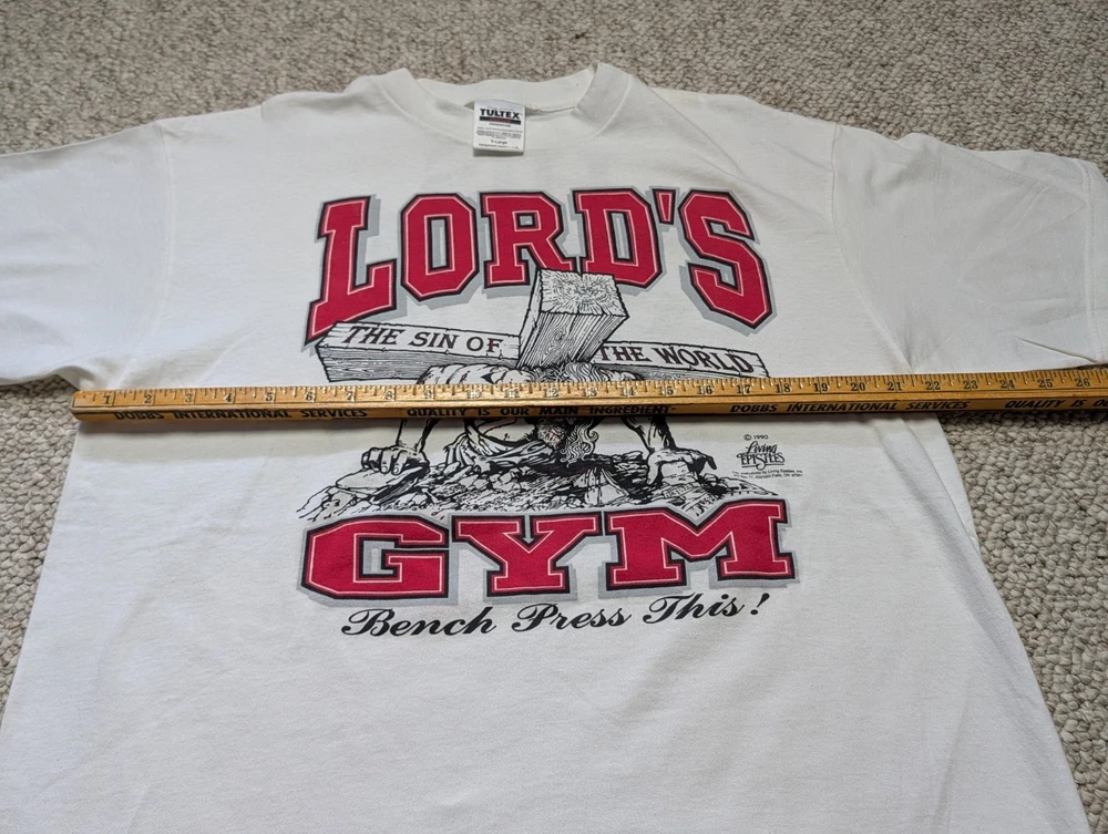 The Vintage Lords Gym Living Epistles 1990 Tultex Graphic T-Shirt in XL size is a rare piece of men's clothing from the 90s. Featuring a white color and made of cotton, this shirt has a crew neck and short sleeves, making it a classic and comfortable choice. The shirt is double-sided, with one side featuring a Christian theme with the words "Jesus" and "Lords Gym." Perfect for those looking for a vintage shirt with a unique design and message from the 90s era. Made in the United States by Living Epistles.