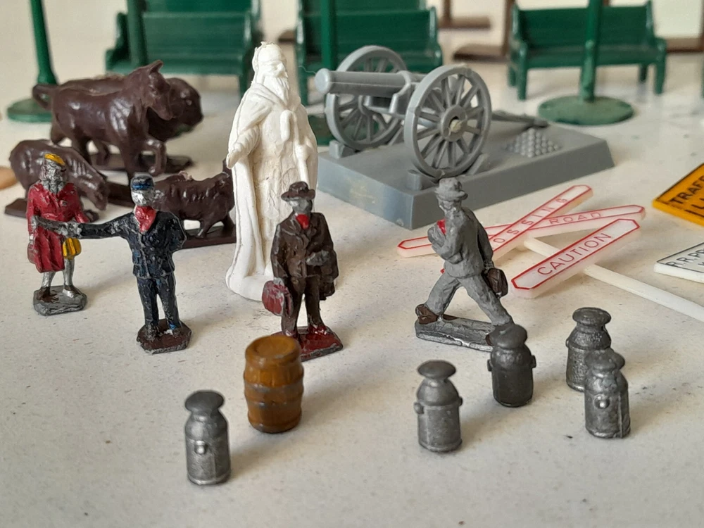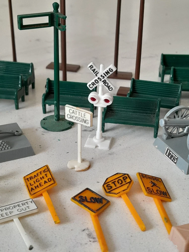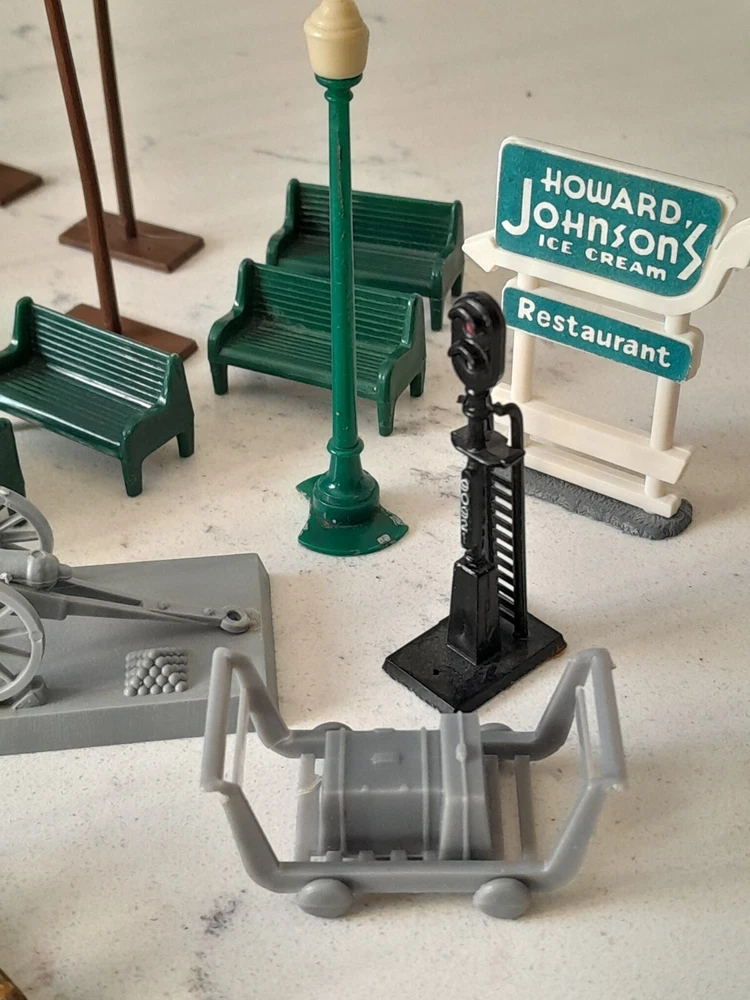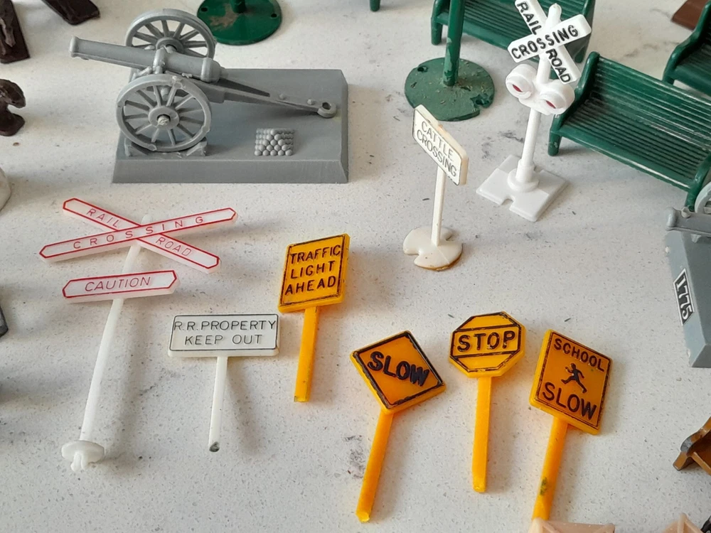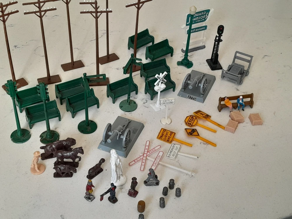 Enhance your model train layout with this vintage lot of HO scale 1:87 trackside signs, poles, and benches. These train accessories are perfect for adding a realistic touch to your miniature railroad scene. The assorted brands of these items provide variety and ensure authenticity. Made for HO gauge trains, these trackside signs are a great addition to any model railroad enthusiast's collection. The lot includes a range of different signs, poles, and benches to choose from. Whether you're looking to add some flair to your layout or just need some extra accessories, this vintage lot is the perfect solution. See Pics for all conditions