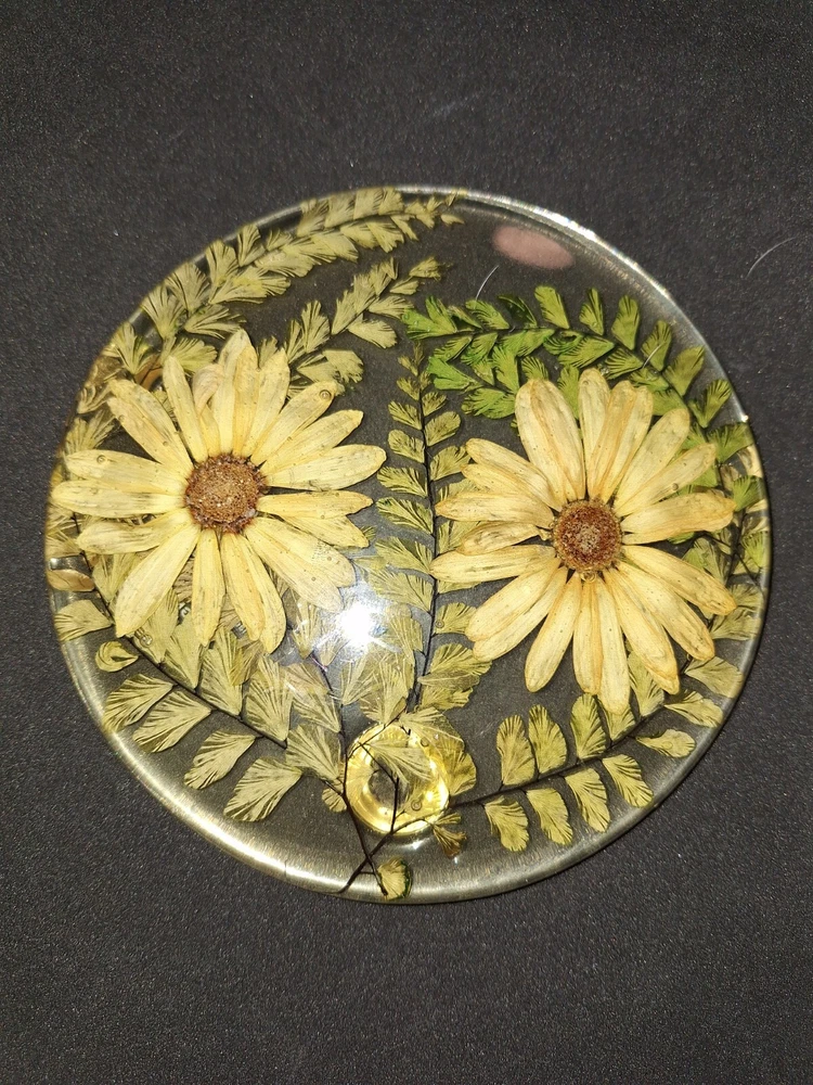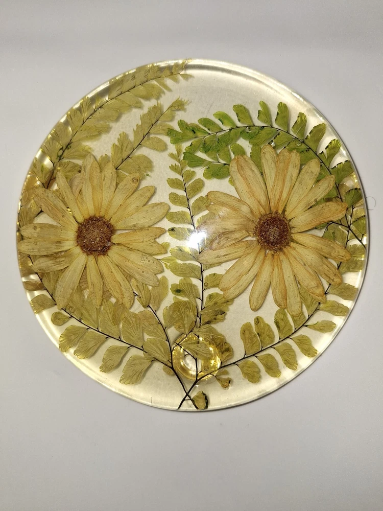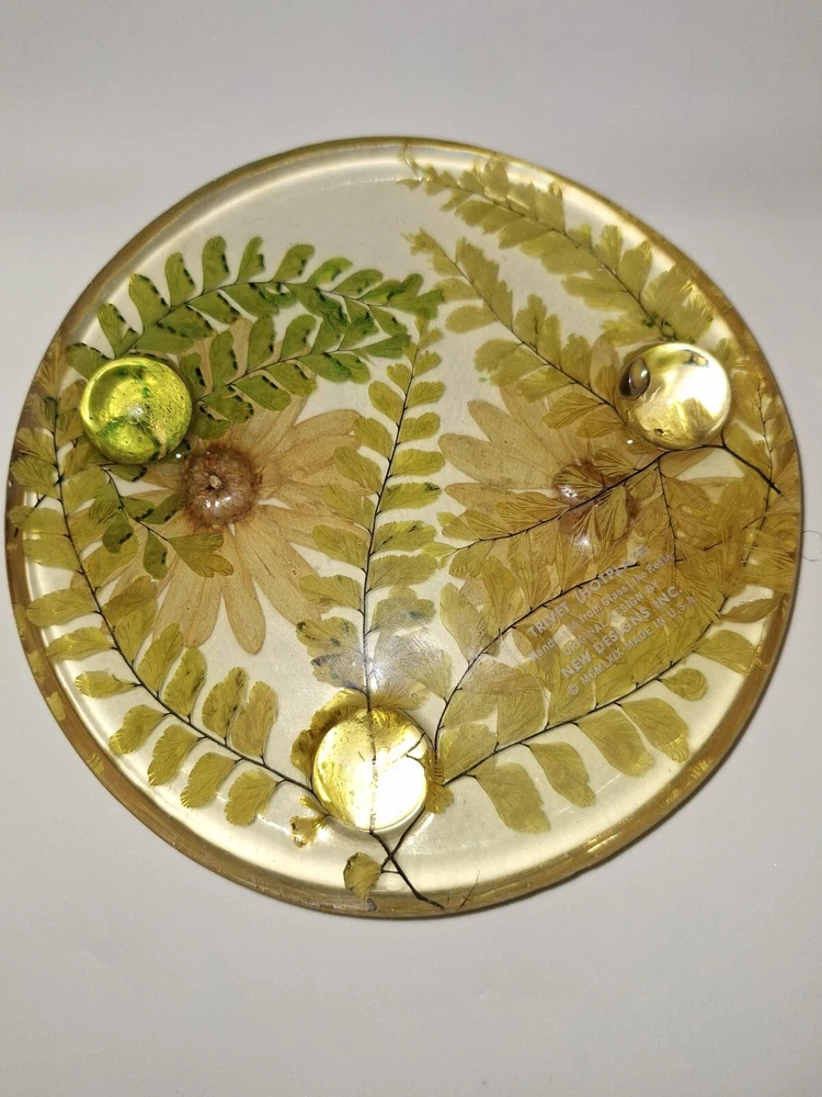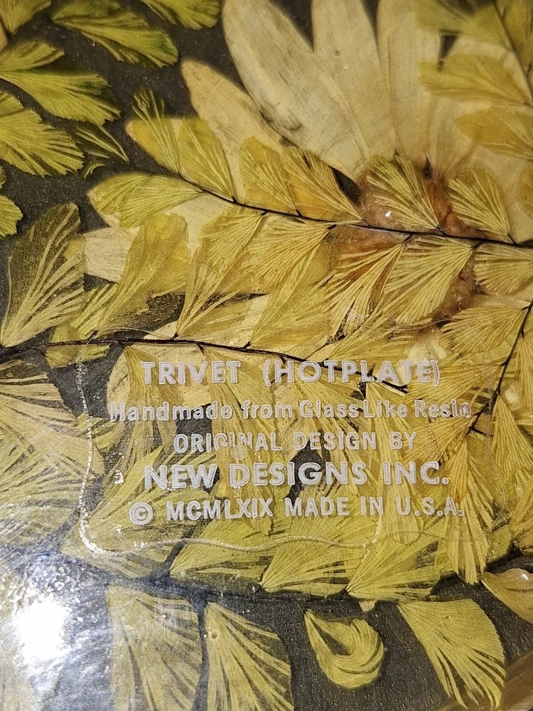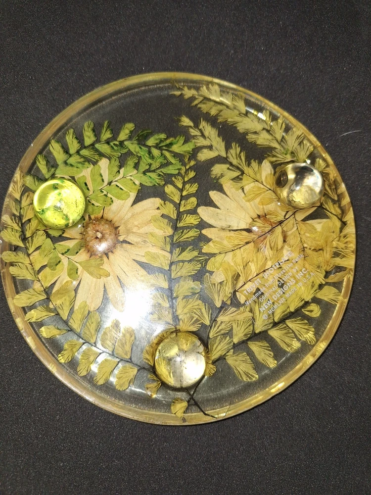 Enhance your kitchen decor with a touch of retro charm with this vintage Lucite (?) flower trivet. The vibrant daisies and the round shape make it an attractive addition to any table setting. Measuring 5.5 inches in diameter, it's a small yet striking piece that's perfect for all occasions.Crafted in 1969 by New Designs Inc, this original, unboxed trivet embodies the style of the 1960s. It's handmade, hand wash only, and boasts a timeless flower theme. This American-made treasure is a testament to the craftsmanship of the era and a delightful find for collectors and retro enthusiasts alike.