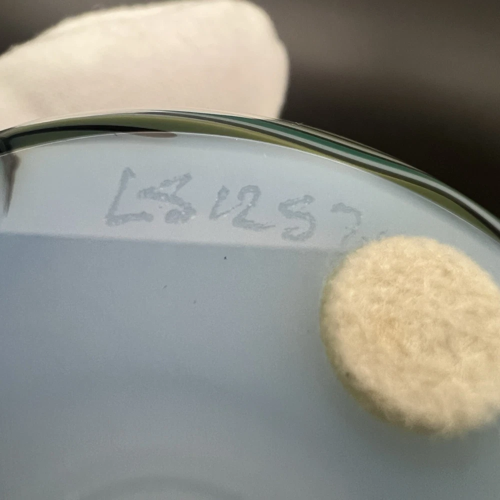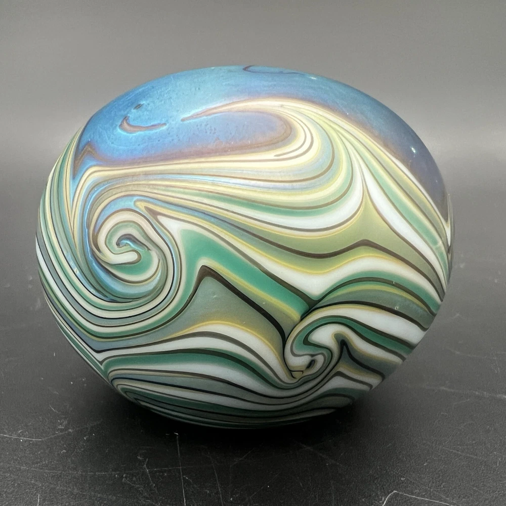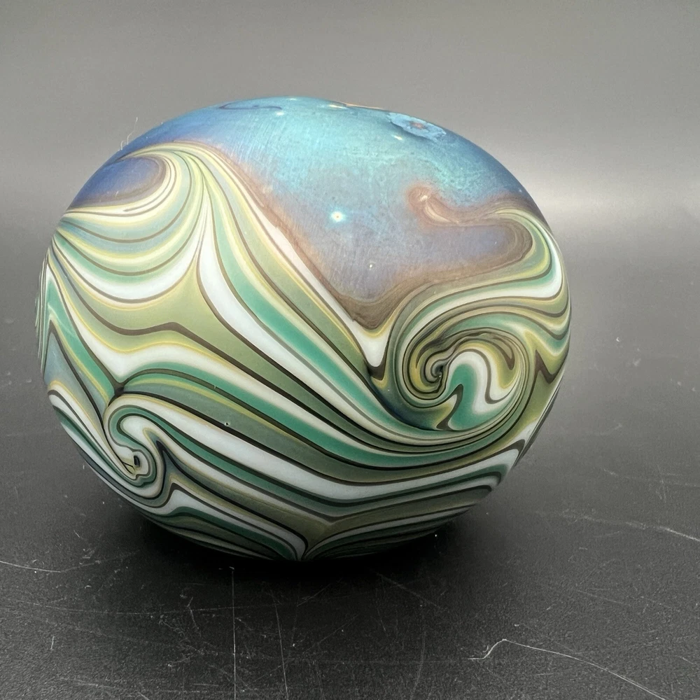 Signed Lundberg Studios art glass paperweight features an orange and purple butterfly with red stars above a swirling green and cream colored sea. 3”x2.25”