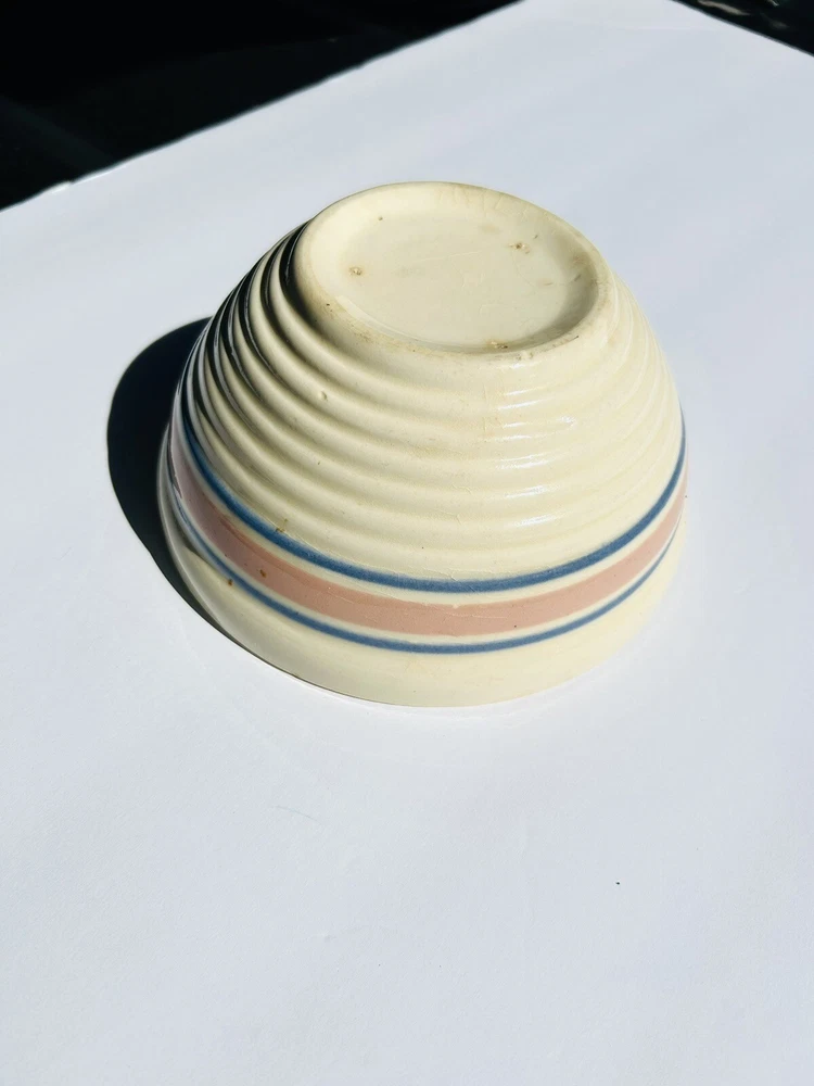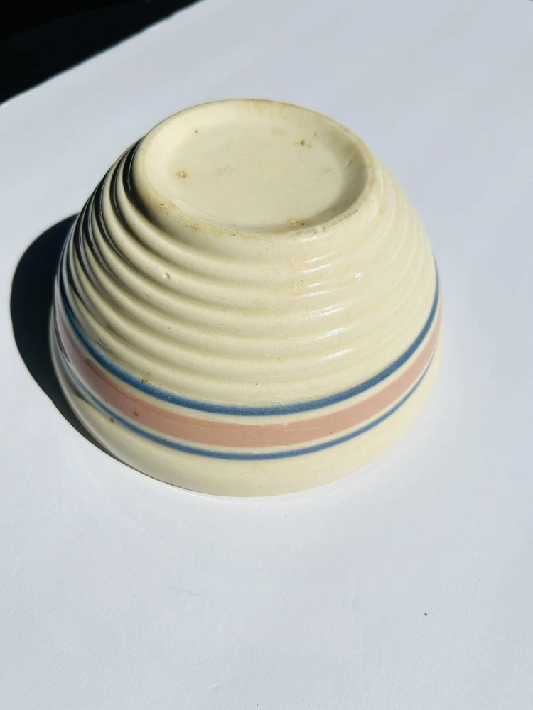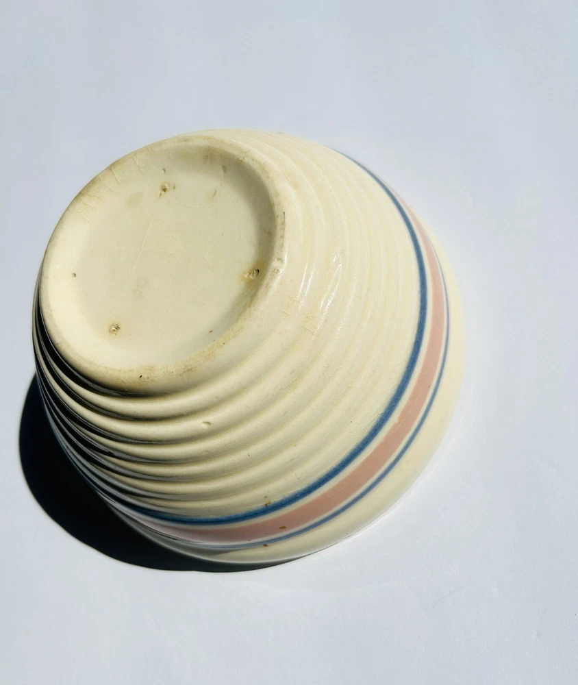 This vintage MCCOY pottery bowl is a beautiful addition to any collection. The charming pink and blue stripes add a touch of country charm to your home decor. Made of high-quality ceramic, this bowl is sturdy and durable. The round shape makes it perfect for serving your favorite soups, salads, or snacks. The McCoy brand is renowned for its quality and attention to detail. This bowl was crafted with a pottery production technique in the United States in the 1940s. Its vintage style and timeless design make it a wonderful gift for collectors and enthusiasts alike. Add this unique piece to your kitchen or dining room and enjoy its beauty and functionality for years to come. 2.14.24