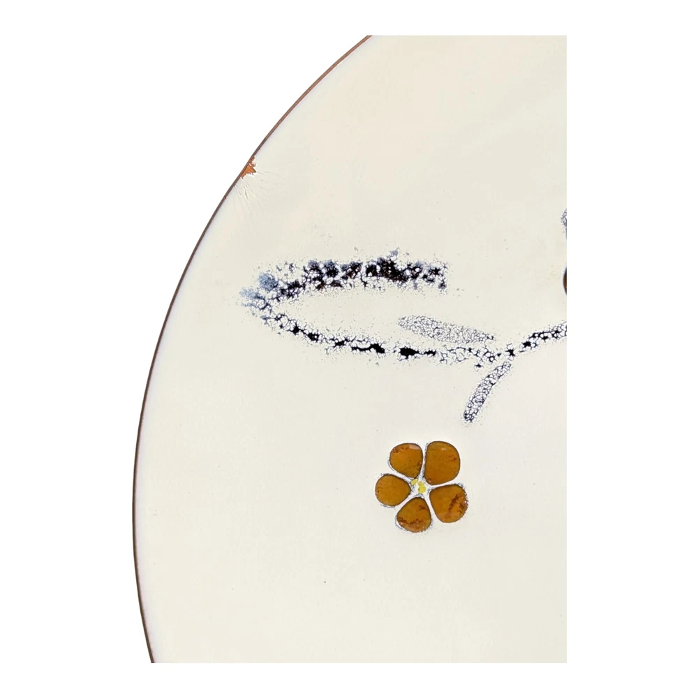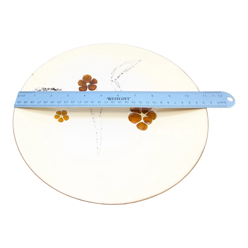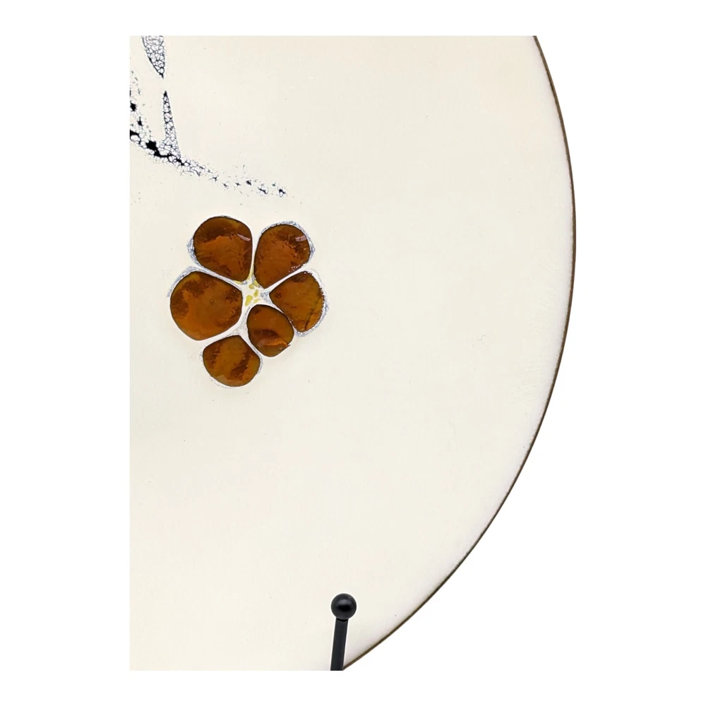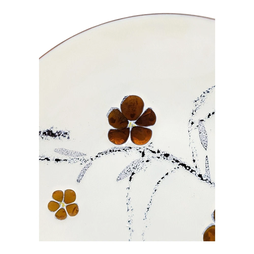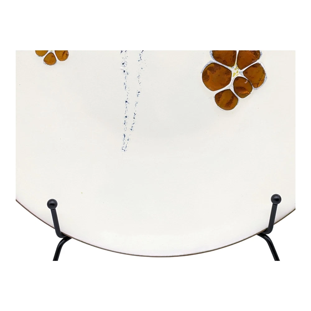 Vintage MCM Bovano Copper Plate with Amber Flowers and Abstract Blue Leaves. This gorgeous plate features amber flowers with blue abstract leaves. This does have a chip on the front and some craving around parts of the rim. The back has scratches from use, slight chipping on edge and has its original sticker . Approximate measurements: 11" dia 1" h STAND NOT INCLUDED