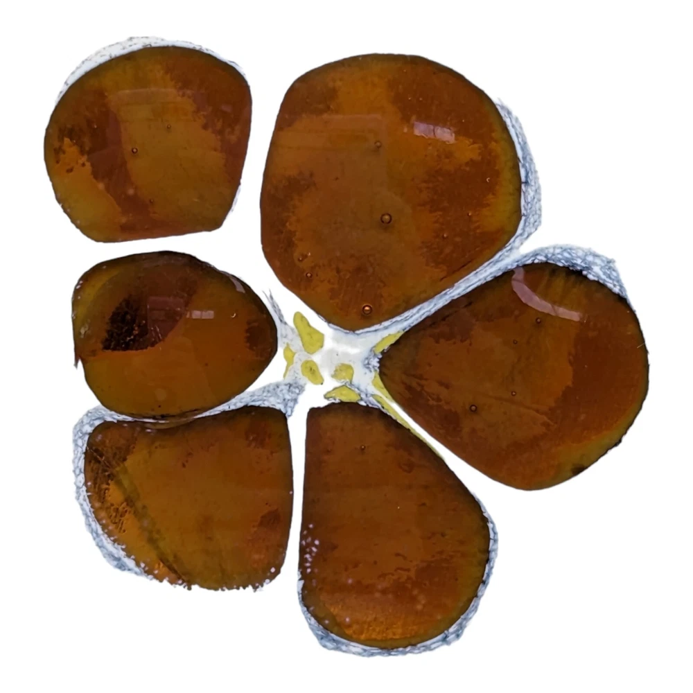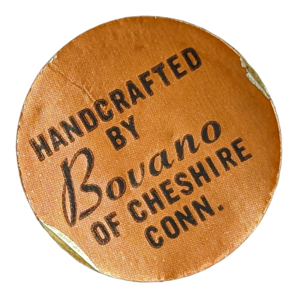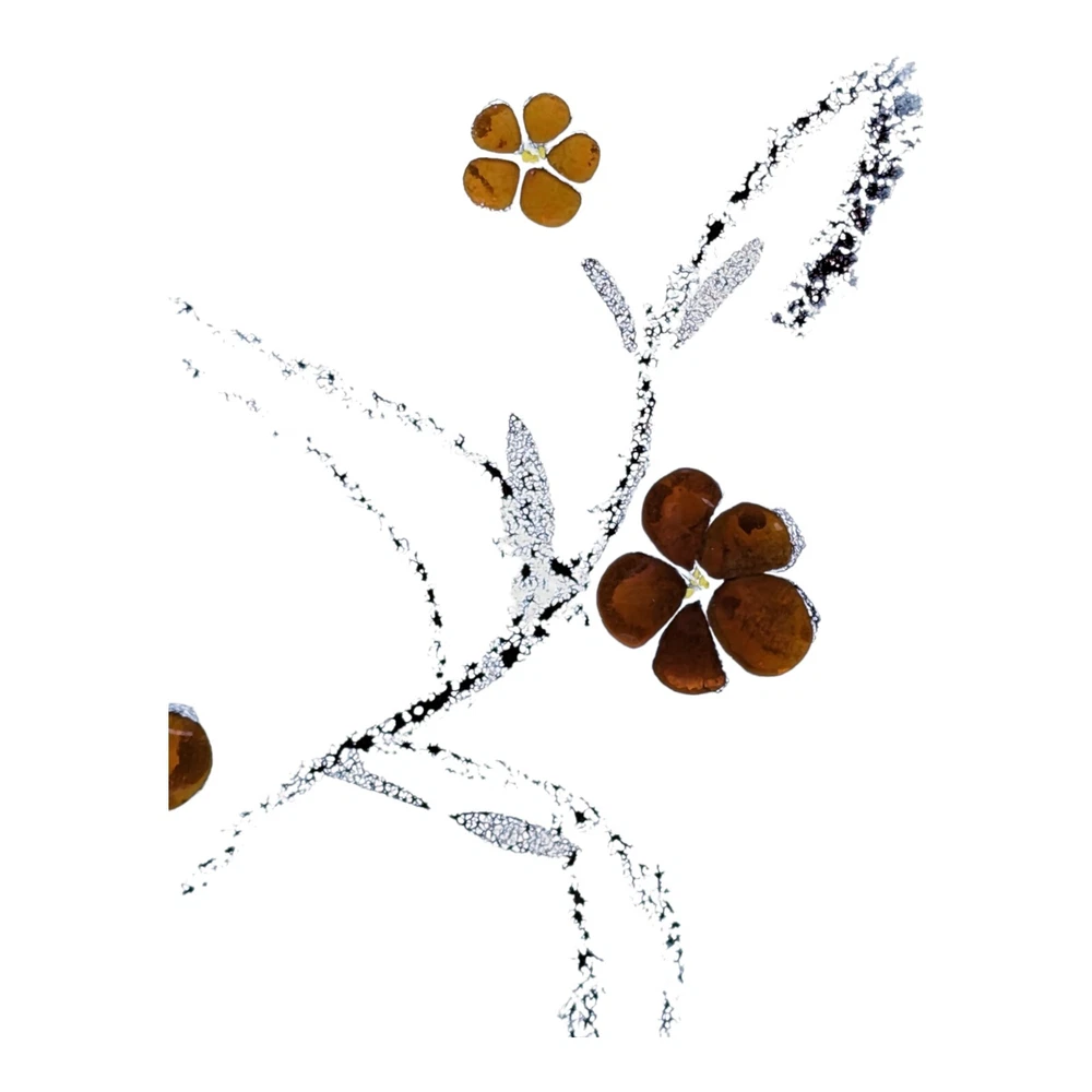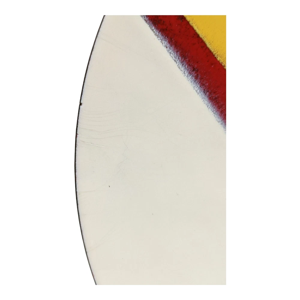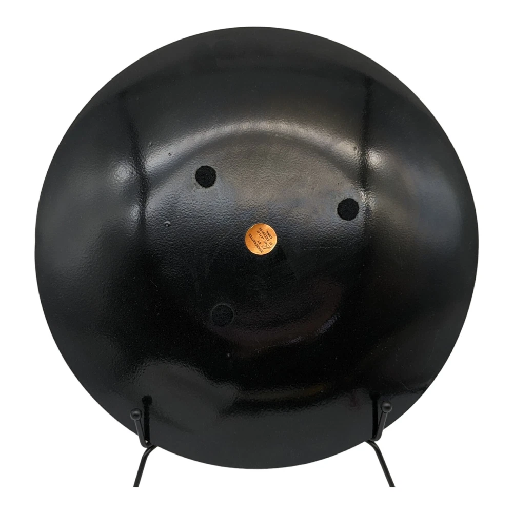 Vintage MCM Bovano Copper Plate with Amber Flowers and Abstract Blue Leaves. This gorgeous plate features amber flowers with blue abstract leaves. This does have a chip on the front and some craving around parts of the rim. The back has scratches from use, slight chipping on edge and has its original sticker . Approximate measurements: 11" dia 1" h STAND NOT INCLUDED