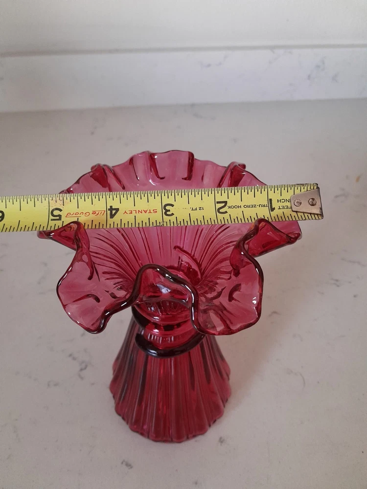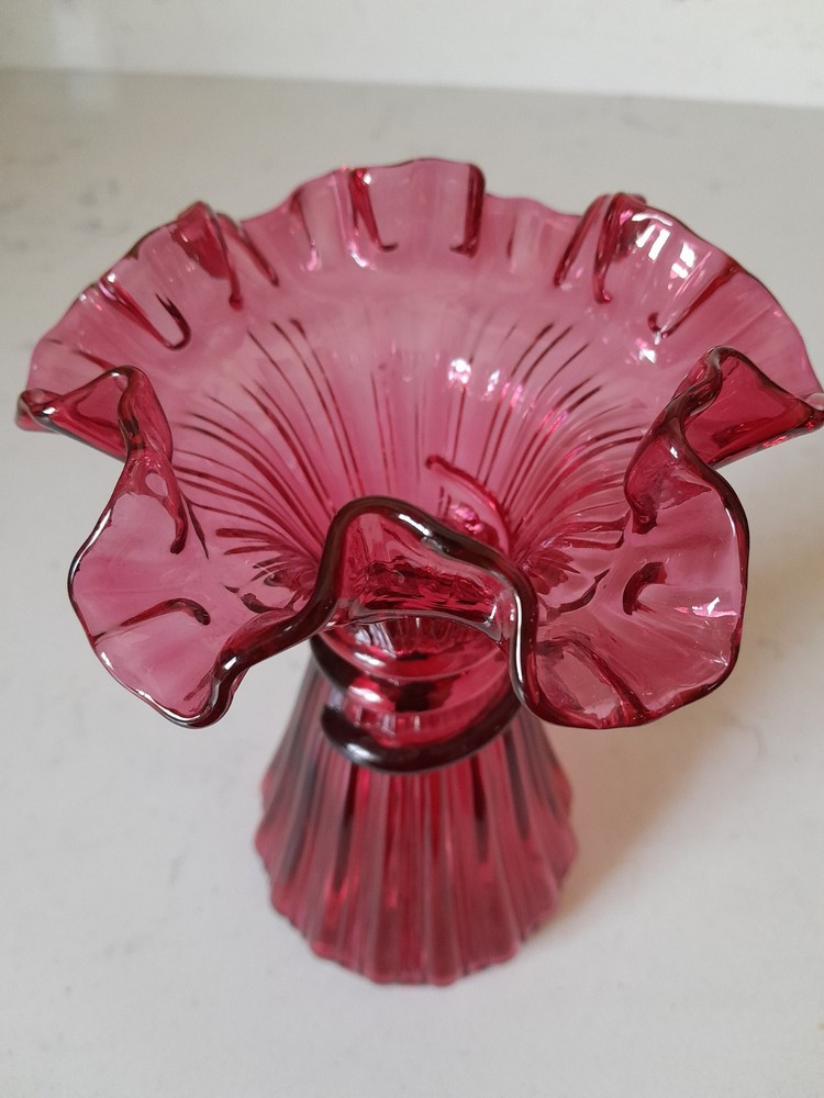 This is a vintage Mid-Century Modern Fenton art glass vase in cranberry red with a ruffled edge. The vase measures 7 1/4 inches in height and features a wheat pattern. It is made of glass in a studio crafted production style, typical of Fenton. This piece would be a stunning addition to any glassware collection, especially for those with a love for vintage art glass.
