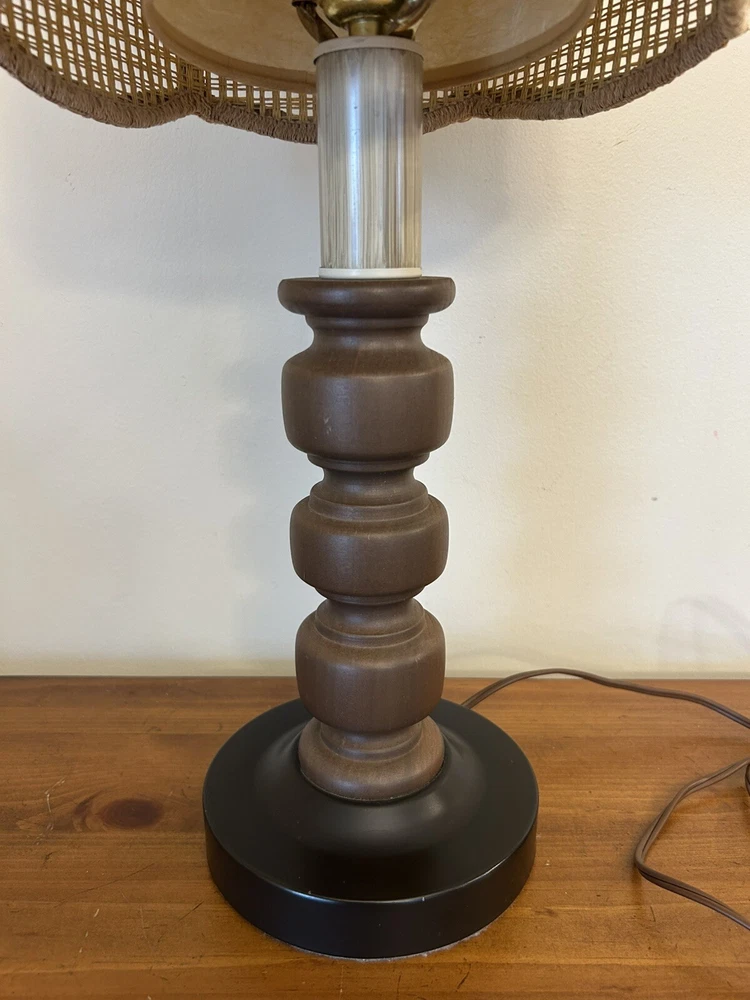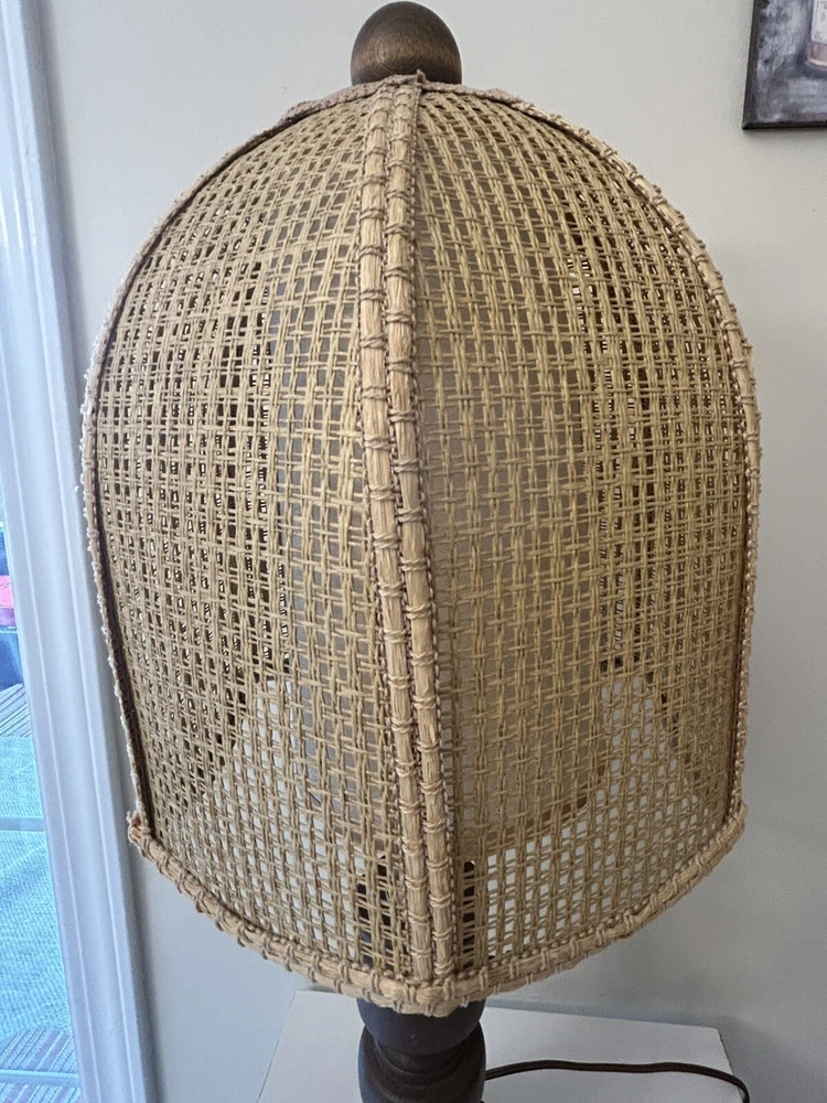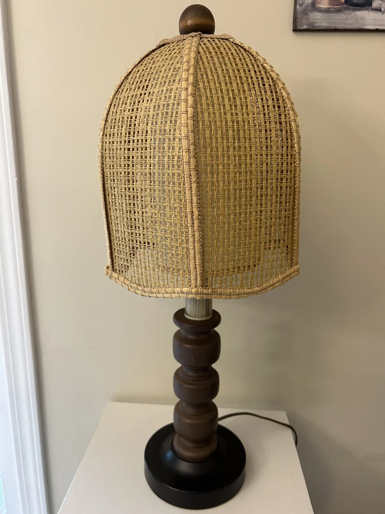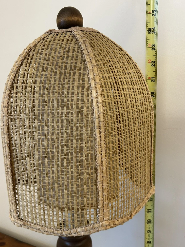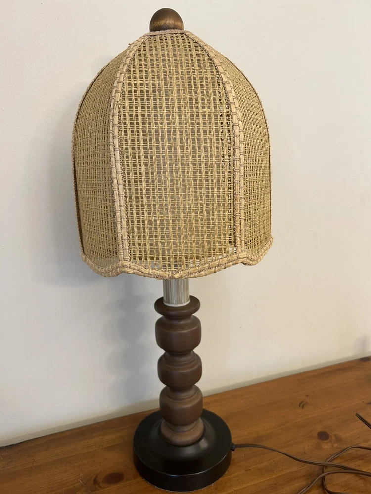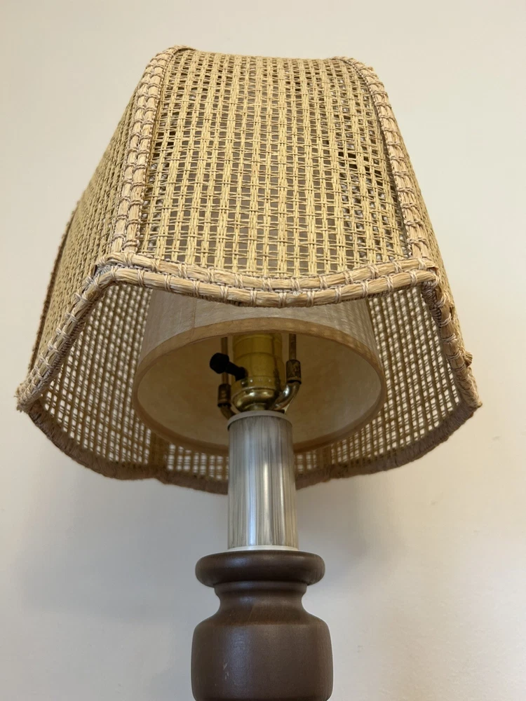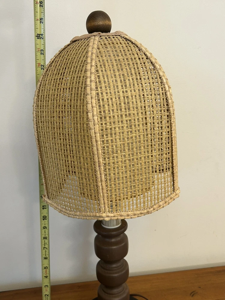 Beautiful Vintage MCM Rattan Wicker & Fiberglass Double Drum Table Lamp Light 25”H Retro Nice vintage condition- refer to pics Light bulb not included May ship in 2 boxes not to damage lampshades